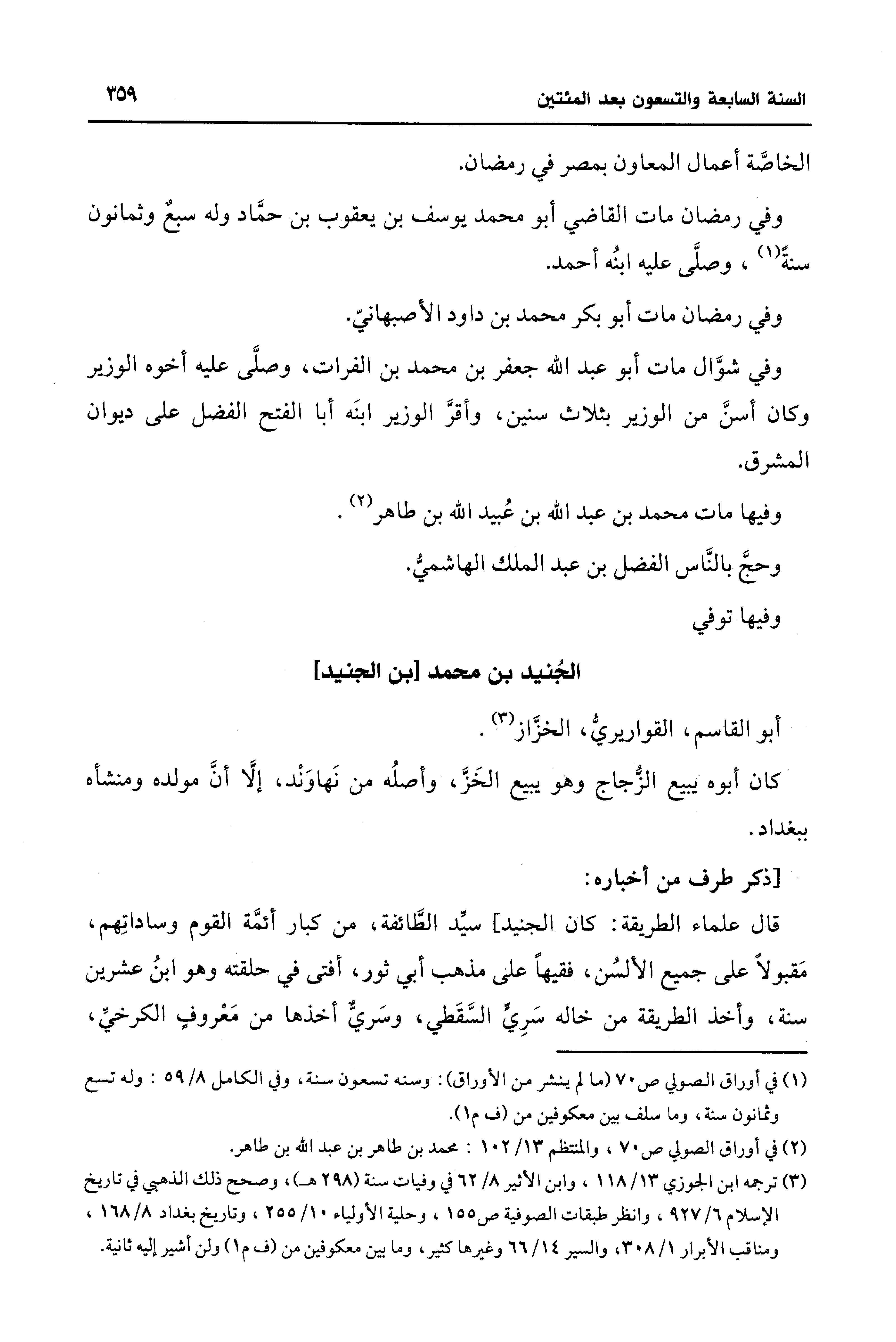 (¬3) ترجمه ابن الجوزي 13/ 118، وابن الأثير 8/ 62 في وفيات سنة (298 هـ)، وصحح ذلك الذهبي في تاريخ الإسلام 6/ 927، وانظر طبقات الصوفية ص 155، وحلية الأولياء 10/ 255، وتاريخ بغداد 8/ 168، ومناقب الأبرار 1/ 308، والسير 14/ 66 وغيرها كثير، وما بين معكوفين من (ف م 1) ولن أشير إليه ثانية.