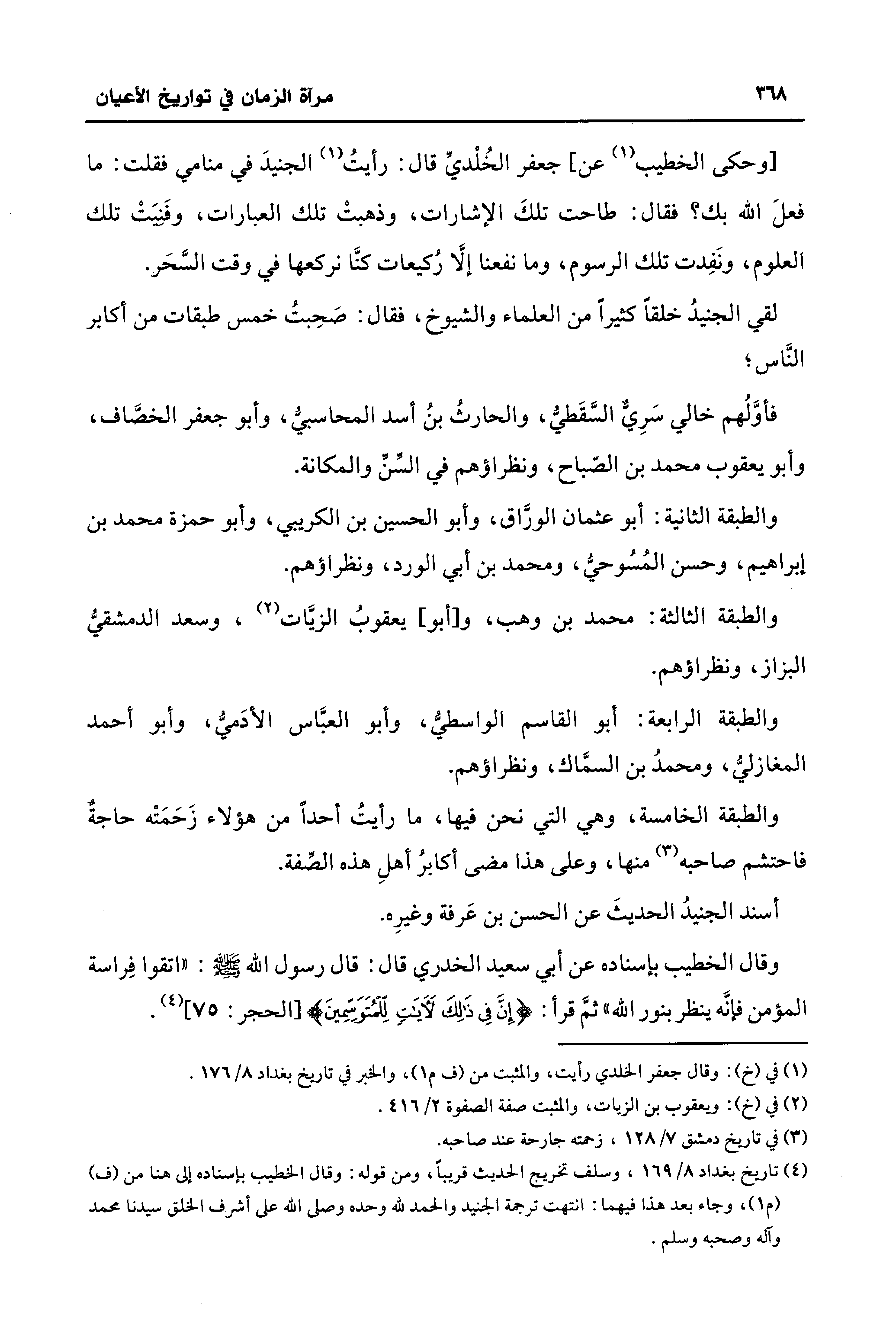 (¬4) تاريخ بغداد 8/ 169، وسلف تخريج الحديث قريبًا، ومن قوله: وقال الخطيب بإسناده إلى هنا من (ف) (م 1)، وجاء بعد هذا فيهما: انتهت ترجمة الجنيد والحمد لله وحده وصلى الله على أشرف الخلق سيدنا محمد وآله وصحبه وسلم.