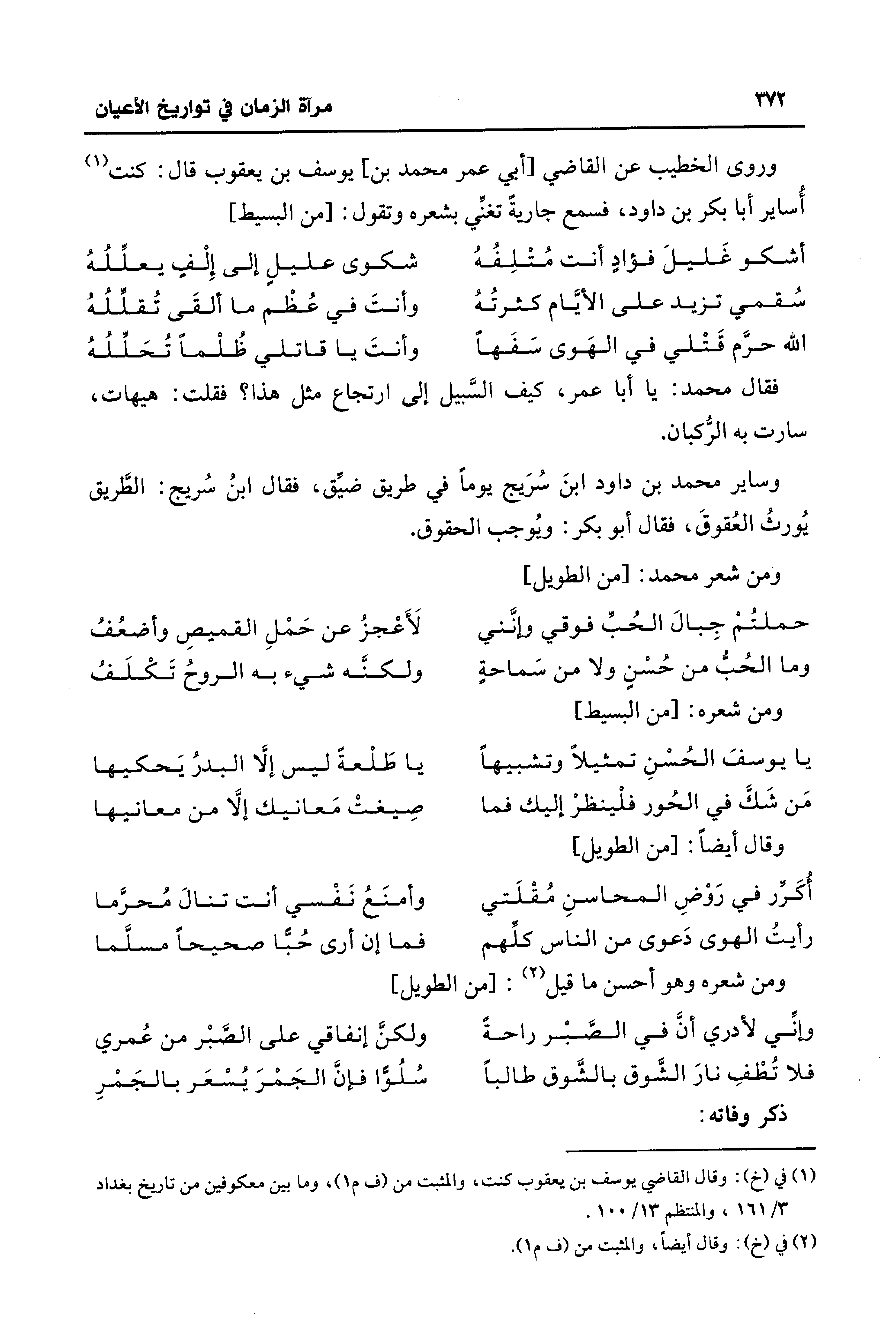 وروى الخطيب عن القاضي [أبي عمر محمد بن] يوسف بن يعقوب قال: كنت (¬1) أُساير أبا بكر بن داود، فسمع جاريةً تغنِّي بشعره وتقول: [من البسيط]