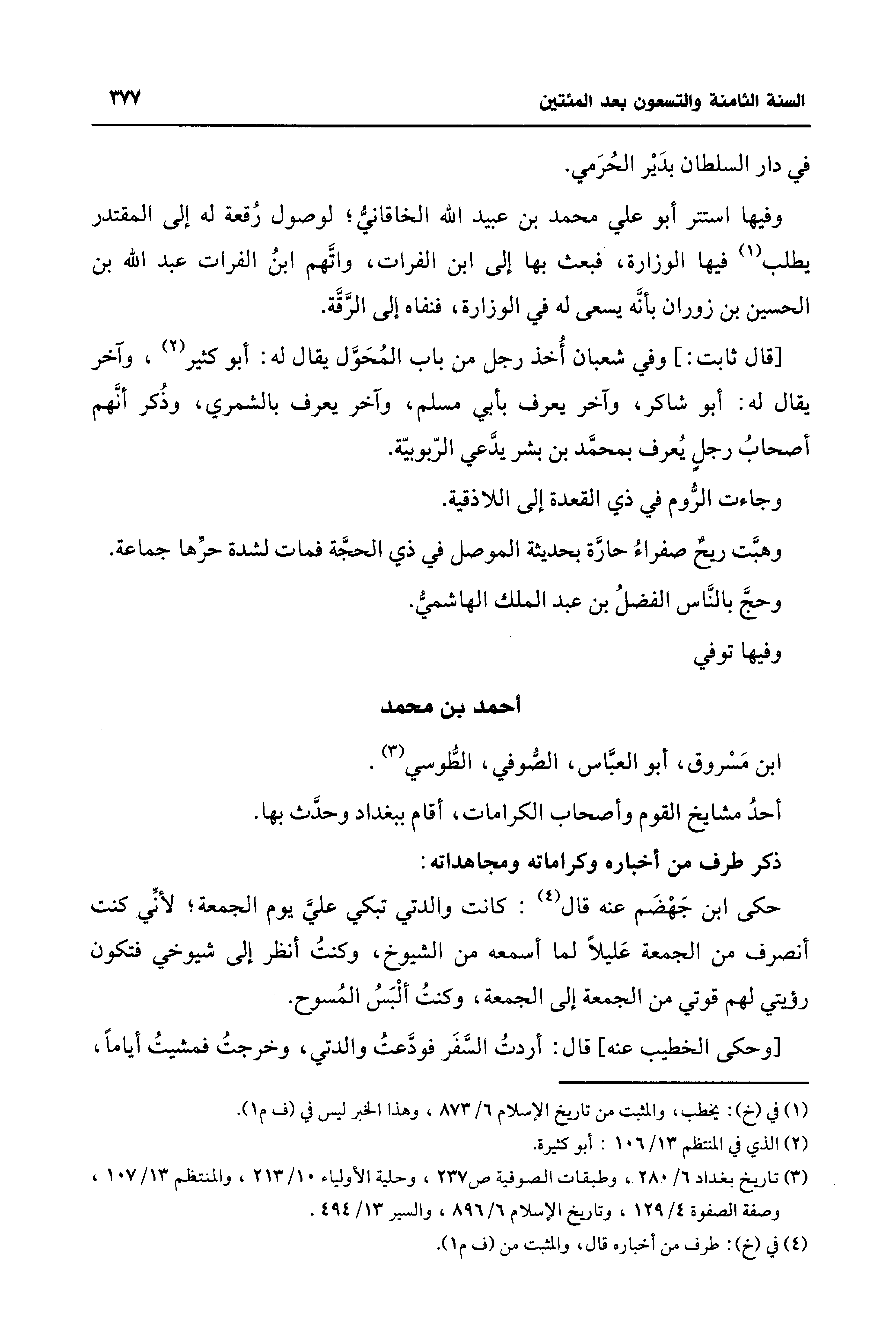 (¬3) تاريخ بغداد 6/ 280، وطبقات الصوفية ص 237، وحلية الأولياء 10/ 213، والمنتظم 13/ 107، وصفة الصفوة 4/ 129، وتاريخ الإسلام 6/ 896، والسير 13/ 494.