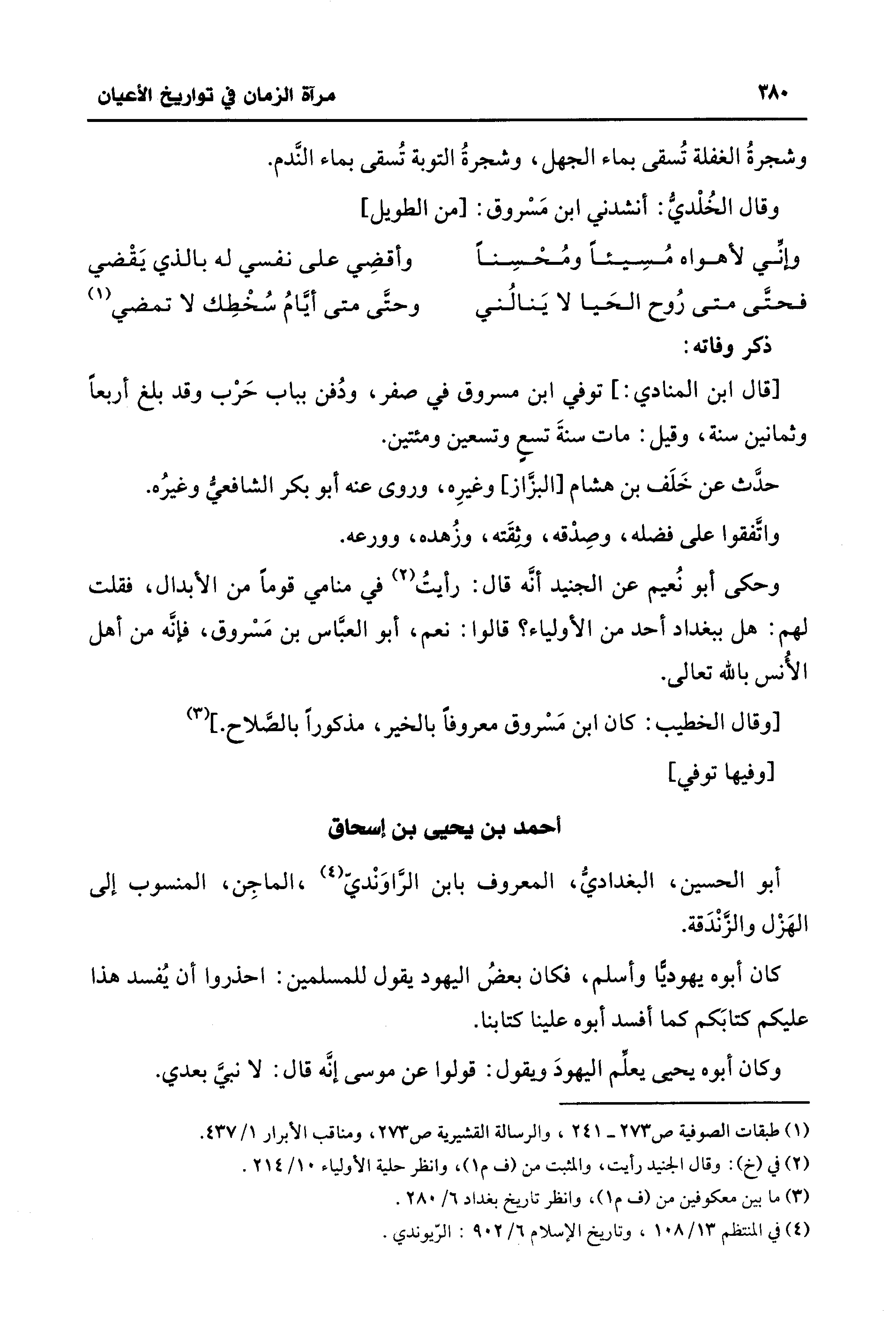 وحكى أبو نُعيم عن الجنيد أنَّه قال: رأيتُ (¬2) في منامي قومًا من الأبدال، فقلت لهم: هل ببغداد أحد من الأولياء؛ قالوا: نعم، أبو العبَّاس بن مَسْروق، فإنَّه من أهل الأُنس بالله تعالى.