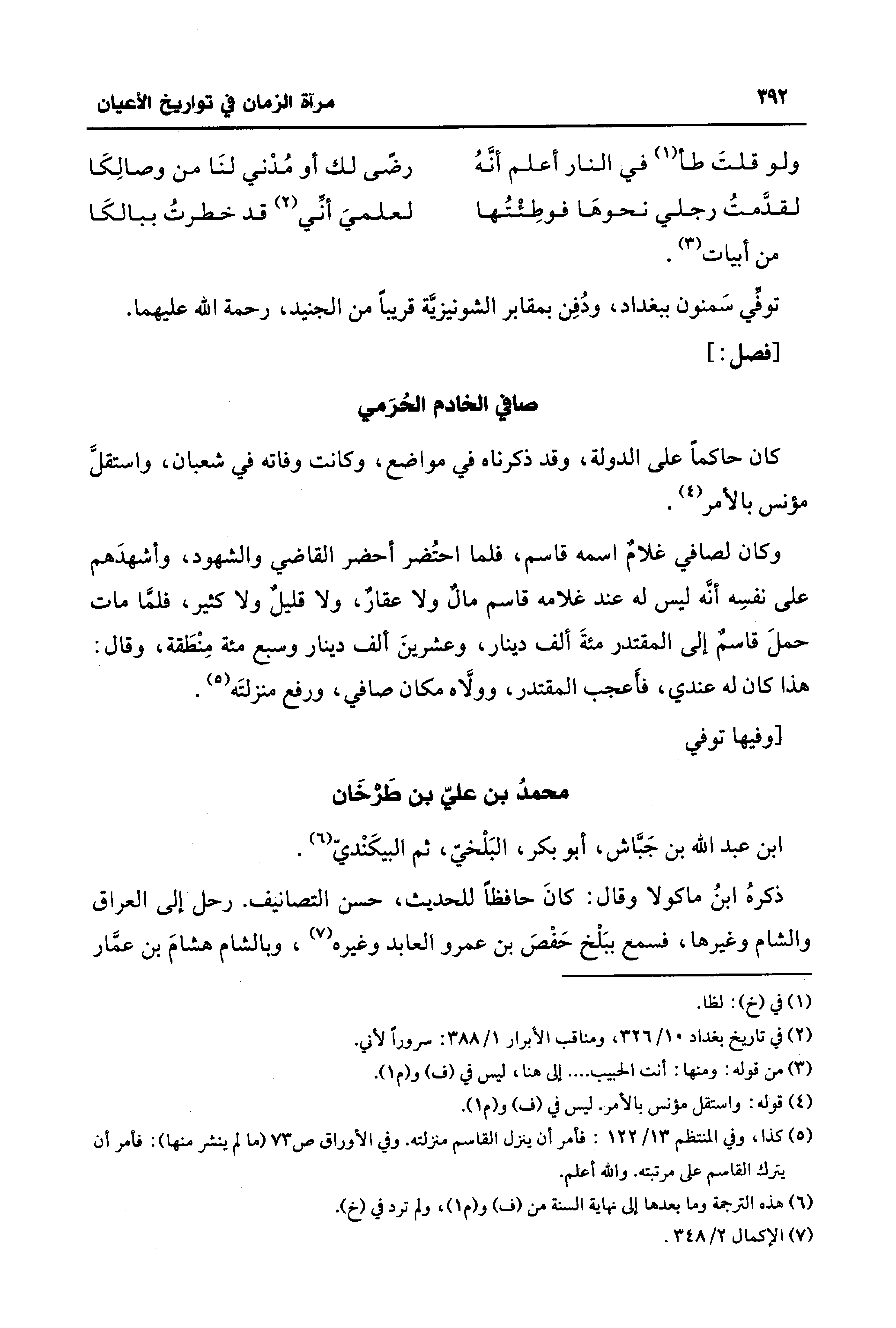 وكان لصافي غلامٌ اسمه قاسم، فلما احتُضر أحضر القاضي والشهود، وأشهدَهم على نفسِه أنَّه ليس له عند غلامه قاسم مالٌ ولا عقارٌ، ولا قليل ولا كثير، فلمَّا مات حملَ قاسمٌ إلى المقتدر مئةَ ألف دينار، وعشرينَ ألف دينار وسبع مئة مِنْطَقة، وقال: هذا كان له عندي، فاعجب المقتدر، وولَّاه مكان صافي، ورفع منزلتَه (¬5).