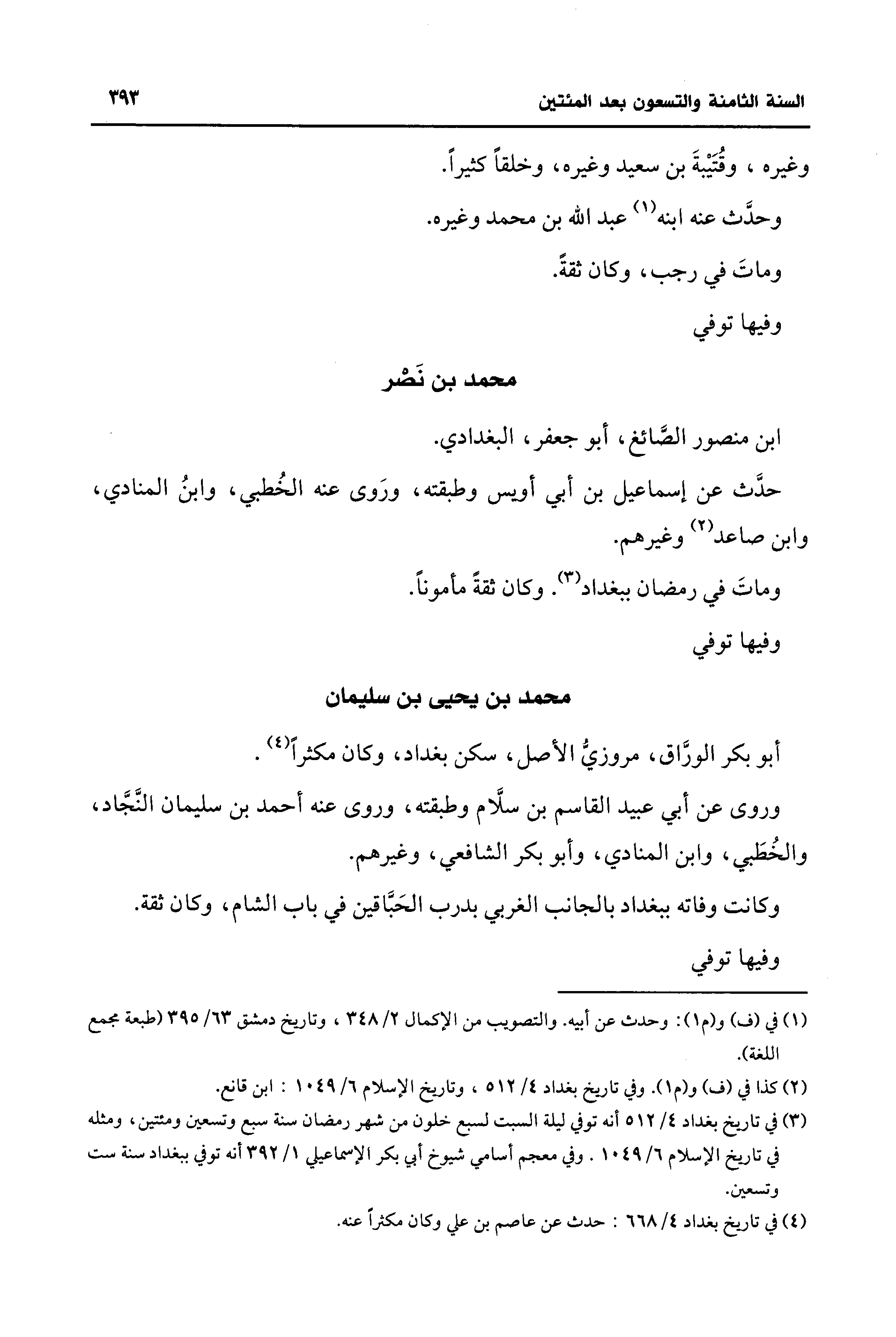 (¬3) في تاريخ بغداد 4/ 512 أنه توفي ليلة السبت لسبع خلون من شهر رمضان سنة سبع وتسعين ومئتين، ومثله في تاريخ الإسلام 6/ 1049. وفي معجم أسامي شيوخ أي بكر الإسماعيلي 1/ 392 أنه توفي ببغداد سنة ست وتسعين.