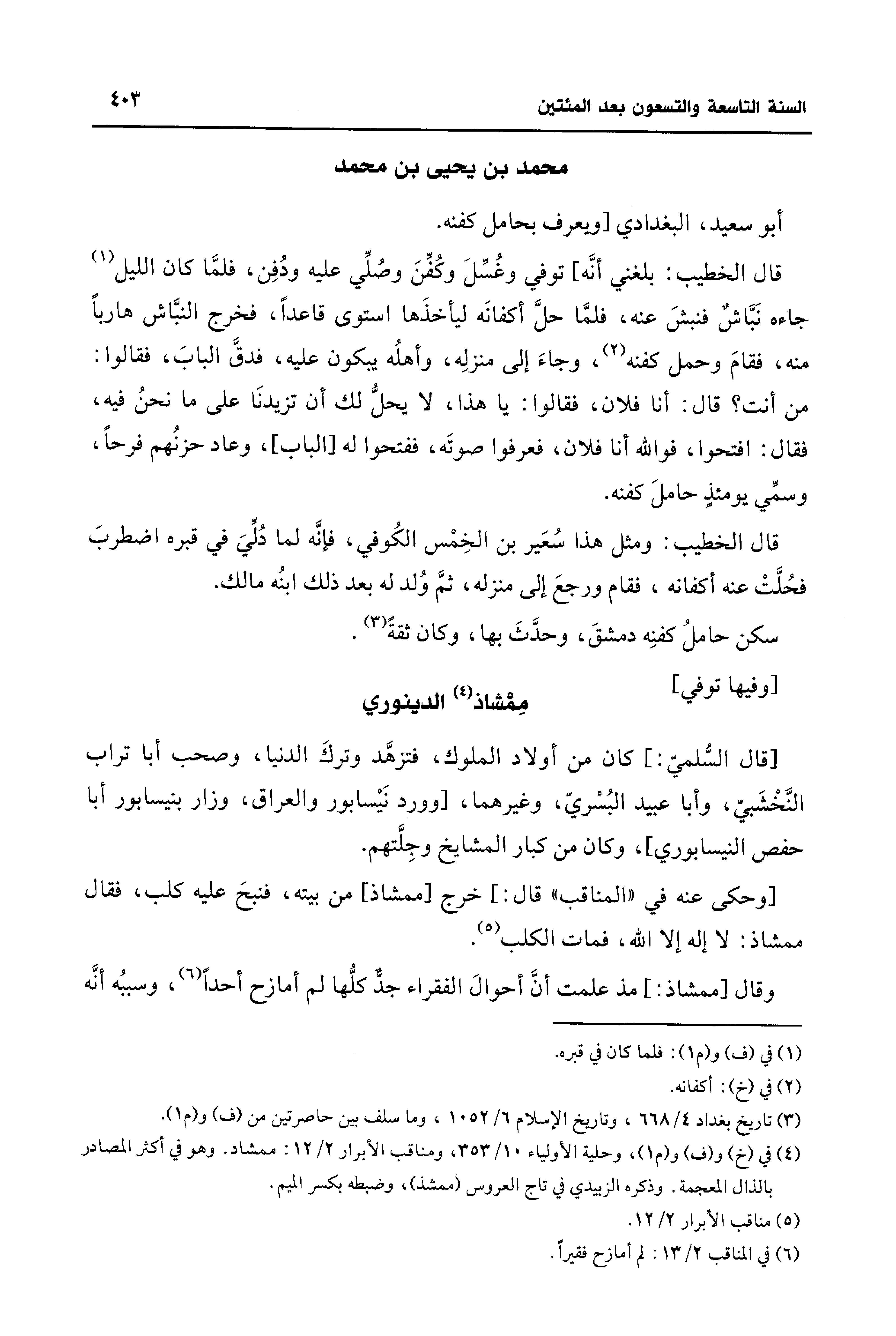 (¬4) في (خ) و (ف) و (م 1)، وحلية الأولياء 10/ 353، ومناقب الأبرار 2/ 12: ممشاد. وهو في أكثر المصادر بالذال المعجمة. وذكره الزبيدي في تاج العروس (ممشذ)، وضبطه بكسر الميم.
