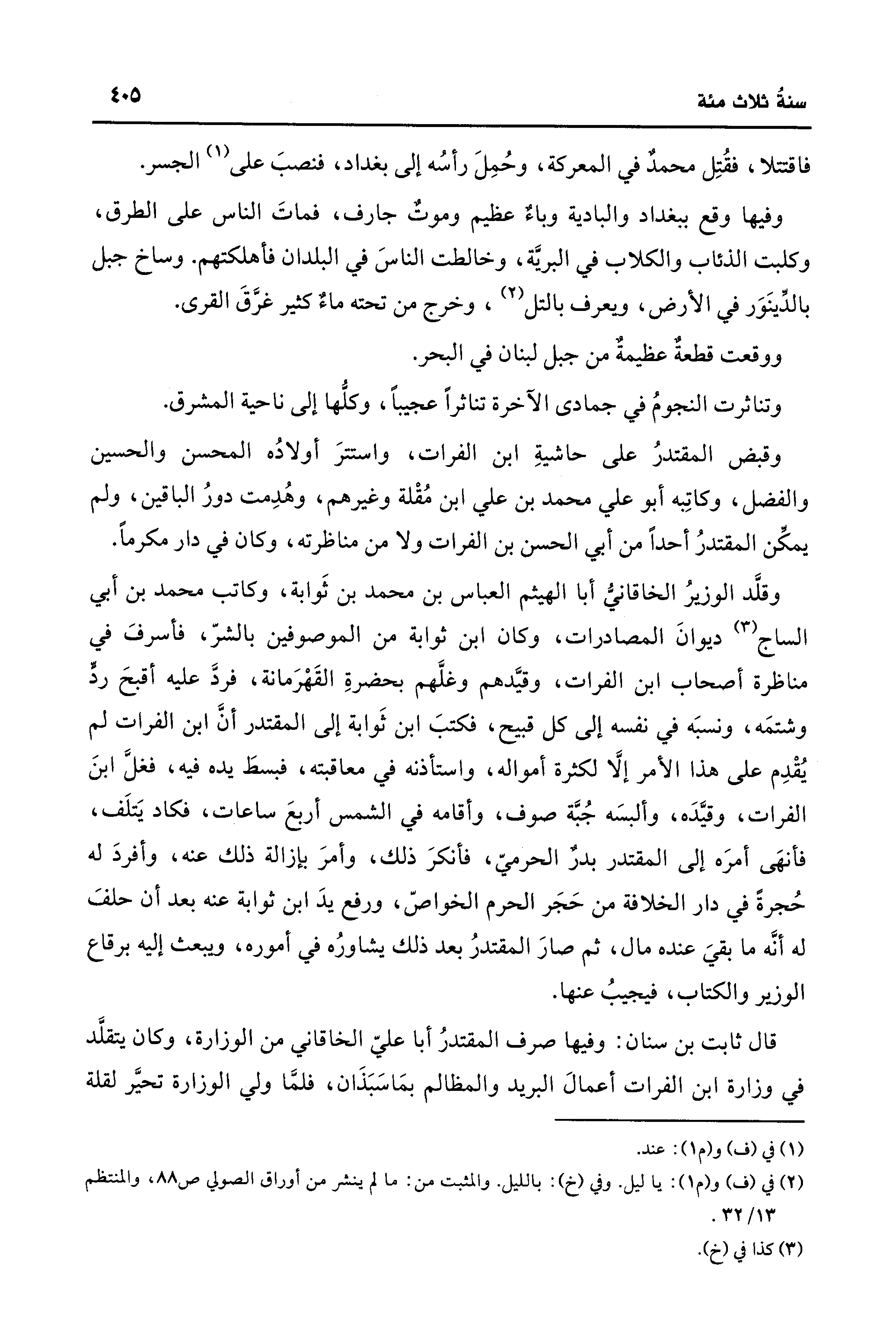 وقلَّد الوزيرُ الخاقانيُّ أبا الهيثم العباس بن محمد بن ثَوابة، وكاتب محمد بن أبي الساج (¬3) ديوانَ المصادرات، وكان ابن ثوابة من الموصوفين بالشرّ، فأسرفَ في مناظرة أصحاب ابن الفرات، وقيَّدهم وغلَّهم بحضرةِ القَهْرَمانة، فردَّ عليه أقبحَ ردِّ وشتمَه، ونسبَه في نفسه إلى كل قبيح، فكتبَ ابن ثَوابة إلى المقتدر أنَّ ابن الفرات لم يُقْدِم على هذا الأمر إلا لكثرة أمواله، واستأذنه في معاقبته، فبسطَ يده فيه، فغل ابنَ الفرات، وقيَّدَه، وألبسَه جُبَّة صوف، وأقدمه في الشمس أربعَ ساعات، فكاد يَتلَف، فأنهَى أمرَه إلى المقتدر بدرٌ الحرميّ، فأنكرَ ذلك، وأمرَ بإزالة ذلك عنه، وأفردَ له حُجرةً في دار الخلافة من حَجَر الحرم الخواصّ، ورفع يدَ ابن ثوابة عنه بعد أن حلفَ له أنَّه ما بقيَ عنده مال، ثم صارَ المقتدرُ بعد ذلك يشاورُه في أموره، ويبعث إليه برقاع الوزير والكتاب، فيجيبُ عنها.