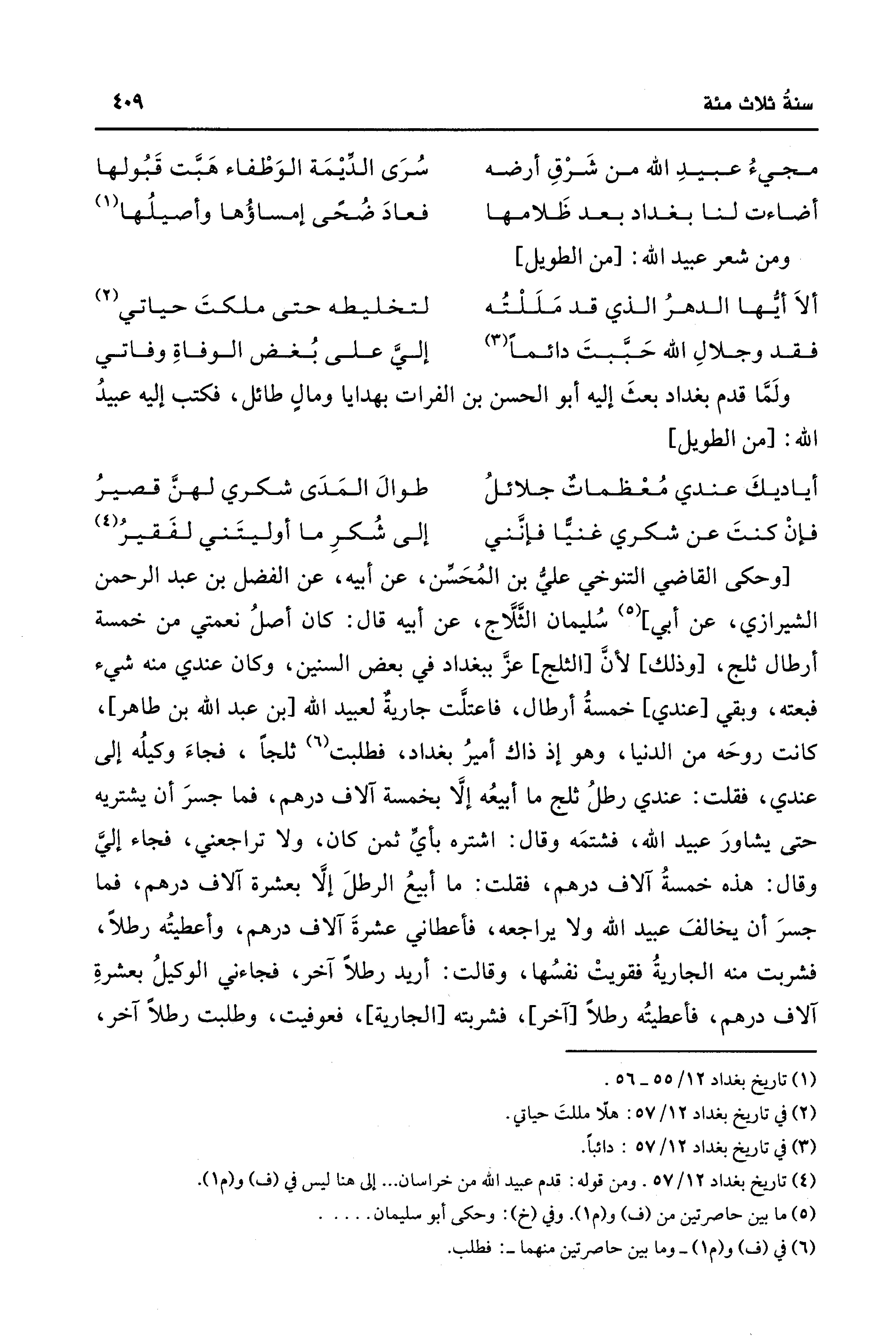 [وحكى القاضي التنوخي علي بن المُحَسِّن، عن أبيه، عن الفضل بن عبد الرحمن الشيرازي، عن أبي] (¬5) سُليمان الثلَّاج، عن أبيه قال: كان أصلُ نعمتي من خمسة أرطال ثلج، [وذلك] لأنَّ [الثلج] عزَّ ببغداد في بعض السنين، وكان عندي منه شيء فبعته، وبقي [عندي] خمسةُ أرطال، فاعتلَّت جارية لعبيد الله [بن عبد الله بن طاهر]، كانت روحَه من الدنيا، وهو إذ ذاك أميرُ بغداد، فطلبت (¬6) ثلجًا، فجاءَ وكيلُه إلى عندي، فقلت: عندي رطلُ ثلج ما أبيعُه إلَّا بخمسة آلاف درهم، فما جسرَ أن يشتريه حتى يشاورَ عبيد الله، فشتمَه وقال: اشتره بأيِّ ثمن كان، ولا تراجعني، فجاء إليَّ وقال: هذه خمسةُ آلاف درهم، فقلت: ما أبيعُ الرطلَ إلَّا بعشرة آلاف درهم، فما جسرَ أن يخالفَ عبيد الله ولا يراجعه، فأعطاني عشرةَ آلاف درهم، وأعطيتُه رطلًا، فشربت منه الجاريةُ فقويتْ نفسُها، وقالت: أريد رطلًا آخر، فجاءني الوكيلُ بعشرةِ آلاف درهم، فأعطيتُه رطلًا [آخر]، فشربته [الجارية]، فعوفيت، وطلبت رطلًا آخر،