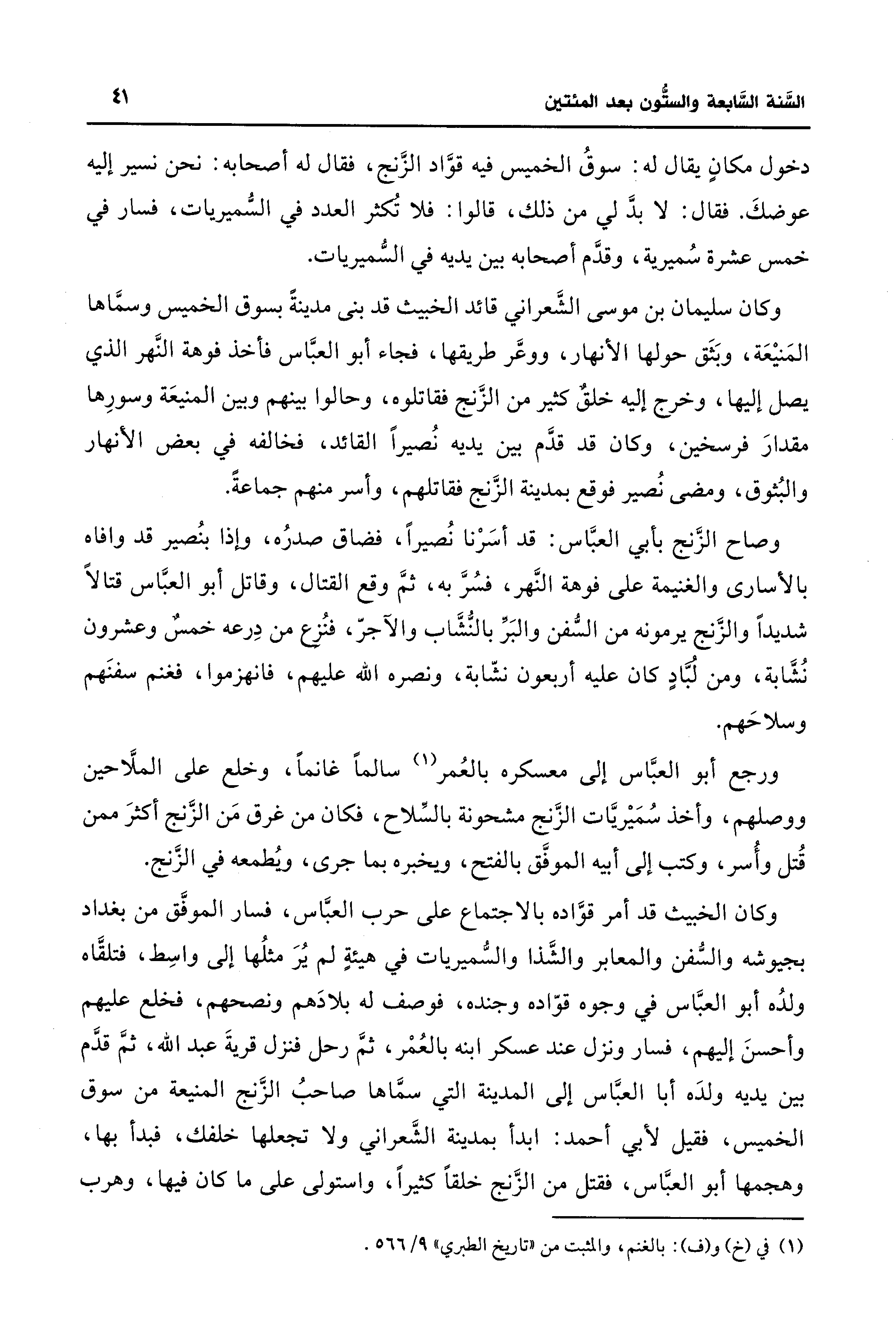وكان سليمان بن موسى الشَّعراني قائد الخبيث قد بنى مدينةً بسوق الخميس وسمَّاها المَنيعَة، وبَثَق حولها الأنهار، ووعَّر طريقها، فجاء أبو العبَّاس فأخذ فوهة النَّهر الذي يصل إليها، وخرج إليه خلقٌ كثير من الزَّنج فقاتلوه، وحالوا بينهم وبين المنيعَة وسورِها مقدارَ فرسخين، وكان قد قدَّم بين يديه نُصيرًا القائد، فخالفه في بعض الأنهار والبُثوق، ومضى نُصير فوقع بمدينة الزَّنج فقاتلهم، وأسر منهم جماعةً.