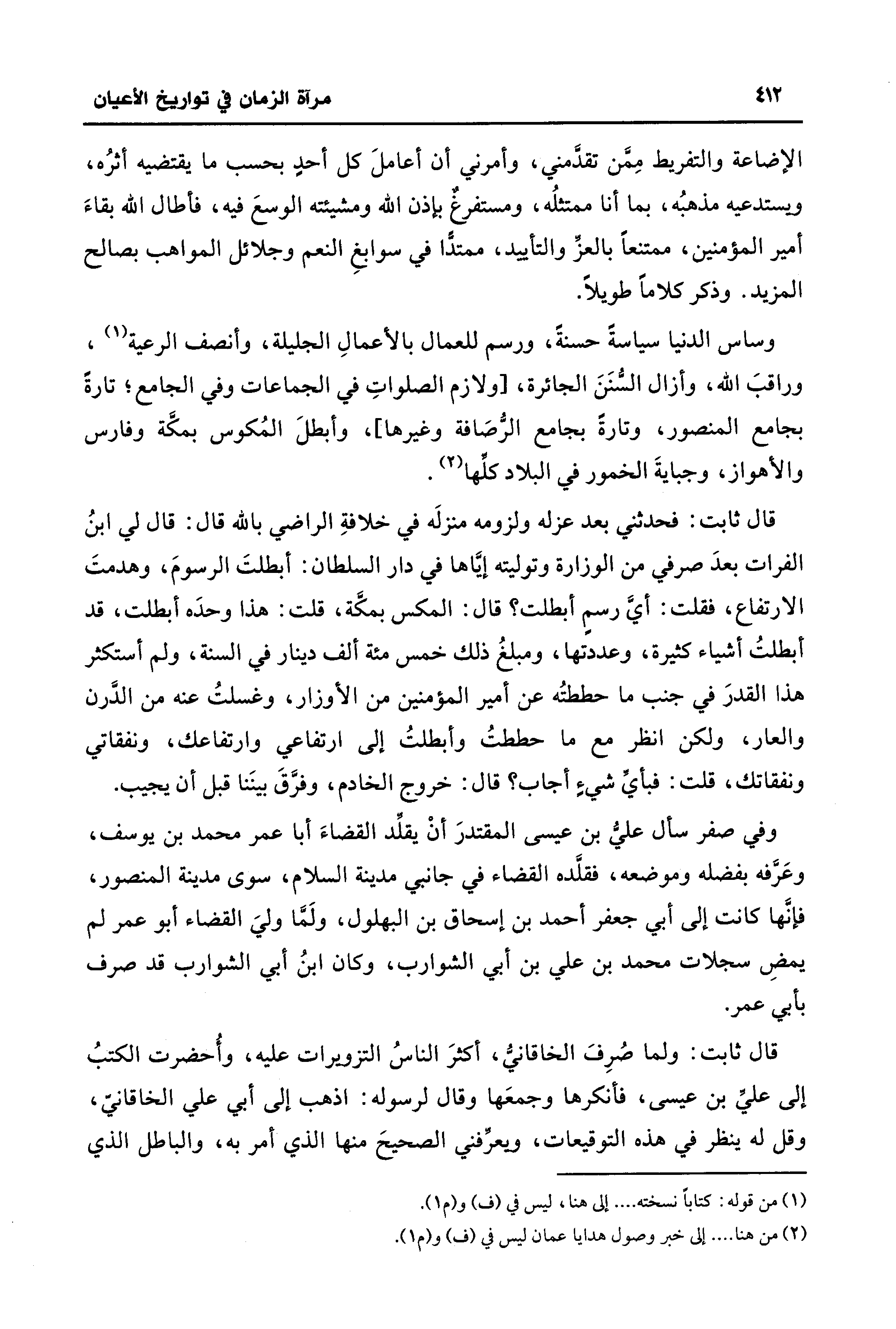 الإضاعة والتفريط مِمَّن تقدَّمني، وأمرني أن أعاملَ كل أحدٍ بحسب ما يقتضيه أثرُه، ويستدعيه مذهبُه، بما أنا ممتثلُه، ومستفرغٌ بإذن الله ومشيئته الوسعَ فيه، فأطال الله بقاءَ أمير المؤمنين، ممتنعًا بالعز والتأييد، ممتدًّا في سوابغِ النعم وجلائل المواهب بصالح المزيد. وذكر كلامًا طويلًا.