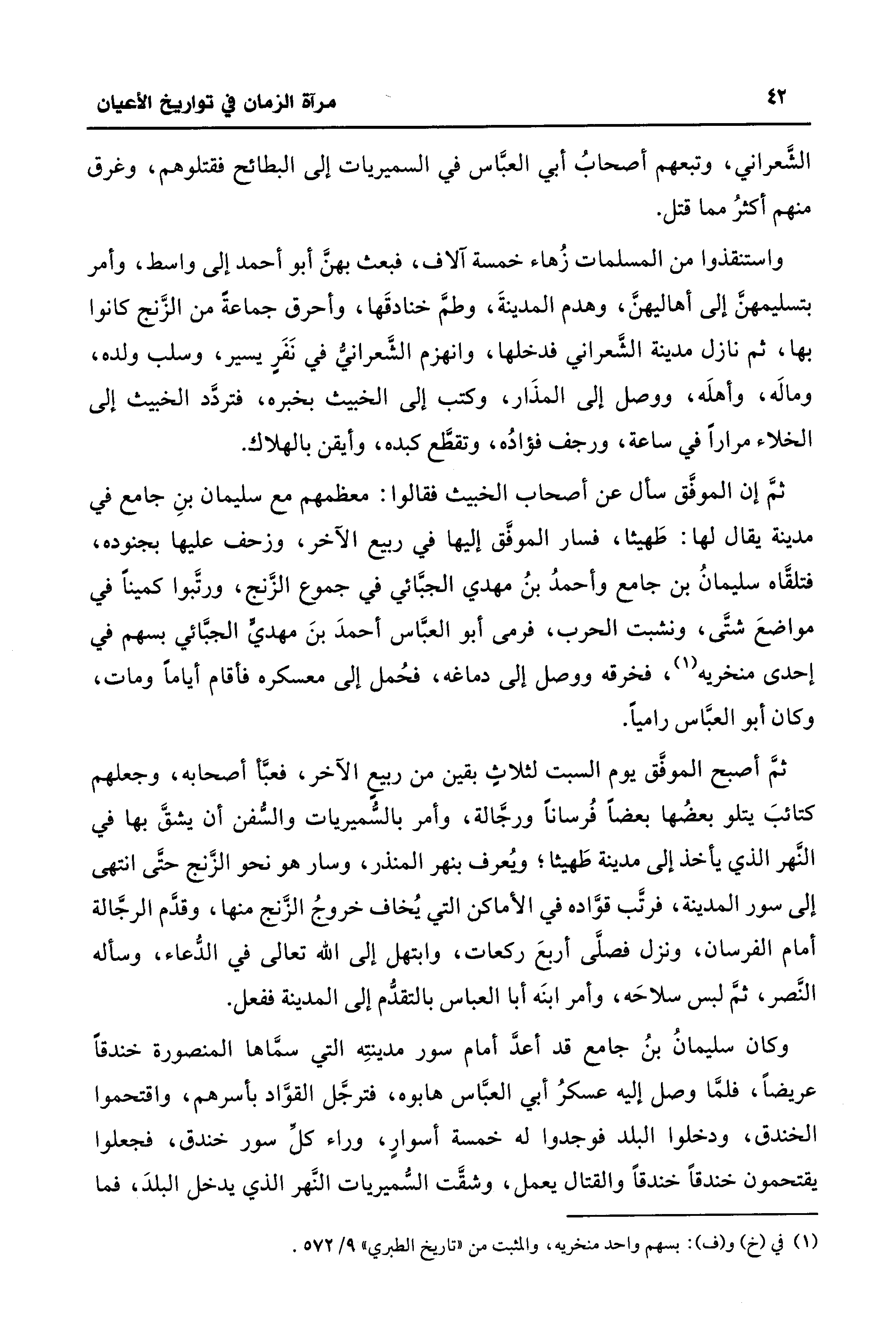 واستنقذوا من المسلمات زُهاء خمسة آلاف، فبعث بهنَّ أبو أحمد إلى واسط، وأمر بتسليمهنَّ إلى أهاليهنَّ، وهدم المدينةَ، وطمَّ خنادقَها، وأحرق جماعةً من الزَّنج كانوا بها، ثم نازل مدينة الشَّعراني فدخلها، وانهزم الشَّعرانى في نَفَرٍ يسير، وسلب ولده، وماله، وأهلَه، ووصل إلى المذَار، وكتب إلى الخبيث بخبره، فتردَّد الخبيث إلى الخلاء مرارًا في ساعة، ورجف فؤادُه، وتقطَّع كبده، وأيقن بالهلاك.