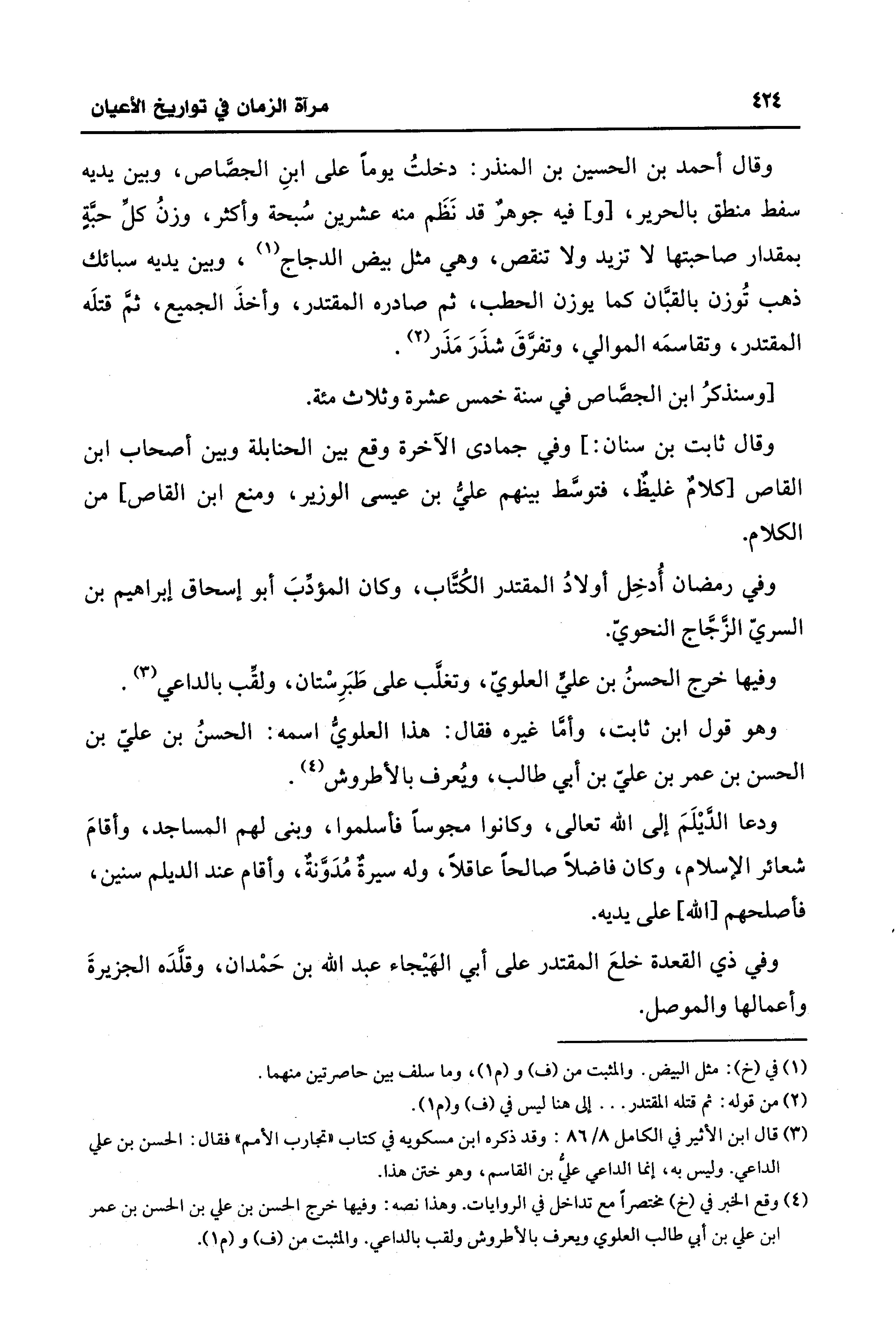 وقال ثابت بن سنان: ] وفي جمادى الآخرة وقع بين الحنابلة وبين أصحاب ابن القاص [كلامٌ غليظٌ، فتوسَّط بينهم عليُّ بن عيسى الوزير، ومنع ابن القاص] من الكلام.