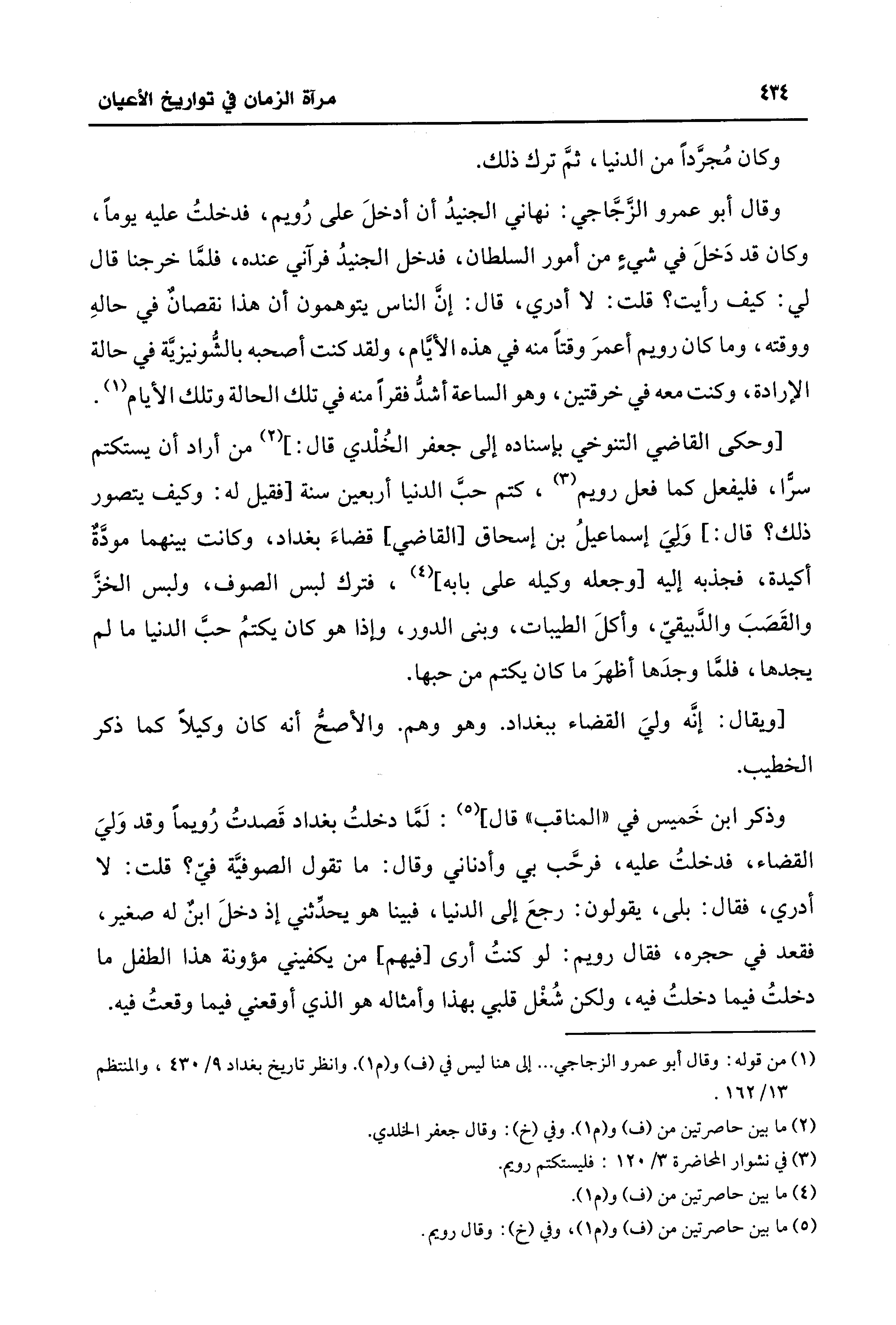 وقال أبو عمرو الزَّجَّاجي: نهاني الجنيدُ أن أدخلَ على رُويم، فدخلتُ عليه يومًا، وكان قد دَخلَ في شيءٍ من أمور السلطان، فدخل الجنيدُ فرآني عنده، فلمَّا خرجنا قال لي: كيف رأيت؟ قلت: لا أدري، قال: إن الناس يتوهمون أن هذا نقصانٌ في حالهِ ووقته، وما كان رويم أعمرَ وقتًا منه في هذه الأيَّام، ولقد كنت أصحبه بالشُّونيزيَّة في حالة الإرادة، وكنت معه في خرقتين، وهو الساعة أشدُّ فقرًا منه في تلك الحالة وتلك الأيام (¬1).
