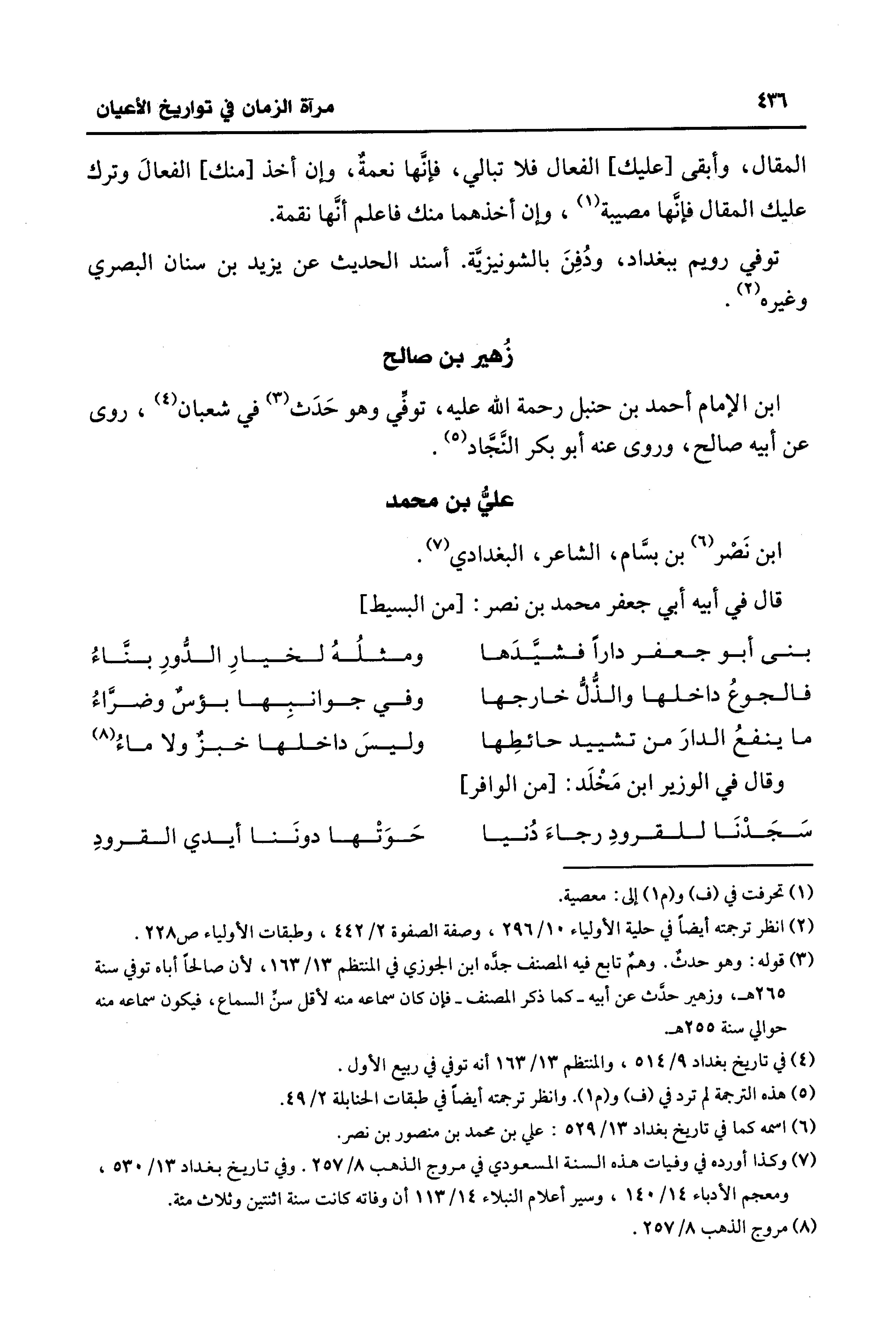 (¬3) قوله: وهو حدثٌ. وهمٌ تابع فيه المصنف جدَّه ابن الجوزي في المنتظم 13/ 163، لأن صالحًا أباه توفي سنة 265 هـ، وزهير حدَّث عن أبيه -كما ذكر المصنف- فإن كان سماعه منه لأقل سنِّ السماع، فيكون سماعه منه حوالي سنة 255 هـ.