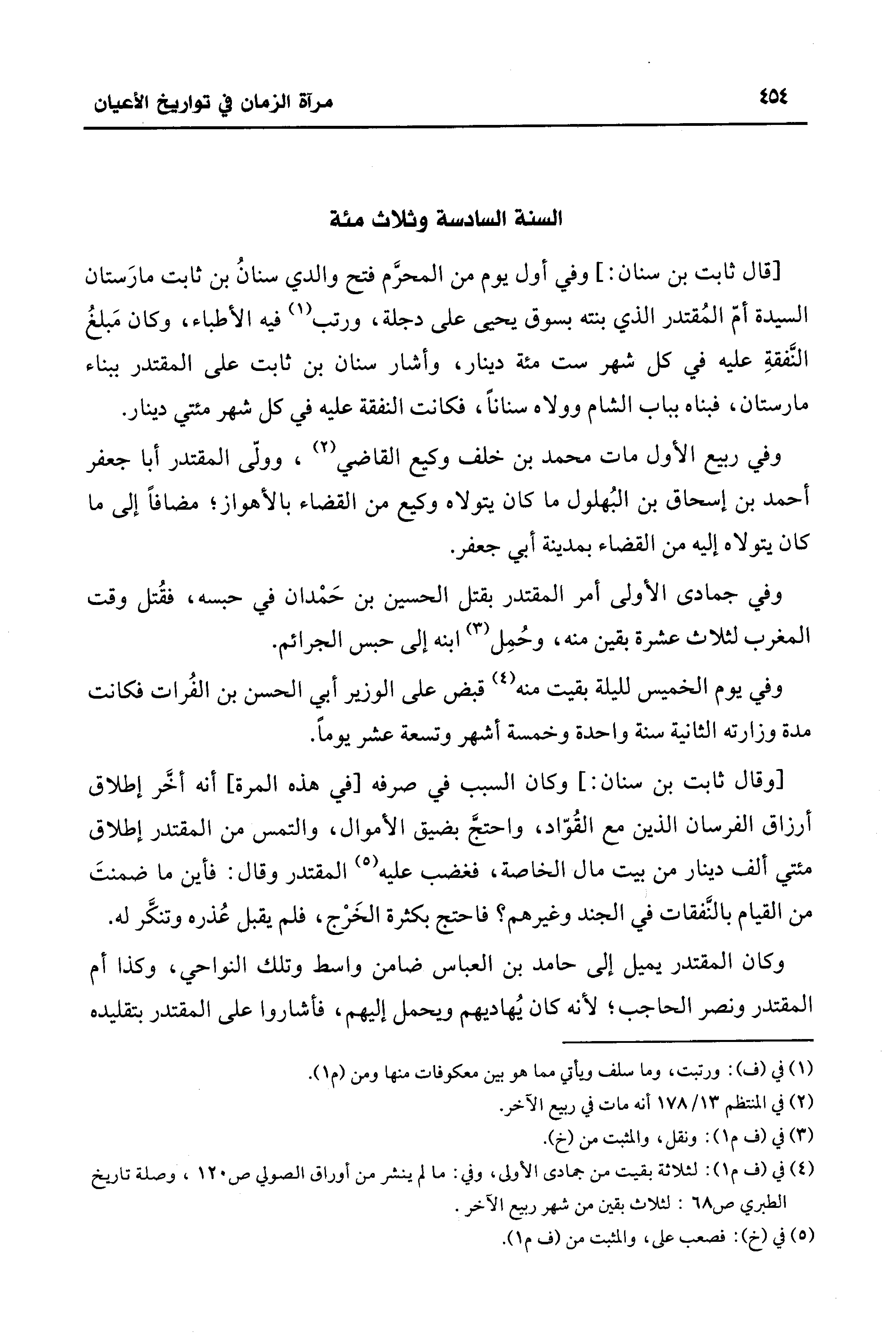 [قال ثابت بن سنان: ] وفي أول يوم من المحرَّم فتح والدي سنانُ بن ثابت مارَستان السيدة أمّ المُقتدر الَّذي بنته بسوق يحيى على دجلة، ورتب (¬1) في الأطباء، وكان مَبلغُ النَّفقةِ عليه في كل شهر ست مئة دينار، وأشار سنان بن ثابت على المقتدر ببناء مارستان، فبناه بباب الشام وولاه سنانًا، فكانت النفقة عليه في كل شهر مئتي دينار.