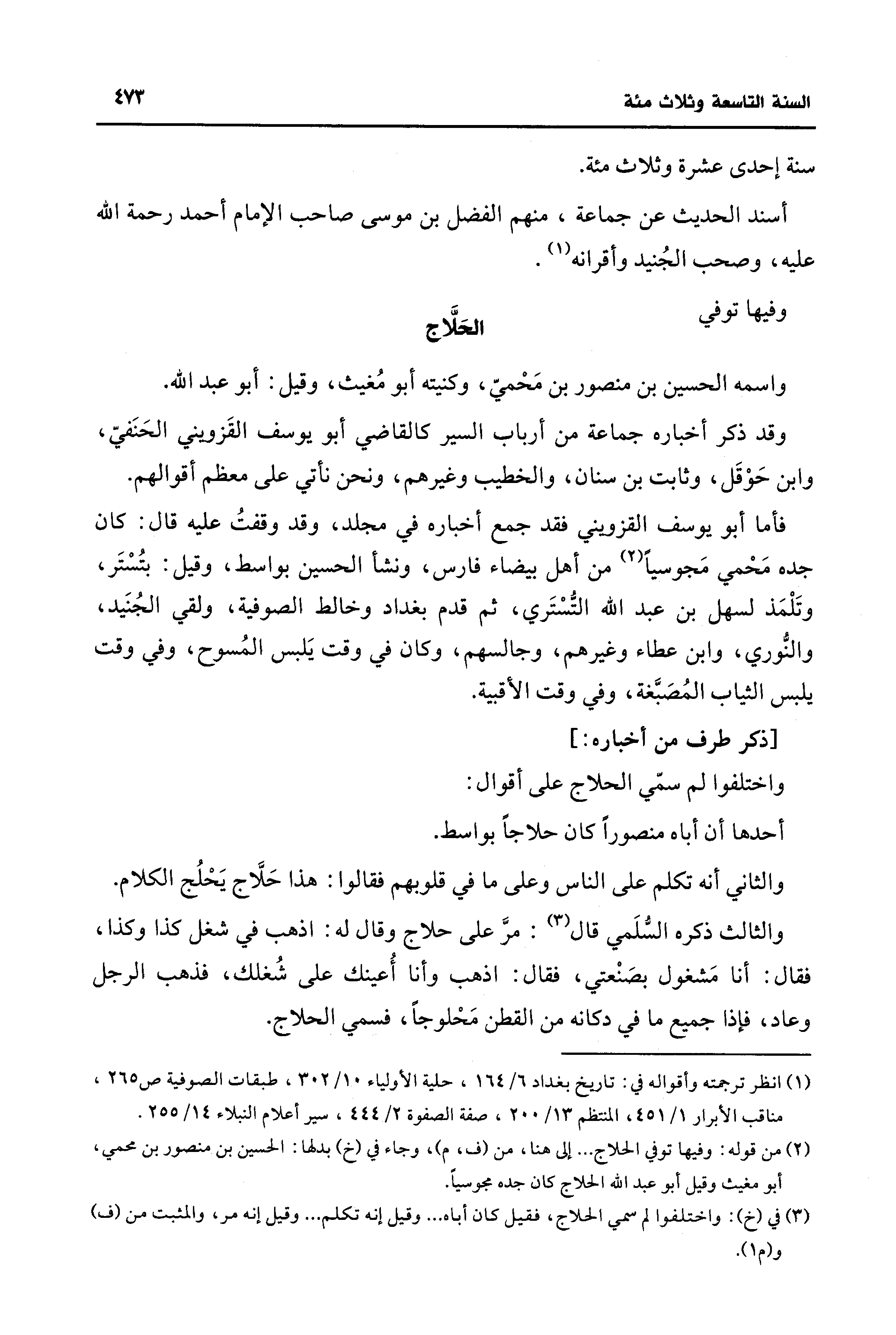 (¬2) من قوله: وفيها توفي الحلاج ... إلى هنا، من (ف، م)، وجاء في (خ) بدلها: الحسين بن منصور بن محمي، أبو مغيث وقيل أبو عبد الله الحلاج كان جده مجوسيًّا.