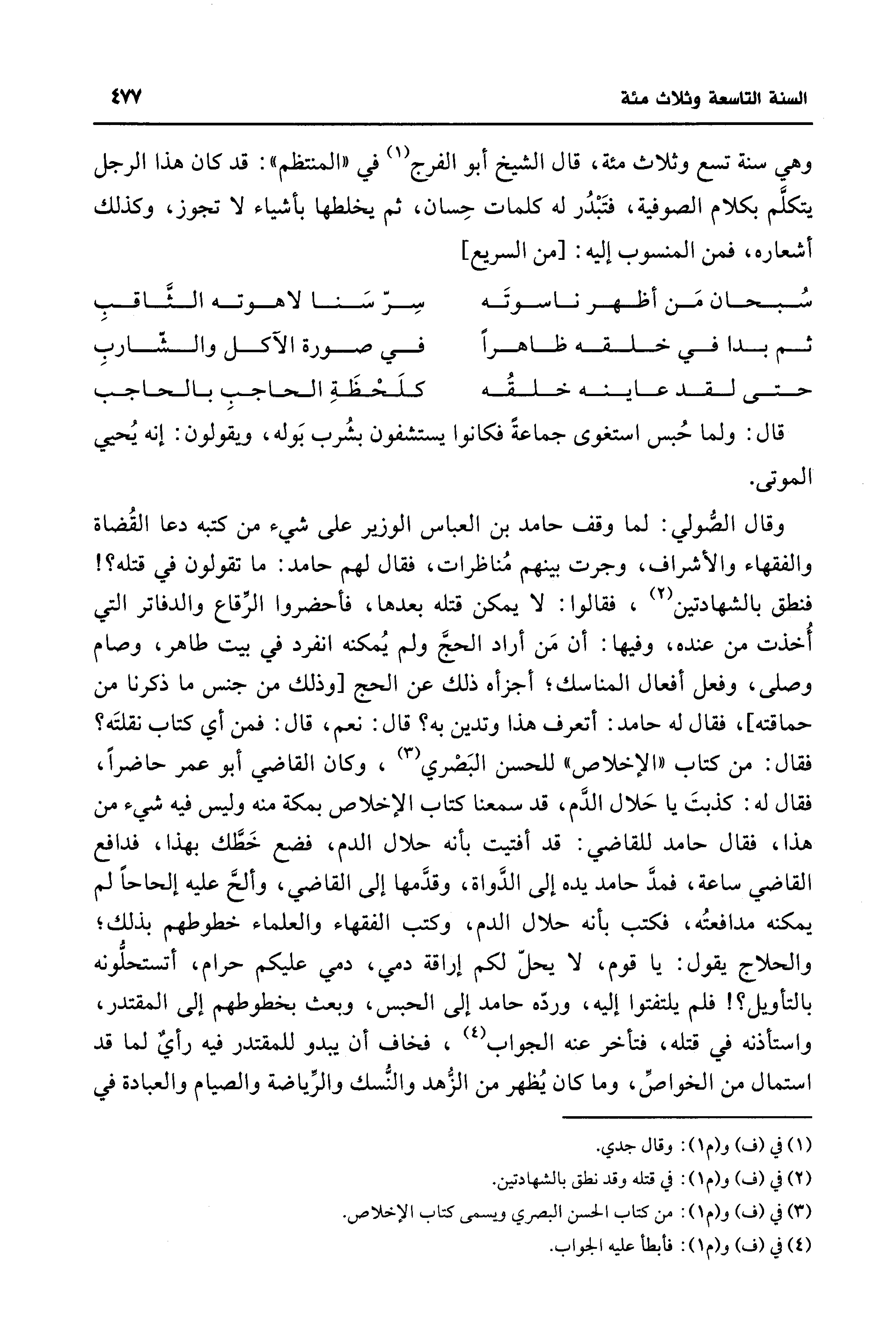 فقال: من كتاب "الإخلاص" للحسن البَصْري (¬3)، وكان القاضي أبو عمر حاضرًا، فقال له: كذبتَ يا حَلال الدَّم، قد سمعنا كتاب الإخلاص بمكة منه وليس فيه شيء من هذا، فقال حامد للقاضي: قد أفتيت بأنه حلال الدم، فضع خَطَّك بهذا، فدافع القاضي ساعة، فمد حامد يده إلى الدَّواة، وقدَّمها إلى القاضي، وألحَّ عليه إلحاحًا لم يمكنه مدافعتُه، فكتب بأنه حلال الدم، وكتب الفقهاء والعلماء خطوطهم بذلك؛ والحلاج يقول: يا قوم، لا يحلّ لكم إراقة دمي، دمي عليكم حرام، أتستحلُّونه بالتأويل؟ ! فلم يلتفتوا إليه، وردّه حامد إلى الحبس، وبعث بخطوطهم إلى المقتدر، واستأذنه في قتله، فتأخر عنه الجواب (¬4)، فخاف أن يبدو للمقتدر فيه رأيٌ لما قد استمال من الخواصِّ، وما كان يُظهر من الزُّهد والنُّسك والرياضة والصيام والعبادة في