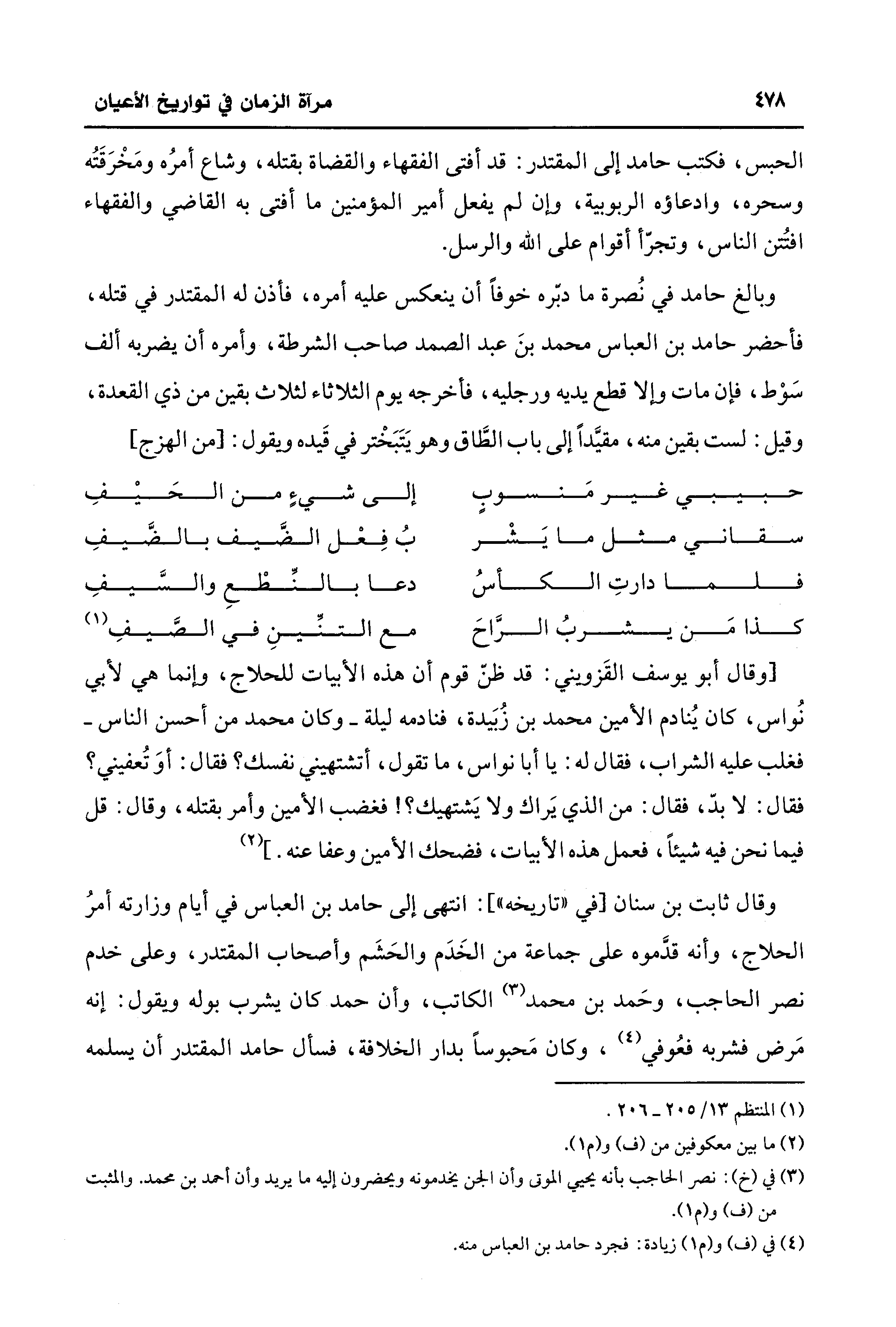 وقال ثابت بن سنان [في "تاريخه"]: انتهى إلى حامد بن العباس في أيام وزارته أمرُ الحلاج، وأنه قدَّموه على جماعة من الخَدَم والحَشَم وأصحاب المقتدر، وعلى خدم نصر الحاجب، وحَمد بن محمد (¬3) الكاتب، وأن حمد كان يشرب بوله ويقول: إنه مَرض فشربه فعُوفي (¬4)، وكان مَحبوسًا بدار الخلافة، فسأل حامد المقتدر أن يسلمه