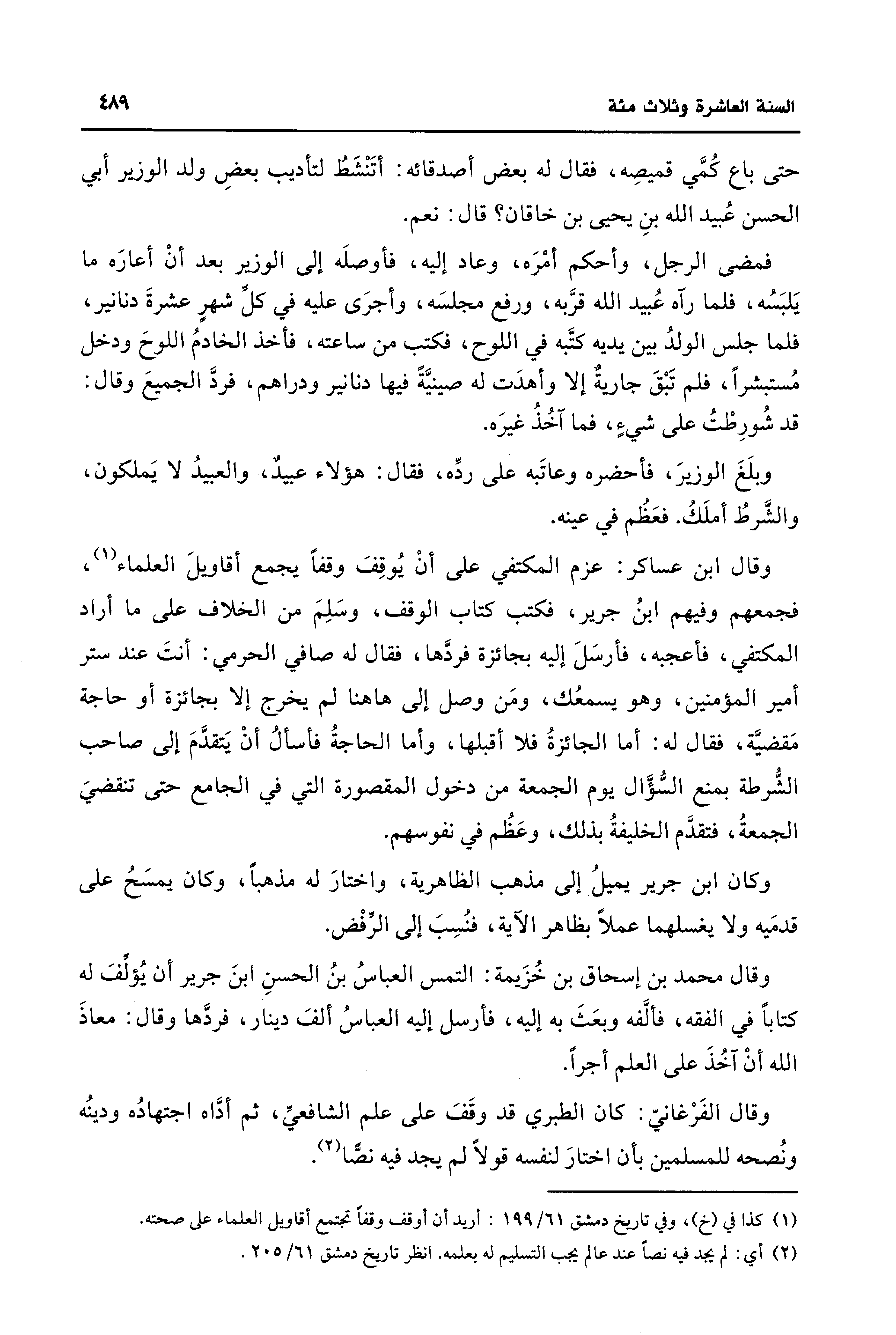 وقال ابن عساكر: عزم المكتفي على أنْ يُوقِفَ وقفًا يجمع أقاويلَ العلماء (¬1)، فجمعهم وفيهم ابنُ جرير، فكتب كتاب الوقف، وسَلِمَ من الخلاف على ما أراد المكتفي، فأعجبه، فأرسَلَ إليه بجائزة فردَّها، فقال له صافي الحرمي: أنتَ عند ستر أمير المؤمنين، وهو يسمعُك، ومَن وصل إلى هاهنا لم يخرج إلا بجائزة أو حاجة مَقضيَّة، فقال له: أما الجائزةُ فلا أقبلها، وأما الحاجةُ فأسألُ أنْ يَتقدَّمَ إلى صاحب الشُّرطة بمنع السُّؤال يوم الجمعة من دخول المقصورة التي في الجامع حتى تنقضيَ الجمعةُ، فتقدَّم الخليفةُ بذلك، وعَظُم في نفوسهم.