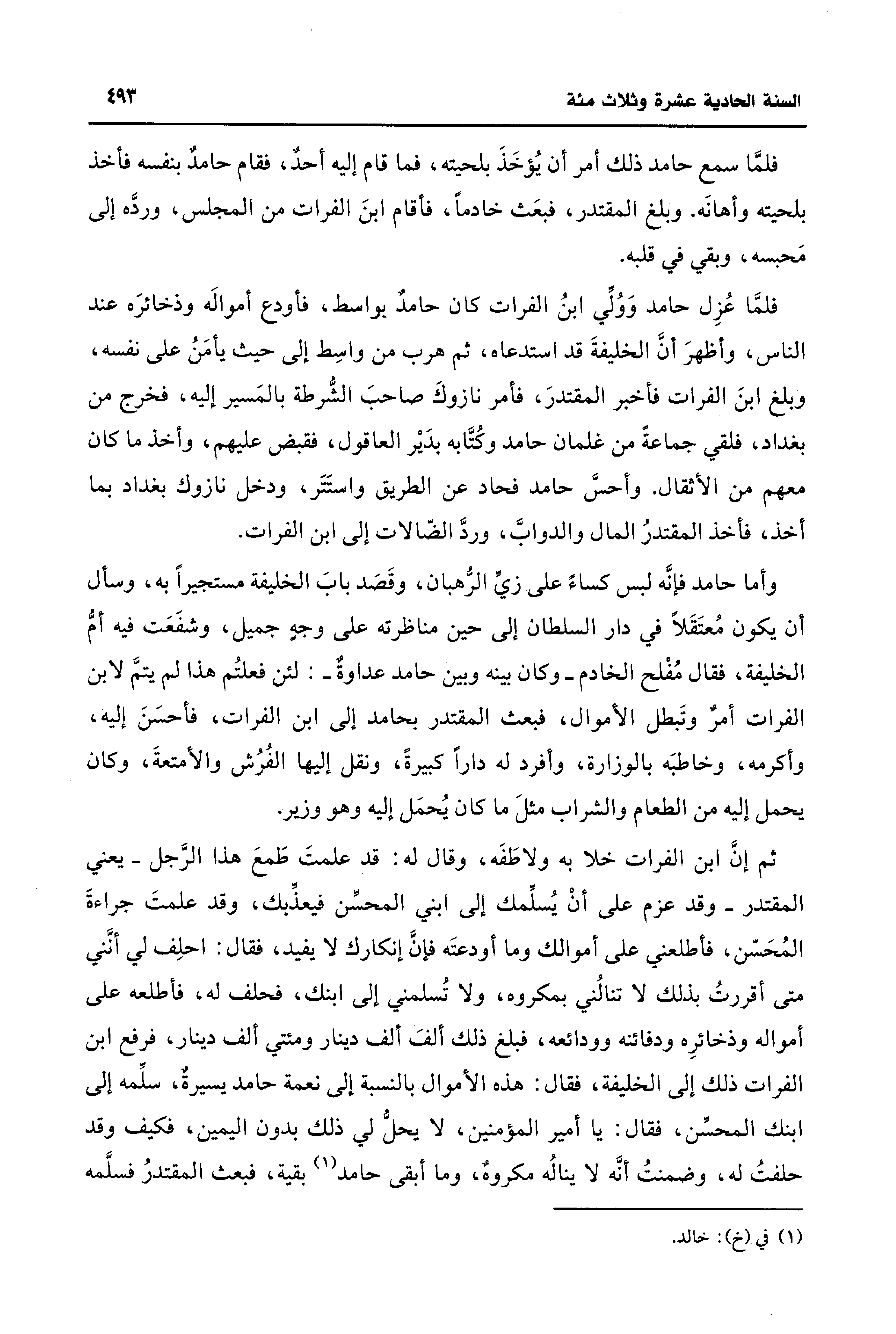 وأما حامد فإنَّه لبس كساءً على زي الرُّهبان، وقَصَد بابَ الخليفة مستجيرًا به، وسأل أن يكون مُعتَقَلًا في دار السلطان إلى حين مناظرته على وجهِ جميل، وشفَعَت فيه أمُّ الخليفة، فقال مُفْلح الخادم -وكان بينه وبين حامد عداوةٌ-: لئن فعلتُم هذا لم يتمَّ لابن الفرات أمرٌ وتَبطل الأموال، فبعث المقتدر بحامد إلى ابن الفرات، فأحسَنَ إليه، وأكرمه، وخاطبَه بالوزارة، وأفرد له دارًا كبيرةً، ونقل إليها الفُرُش والأمتعةَ، وكان يحمل إليه من الطعام والشراب مثلَ ما كان يُحمَل إليه وهو وزير.