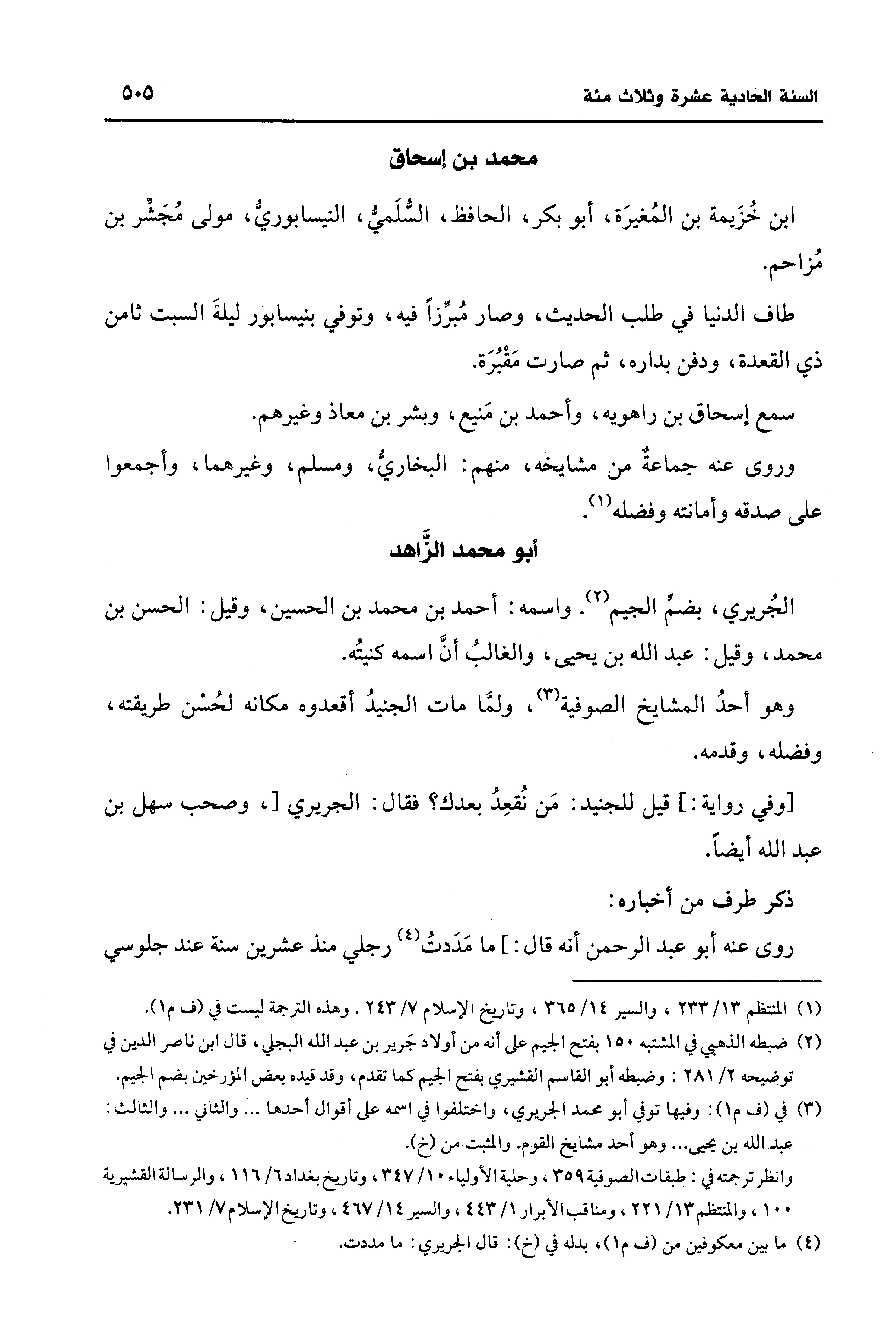 (¬3) في (ف م 1): وفيها توفي أبو محمد الجريري، واختلفوا في اسمه على أقوال أحدها ... والثاني ... والثالث: عبد الله بن يحيى ... وهو أحد مشايخ القوم. والمثبت من (خ).