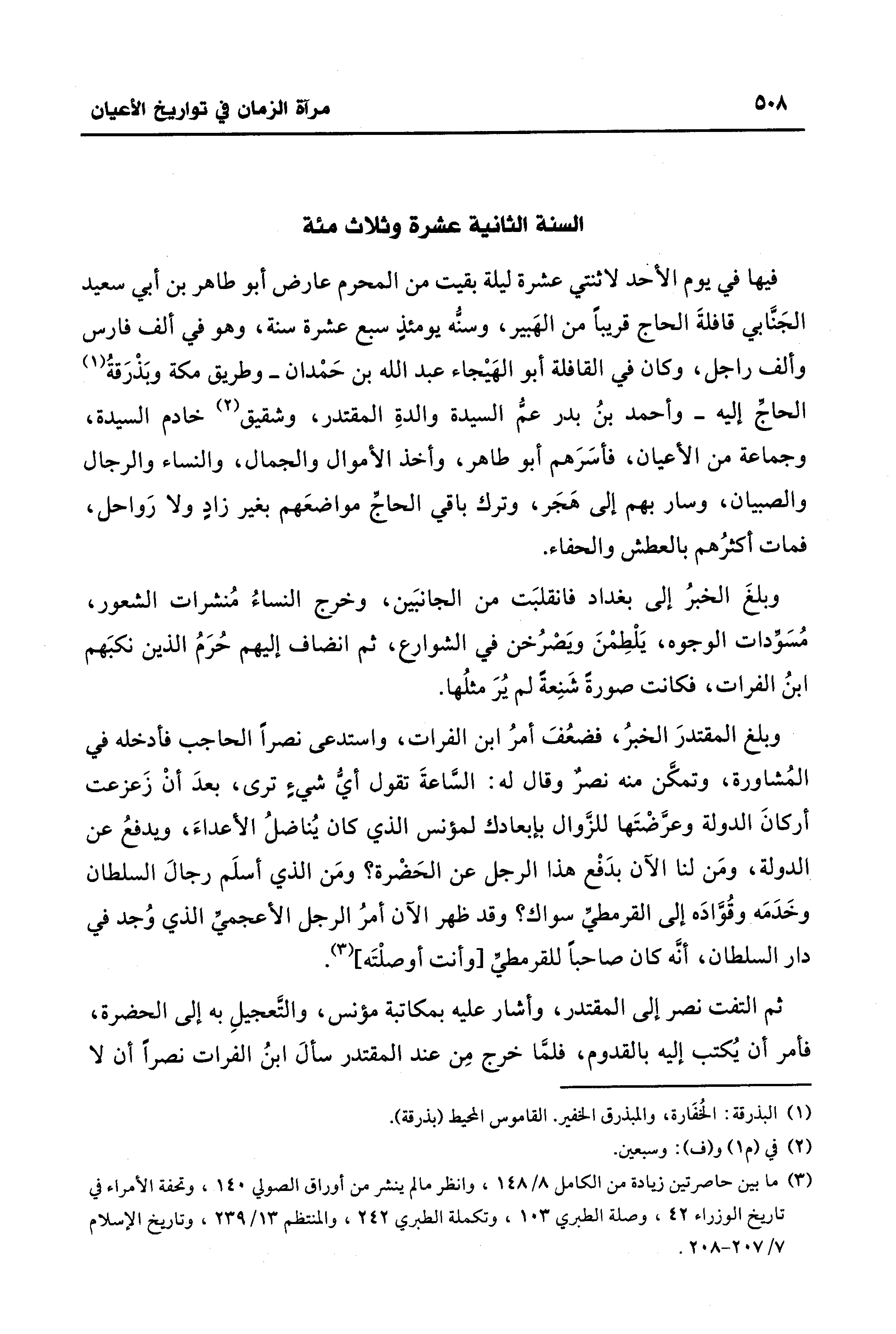 فيها في يوم الأحد لاثنتي عشرة ليلة بقيت من المحرم عارض أبو طاهر بن أبي سعيد الجَنَّابي قافلةَ الحاج قريبًا من الهَبير، وسنُّه يومئذٍ سبع عشرة سنة، وهو في ألف فارس وألف راجل، وكان في القافلة أبو الهَيجاء عبد الله بن حَمْدان -وطريق مكة وبَذْرَقةُ (¬1) الحاج إليه- وأحمد بنُ بدر عمُّ السيدة والدةِ المقتدر، وشقيق (¬2) خادم السيدة، وجماعة من الأعيان، فأسَرَهم أبو طاهر، وأخذ الأموال والجمال، والنساء والرجال والصبيان، وسار بهم إلى هَجَر، وترك باقي الحاج مواضعَهم بغير زادٍ ولا رَواحل، فمات أكثرُهم بالعطش والحفاء.