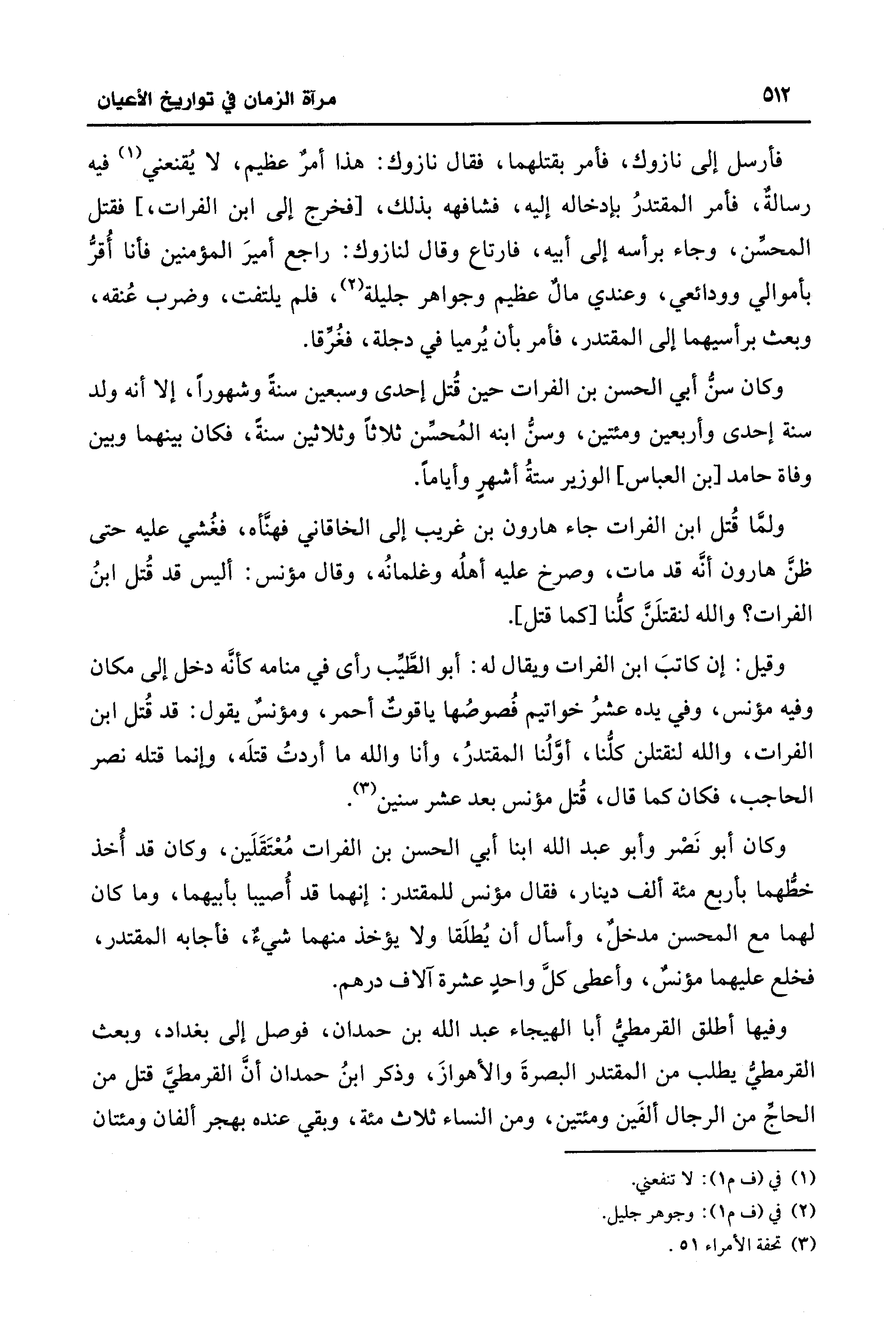 فأرسل إلى نازوك، فأمر بقتلهما، فقال نازوك: هذا أمر عظيم، لا يُقنعني (¬1) فيه رسالة، فأمر المقتدرُ بإدخاله إليه، فشافهه بذلك، [فخرج إلى ابن الفرات، ] فقتل المحسِّن، وجاء برأسه إلى أبيه، فارتاع وقال لنازوك: راجع أميرَ المؤمنين فأنا أُقر بأموالي وودائعي، وعندي مالٌ عظيم وجواهر جليلة (¬2)، فلم يلتفت، وضرب عُنقه، وبعث برأسيهما إلى المقتدر، فأمر بأن يُرميا في دجلة، فغُرِّقا.