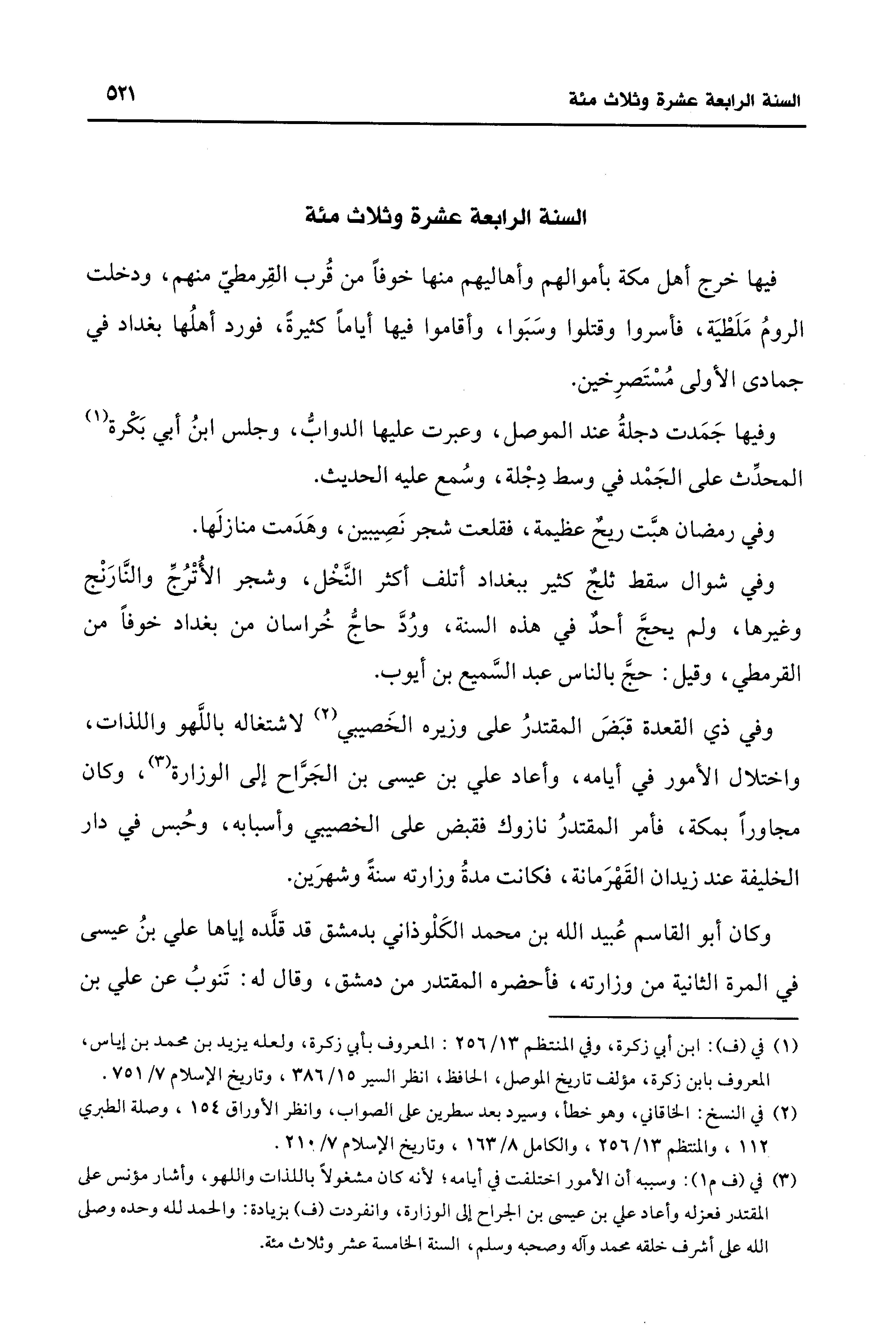 (¬3) في (ف م 1): وسببه أن الأمور اختلفت في أيامه؛ لأنه كان مشغولًا باللذات واللهو، وأشار مؤنس على المقتدر فعزله وأعاد علي بن عيسي بن الجراح إلى الوزارة، وانفردت (ف) بزيادة: والحمد لله وحده وصلى الله على أشرف خلقه محمد وآله وصحبه وسلم، السنة الخامسة عشر وثلاث مئة.