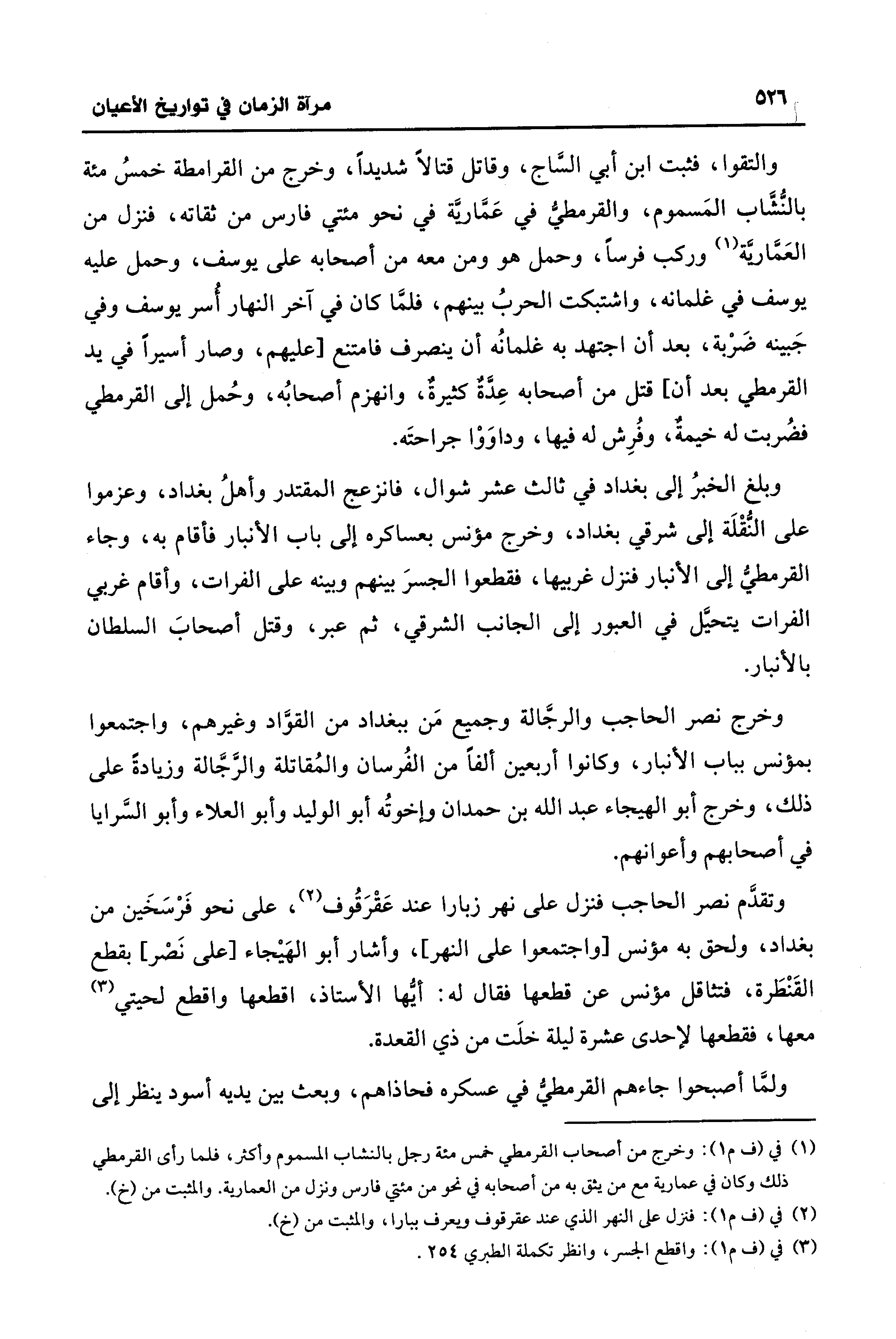وتقدَّم نصر الحاجب فنزل على نهر زبارا عند عَقْرَقُوف (¬2)، على نحو فَرْسَخَين من بغداد، ولحق به مؤنس [واجتمعوا على النهر] وأشار أبو الهَيجاء [على نَصْر] بقطع القَنْطَرة، فتثاقل مؤنس عن قطعها فقال له: أيُّها الأستاذ، اقطعها واقطع لحيتي (¬3) معها، فقطعها لإحدى عشرة ليلة خلَت من ذي القعدة.