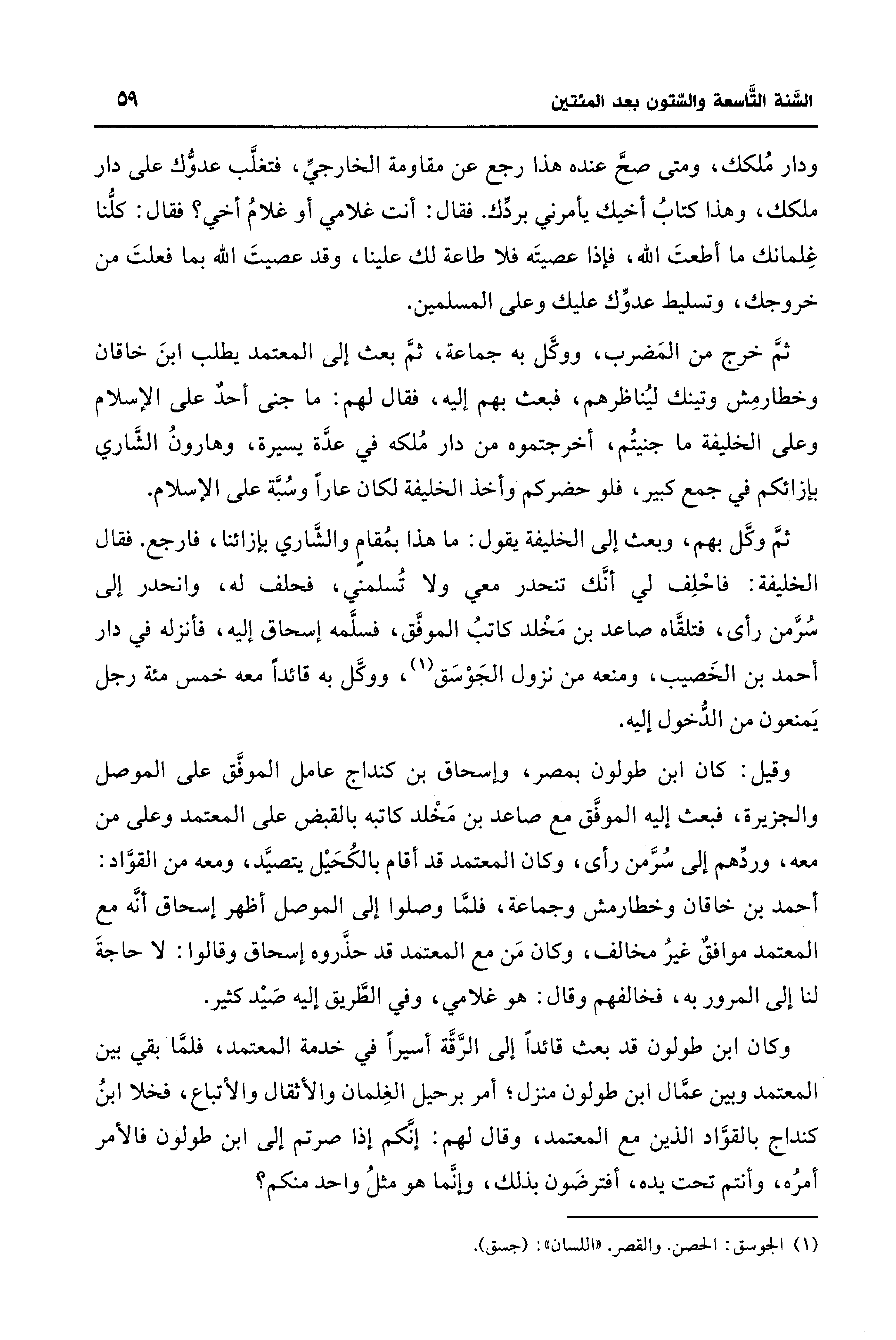 وقيل: كان ابن طولون بمصر، وإسحاق بن كنداج عامل الموفَّق على الموصل والجزيرة، فبعث إليه الموفَّق مع صاعد بن مَخلد كاتبه بالقبض على المعتمد وعلى من معه، وردِّهم إلى سُرَّ من رأى، وكان المعتمد قد أقام بالكُحَيل يتصيَّد، ومعه من القوَّاد: أحمد بن خاقان وخطارمش وجماعة، فلمَّا وصلوا إلى الموصل أظهر إسحاق أنَّه مع المعتمد موافقٌ غيرُ مخالف، وكان مَن مع المعتمد قد حذَّروه إسحاق وقالوا: لا حاجةَ لنا إلى المرور به، فخالفهم وقال: هو غلامي، وفي الطَّريق إليه صَيد كثير.