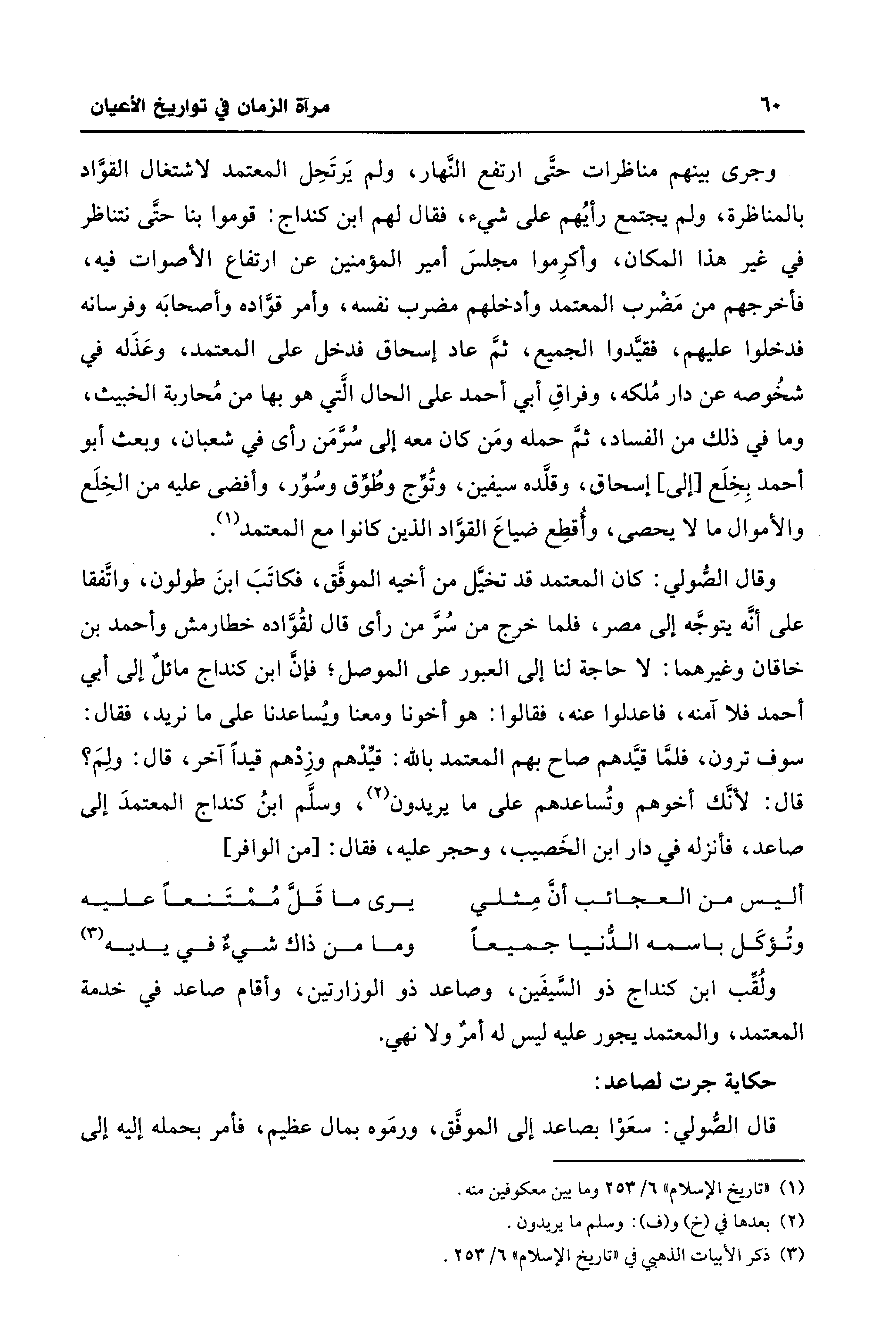 ولُقِّب ابن كنداج ذو السَّيفَين، وصاعد ذو الوزارتين، وأقام صاعد في خدمة المعتمد، والمعتمد يجور عليه ليس له أمرٌ ولا نهي.