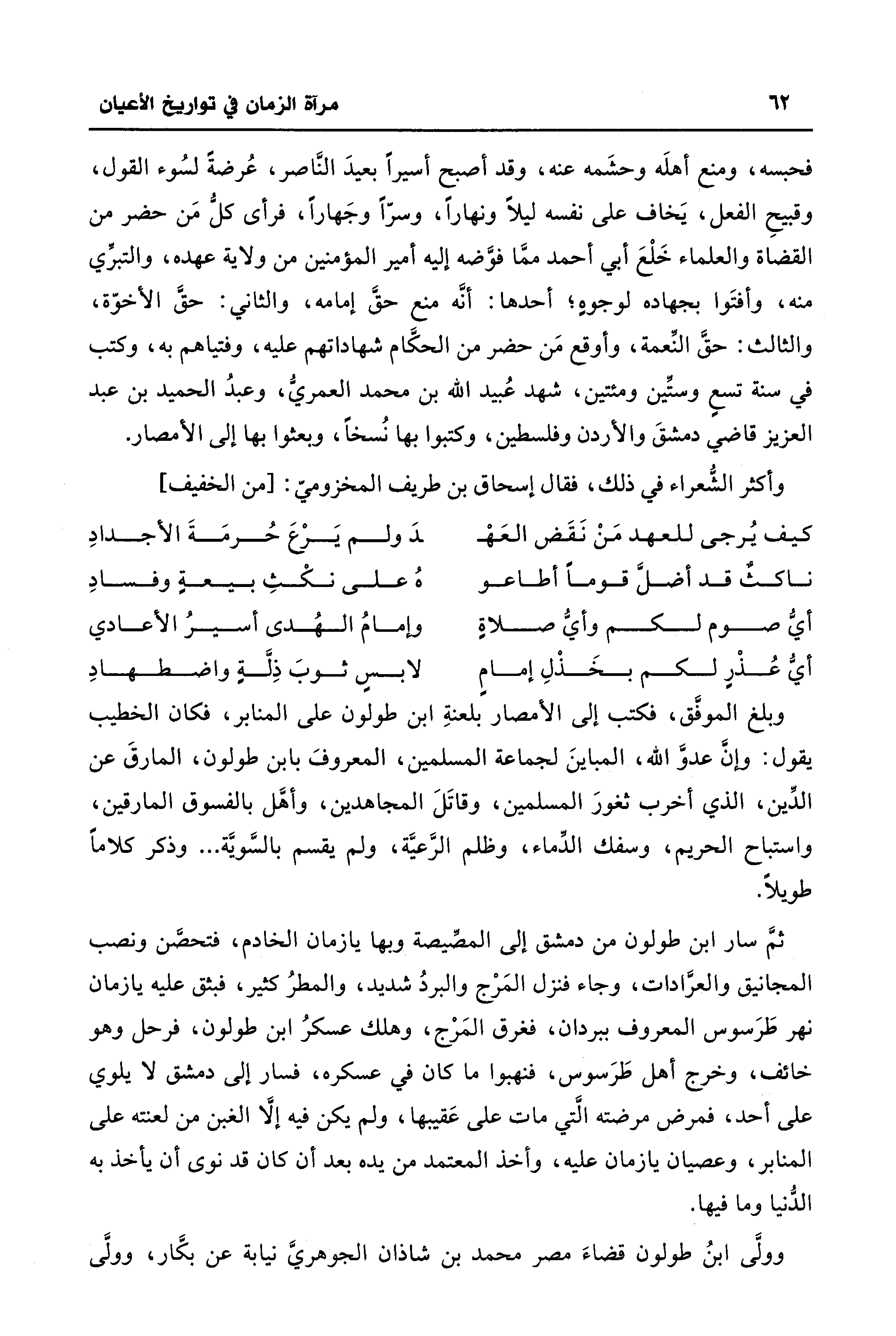 فحبسه، ومنع أهلَه وحشَمه عنه، وقد أصبح أسيرًا بعيدَ النَّاصر، عُرضةً لسُوء القول، وقبيحِ الفعل، يَخاف على نفسه ليلًا ونهارًا، وسرًّا وجَهارًا، فرأى كلُّ مَن حضر من القضاة والعلماء خَلْعَ أبي أحمد ممَّا فوَّضه إليه أمير المؤمنين من ولاية عهده، والتبرِّي منه، وأفتَوا بجهاده لوجوهٍ؛ أحدها: أنَّه منع حقَّ إمامه، والثاني: حقَّ الأخوّة، والثالث: حقَّ النِّعمة، وأوقع مَن حضر من الحكَّام شهاداتهم عليه، وفتياهم به، وكتب في سنة تسعٍ وستِّين ومئتين، شهد عُبيد الله بن محمد العمريُّ، وعبدُ الحميد بن عبد العزيز قاضي دمشقَ والأردن وفلسطين، وكتبوا بها نُسخًا، وبعثوا بها إلى الأمصار.