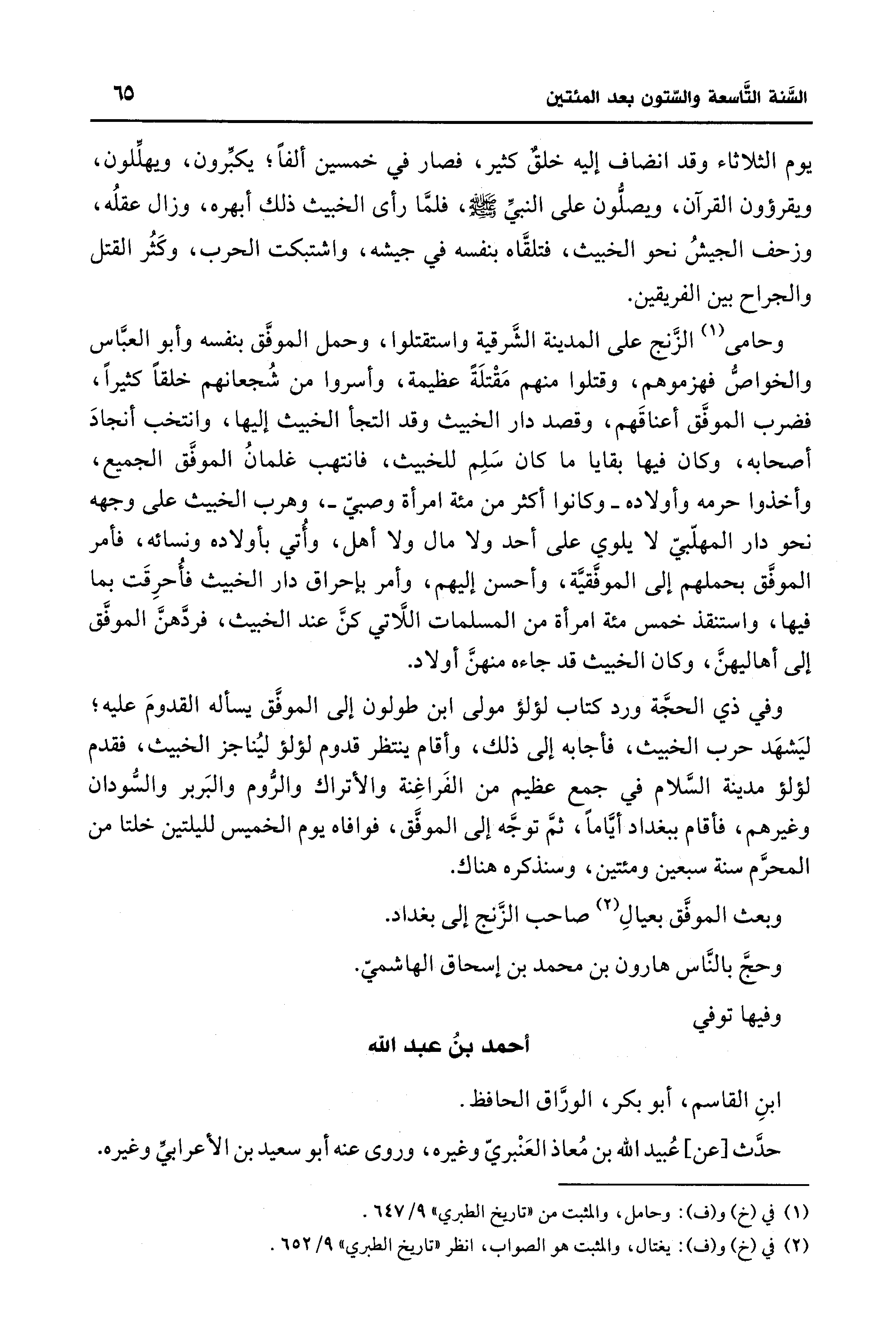 وفي ذي الحجَّة ورد كتاب لؤلؤ مولى ابن طولون إلى الموفَّق يسأله القدومَ عليه؛ ليَشهَد حرب الخبيث، فأجابه إلى ذلك، وأقام ينتظر قدوم لؤلؤ ليُناجز الخبيث، فقدم لؤلؤ مدينة السَّلام في جمع عظيم من الفَراغِنة والأتراك والرُّوم والبَربر والسُّودان وغيرهم، فأقام ببغداد أيَّامًا، ثمَّ توجَّه إلى الموفَّق، فوافاه يوم الخميس لليلتين خلتا من المحرَّم سنة سبعين ومئتين، وسنذكره هناك.
