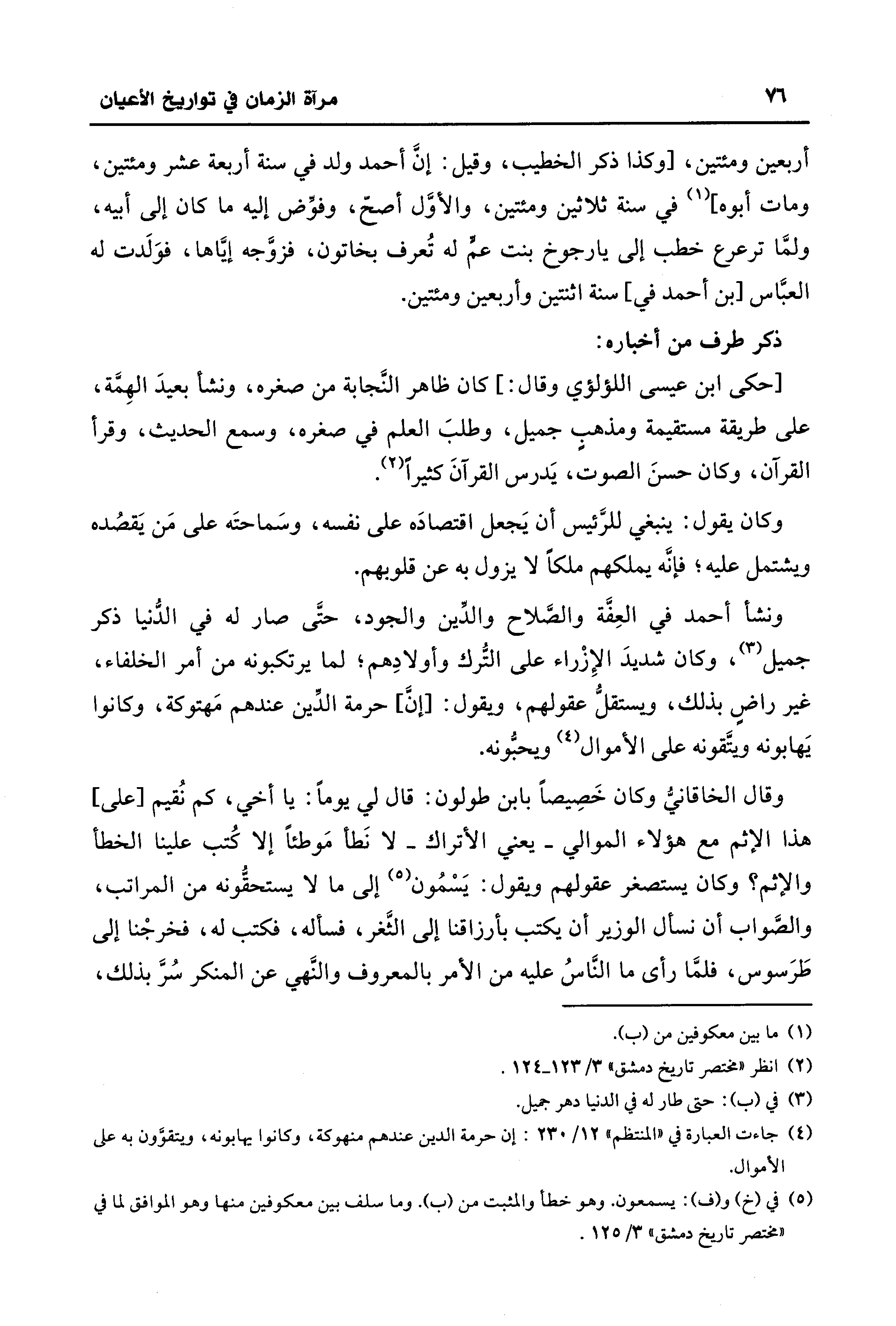 ونشأ أحمد في العِفَّة والصَّلاح والدِّين والجود، حتَّى صار له في الدُّنيا ذكر جميل (¬3)، وكان شديدَ الإِزْراء على التُّرك وأولادِهم؛ لما يرتكبونه من أمر الخلفاء، غير راضٍ بذلك، ويستقلُّ عقولهم، ويقول: [إنَّ] حرمة الدِّين عندهم مَهتوكة، وكانوا يَهابونه ويتَّقونه على الأموال (¬4) ويحبُّونه.