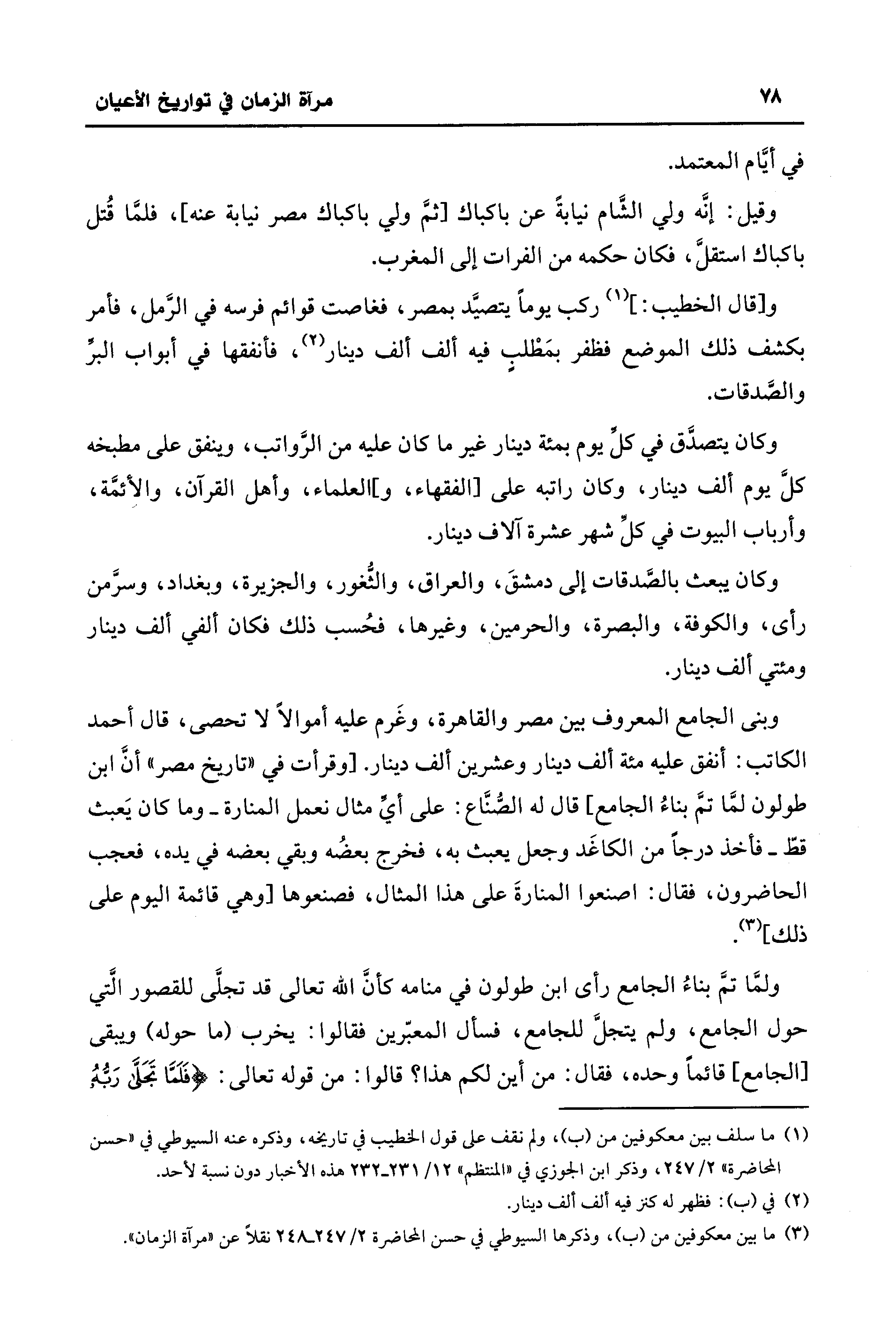 وبنى الجامع المعروف بين مصر والقاهرة، وغَرم عليه أموالًا لا تحصى، قال أحمد الكاتب: أنفق عليه مئة ألف دينار وعشرين ألف دينار. [وقرأت في "تاريخ مصر" أنَّ ابن طولون لمَّا تمَّ بناءُ الجامع] قال له الصُّنَّاع: على أيِّ مثال نعمل المنارة -وما كان يَعبث قطّ- فأخذ درجًا من الكاغَد وجعل يعبث به، فخرج بعضُه وبقي بعضه في يده، فعجب الحاضرون، فقال: اصنعوا المنارةَ على هذا المثال، فصنعوها [وهي قائمة اليوم على ذلك] (¬3).