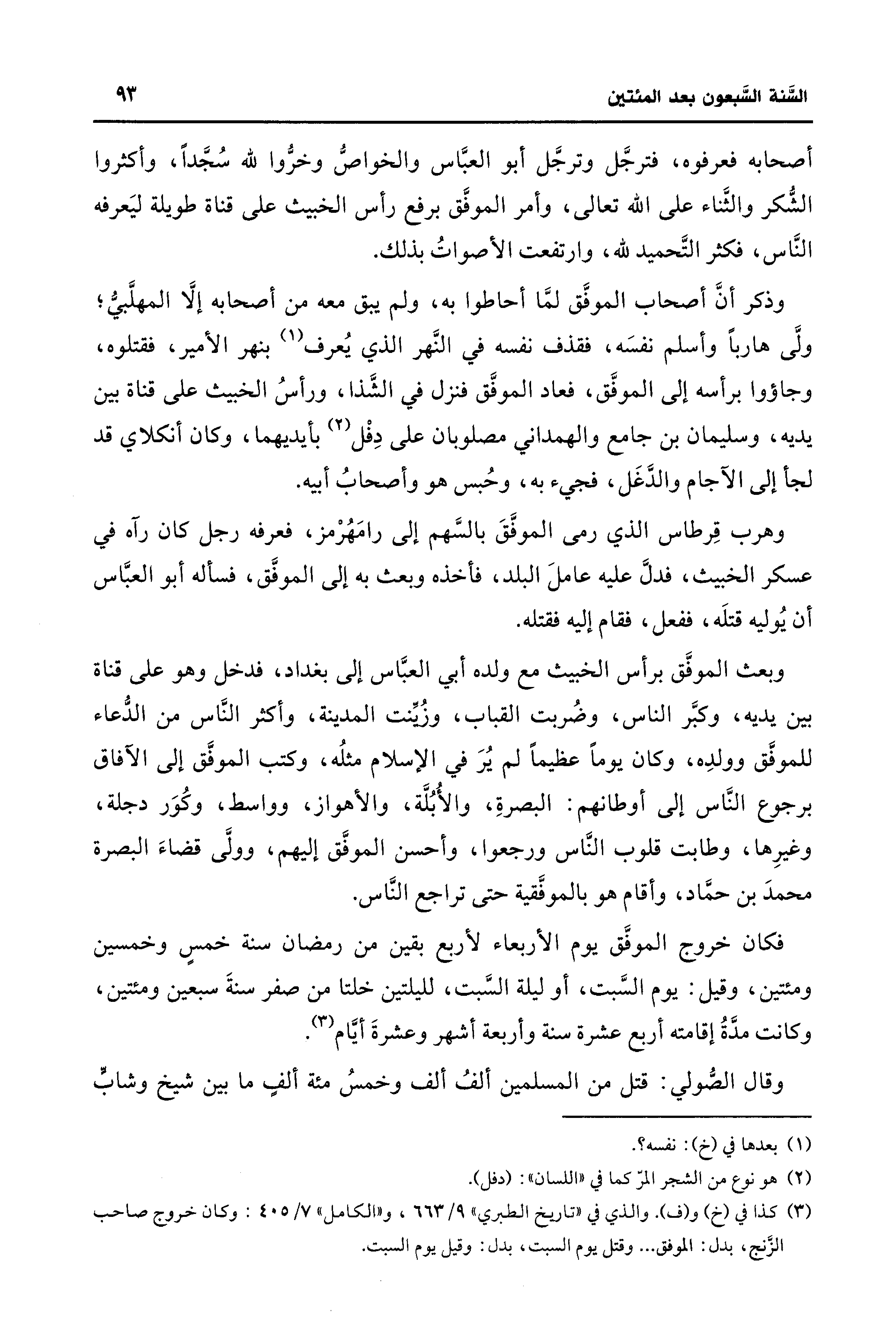 أصحابه فعرفوه، فترجَّل وترجَّل أبو العبَّاس والخواصُّ وخرُّوا لله سُجَّدًا، وأكثروا الشُّكر والثَّناء على الله تعالى، وأمر الموفَّق برفع رأس الخبيث على قناة طويلة ليَعرفه النَّاس، فكثر التَّحميد لله، وارتفعت الأصواتُ بذلك.