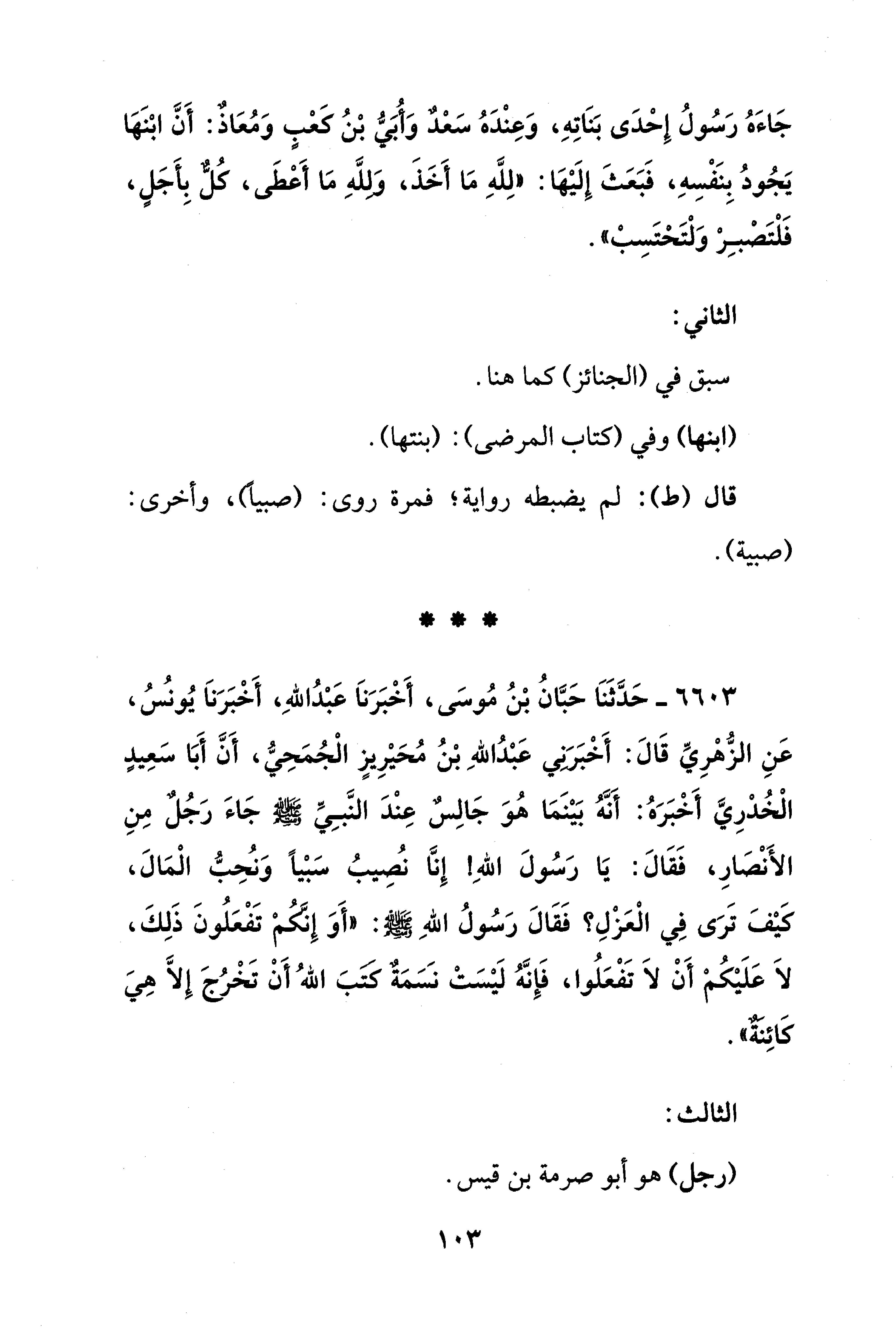 6603 - حَدَّثَنَا حَبَّانُ بْنُ مُوسَى، أَخْبَرَنَا عَبْدُ اللهِ، أَخْبَرَنَا يُونُسُ، عَنِ الزُّهْرِيِّ قَالَ: أَخْبَرَني عَبْدُ اللهِ بْنُ مُحَيْرِيزٍ الْجُمَحِيُّ، أَنَّ أَبَا سَعِيدٍ الْخُدرِيَّ أَخْبَرَهُ: أنَّهُ بَيْنَمَا هُوَ جَالِسٌ عِنْدَ النَّبِيِّ - صلى الله عليه وسلم - جَاءَ رَجُلٌ مِنِ الأَنْصَارِ، فَقَالَ: يَا رَسُولَ اللهِ! إنَّا نُصِيبُ سَبْيًا وَنُحِبُّ الْمَالَ، كَيْفَ تَرَى فِي الْعَزْلِ؟ فَقَالَ رَسُولُ اللهِ - صلى الله عليه وسلم -: "أَوَ إِنَّكم تَفْعَلُونَ ذَلِكَ، لَا عَلَيْكُم أَنْ لَا تَفْعَلُوا، فَإِنَّهُ لَيْسَتْ نَسَمَةٌ كتَبَ اللهُ أَنْ تَخْرُجَ إِلَّا هِيَ كَائِنةٌ".