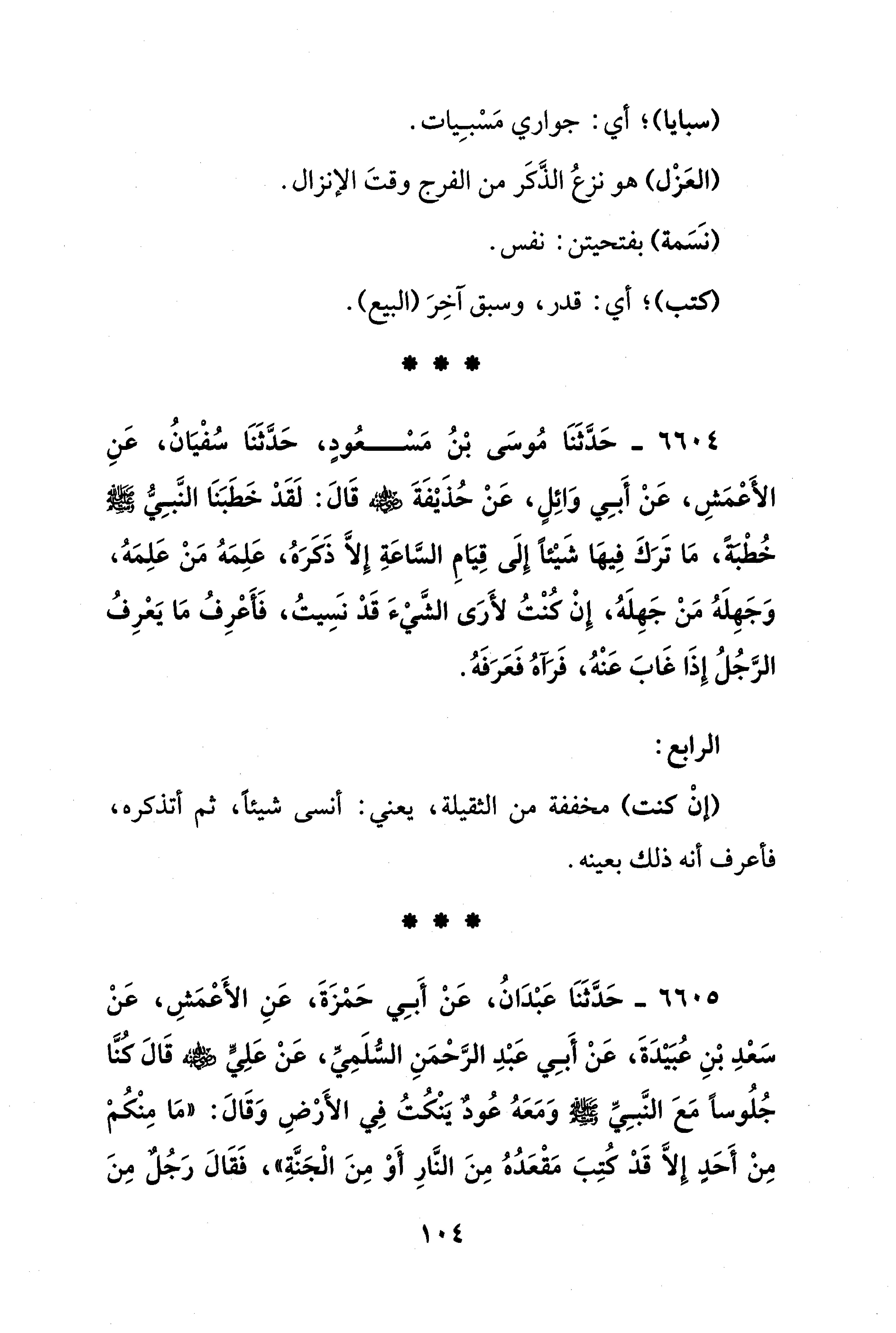 6605 - حَدَّثَنَا عَبْدَانُ، عَنْ أَبِي حَمزَةَ، عَنِ الأَعْمَشِ، عَنْ سَعْدِ بْنِ عُبَيْدَةَ، عَنْ أَبِي عَبْدِ الرَّحمَنِ السُّلَمِيِّ، عَنْ عَلِيٍّ - رضي الله عنه - قَالَ كُنَّا جُلُوسًا مَعَ النَّبِيِّ - صلى الله عليه وسلم - وَمَعَهُ عُود يَنْكُتُ فِي الأَرْضِ وَقَالَ: "مَا مِنْكُمْ مِنْ أَحَدٍ إِلَّا قَدْ كُتِبَ مَقْعَدُهُ مِنَ النَّار أَوْ مِنَ الْجَنَّةِ"، فَقَالَ رَجُلٌ مِنَ