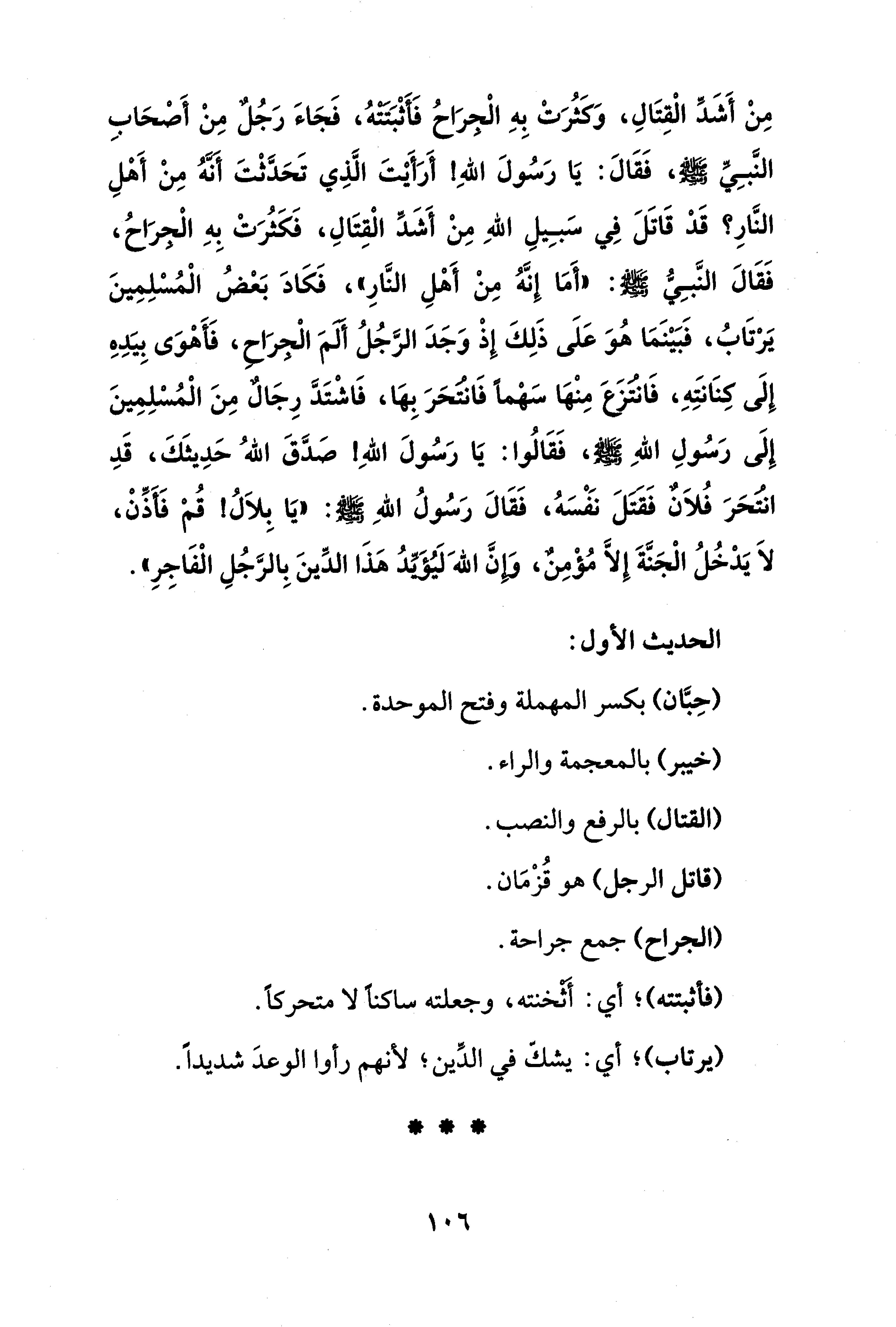 مِنْ أَشَدِّ الْقِتَالِ، وَكثُرَتْ بِهِ الْجرَاحُ فَأَثْبَتَتْهُ، فَجَاءَ رَجُلٌ مِنْ أَصحَابِ النَّبِيِّ - صلى الله عليه وسلم -، فَقَالَ: يَا رَسُولَ اللهِ! أَرَأَيْتَ الَّذِي تَحَدَّثْتَ أنَّهُ مِنْ أَهْلِ النَّارِ؟ قَدْ قَاتَلَ فِي سَبِيلِ اللهِ مِنْ أَشَدِّ الْقِتَالِ، فَكَثُرَتْ بِهِ الْجرَاحُ، فَقَالَ النَّبِيُّ - صلى الله عليه وسلم -: "أَمَا إِنَّهُ مِنْ أَهْلِ النَّار"، فَكَادَ بَعْضُ الْمُسْلِمِينَ يَرْتَابُ، فَبَيْنَمَا هُوَ عَلَى ذَلِكَ إذْ وَجَدَ الرَّجُلُ ألمَ الْجرَاح، فَأهْوَى بِيَدِهِ إِلَى كِنَانتَهِ، فَانتزَعَ مِنْها سَهْمًا فَانتحَرَ بِها، فَاشْتَدَّ رِجَالٌ مِنَ الْمُسْلِمِينَ إِلَى رَسُولِ اللهِ - صلى الله عليه وسلم -، فَقَالُوا: يَا رَسُولَ اللهِ! صَدَّقَ اللهُ حَدِيثَكَ، قَدِ انتحَرَ فُلاَنٌ فَقَتَلَ نفسَهُ، فَقَالَ رَسُولُ اللهِ - صلى الله عليه وسلم -: "يَا بِلاَل! قُم فَأَذِّنْ، لَا يَدخُلُ الْجَنَّةَ إِلَّا مُؤْمِنٌ، وإنَّ الله لَيُؤَيِّدُ هذَا الدِّينَ بِالرَّجُلِ الْفَاجِرِ".