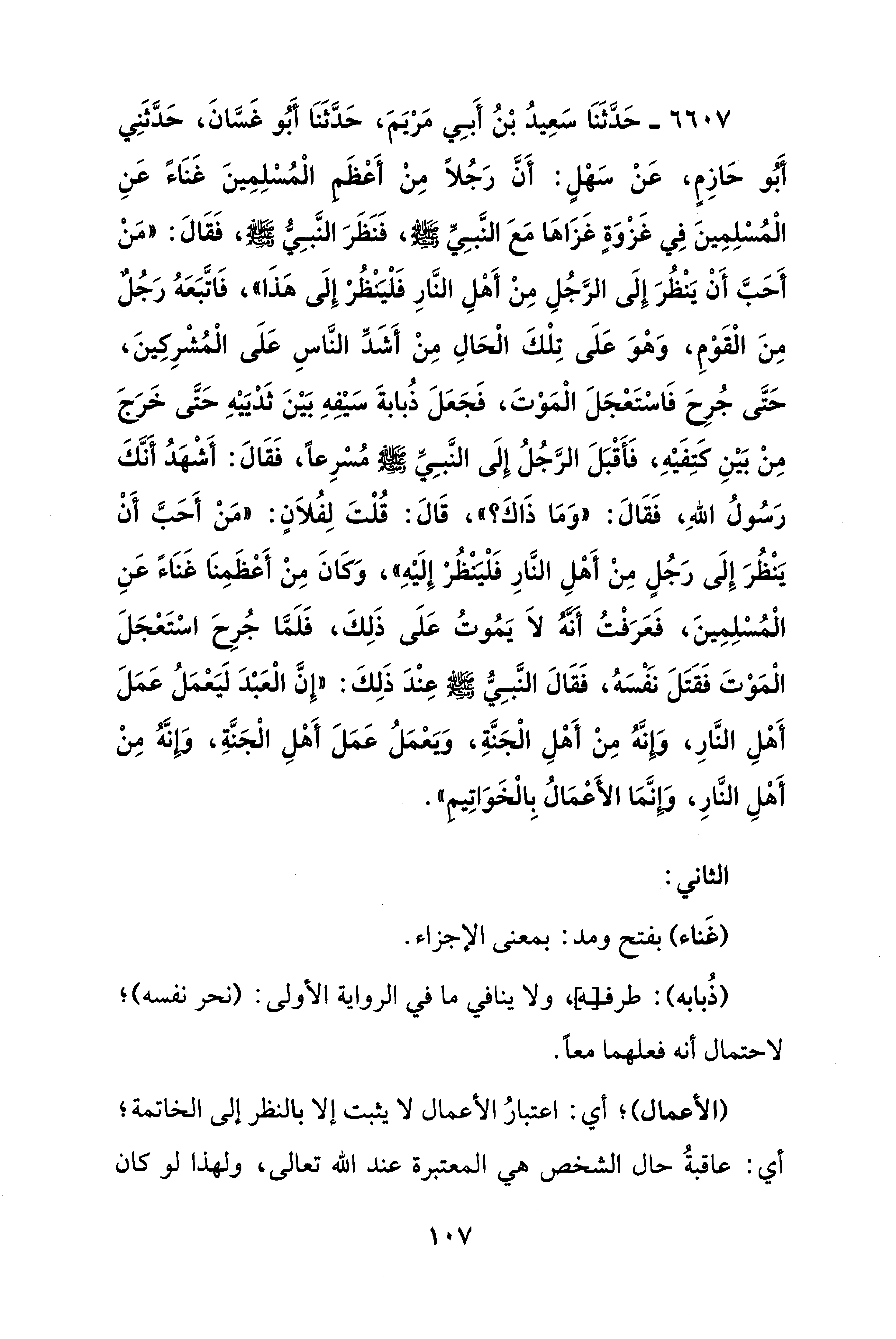 6607 - حَدَّثَنَا سَعِيدُ بْنُ أَبي مَرْيَمَ، حَدَّثَنَا أَبُو غَسَّانَ، حَدَّثَنِي أَبُو حَازِمٍ، عَنْ سَهْلٍ: أَنَّ رَجُلًا مِنْ أَعْظَم الْمُسْلِمِينَ غَنَاءً عَنِ الْمُسْلِمِينَ فِي غَزْوَةٍ غَزَاها مَعَ النَّبِيِّ - صلى الله عليه وسلم -، فَنَظَرَ النَّبِيُّ - صلى الله عليه وسلم -، فَقَالَ: "مَنْ أَحَبَّ أَنْ يَنْظُرَ إِلَى الرَّجُلِ مِنْ أَهْلِ النَّارِ فَلْيَنْظُر إِلَى هذَا"، فَاتَّبَعَهُ رجلٌ مِنَ الْقَوْمِ، وَهْوَ عَلَى تِلْكَ الْحَالِ مِنْ أَشَدِّ النَّاسِ عَلَى الْمُشْرِكِينَ، حَتَّى جُرِحَ فَاسْتَعجَلَ الْمَوْتَ، فَجَعَلَ ذُبابةَ سَيْفِهِ بَيْنَ ثَديَيْهِ حَتَّى خَرَجَ مِنْ بَيْنِ كَتِفَيْهِ، فَأَقْبَلَ الرَّجُلُ إِلَى النَّبيِّ - صلى الله عليه وسلم - مُسْرِعًا، فَقَالَ: أَشْهدُ أَنَّكَ رَسُولُ اللهِ، فَقَالَ: "وَمَا ذَاكَ؟، قَالَ: قُلْتَ لِفُلاَنٍ: "مَنْ أَحَبَّ أَنْ يَنْظُرَ إِلَى رَجُلٍ مِنْ أَهْلِ النَّارِ فَلْيَنْظُرْ إِلَيْهِ"، وَكَانَ مِنْ أَعْظَمِنَا غنَاءً عَنِ الْمُسْلِمِينَ، فَعَرَفْتُ أَنَّهُ لَا يَمُوتُ عَلَى ذَلِكَ، فَلَمَّا جُرِحَ اسْتَعجَلَ الْمَوْتَ فَقتلَ نَفْسَهُ، فَقَالَ النَّبِيُّ - صلى الله عليه وسلم - عِنْدَ ذَلِكَ: "إِنَّ الْعَبْدَ لَيَعمَلُ عَمَلَ أَهْلِ النَّارِ، وإنَّهُ مِنْ أَهْلِ الْجَنَّةِ، وَيَعمَلُ عَمَلَ أَهْلِ الْجَنَّةِ، وَإِنَّهُ مِنْ أَهْلِ النَّارِ، وَإِنَّمَا الأعْمَالُ بِالْخَوَاتِيم".