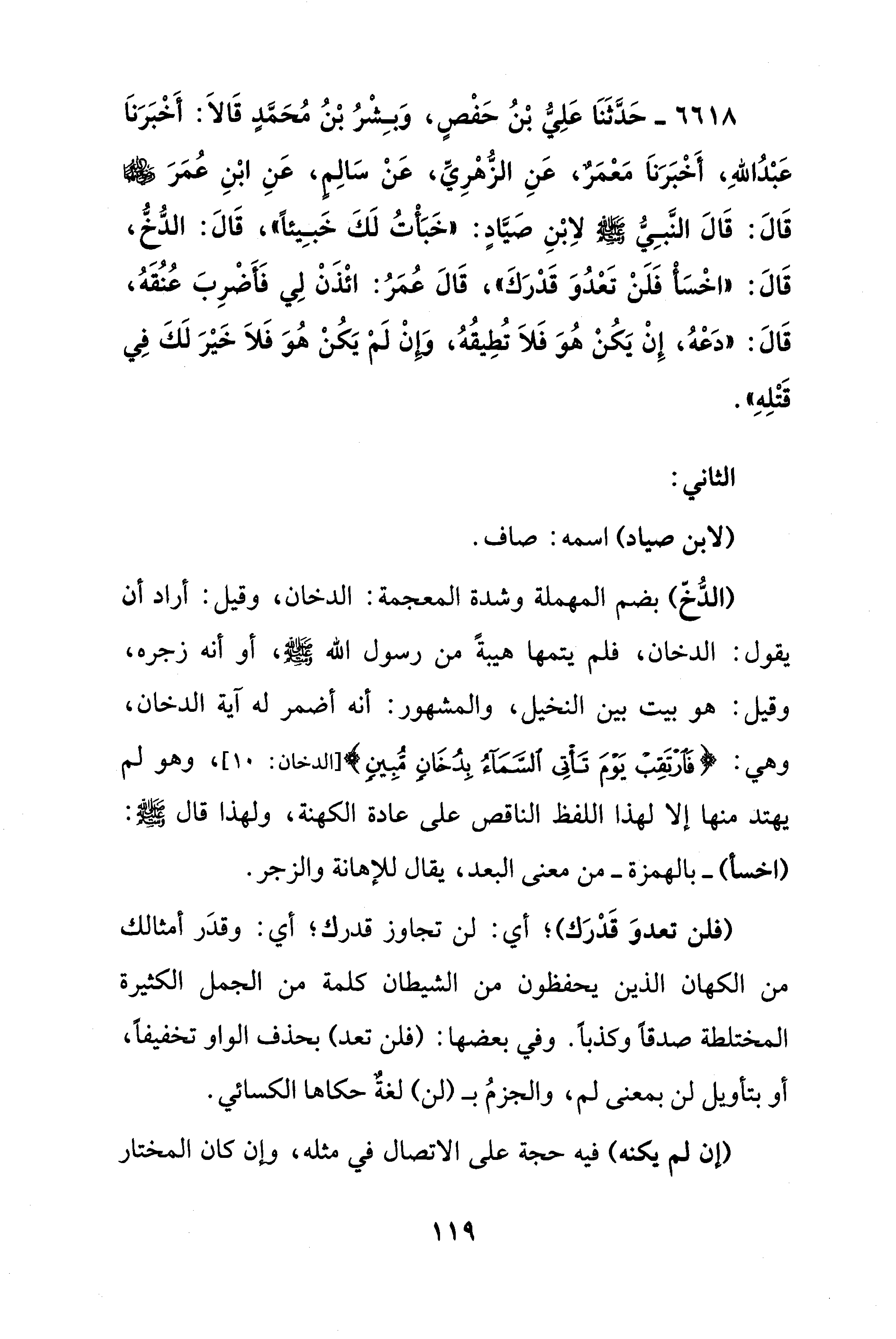 6618 - حَدَّثَنَا عَلِيُّ بْنُ حَفْصٍ، وَبِشْرُ بْنُ مُحَمَّدٍ قَالَا: أَخْبَرَنَا عَبْدُ اللهِ، أَخْبَرَنَا معمَرٌ، عَنِ الزُّهْرِي، عَنْ سَالِمٍ، عَنِ ابْنِ عُمَر - رضي الله عنهما - قَالَ: قَالَ النَّبِيُّ - صلى الله عليه وسلم - لاِبْنِ صيَّادٍ: "خَبَأتُ لَكَ خَبِيئًا"، قَالَ: الدُّخُّ، قَالَ: "اخْسَأْ فَلَنْ تَعدُوَ قَدرَكَ"، قَالَ عُمَرُ: ائْذَنْ لِي فَأَضْرِبَ عُنُقَهُ، قَالَ: "دعْهُ، إِنْ يَكُنْ هُوَ فَلَا تُطِيقُهُ، وَإِنْ لَمْ يَكُنْ هُوَ فَلَا خَيْرَ لَكَ فِي قَتْلِهِ".