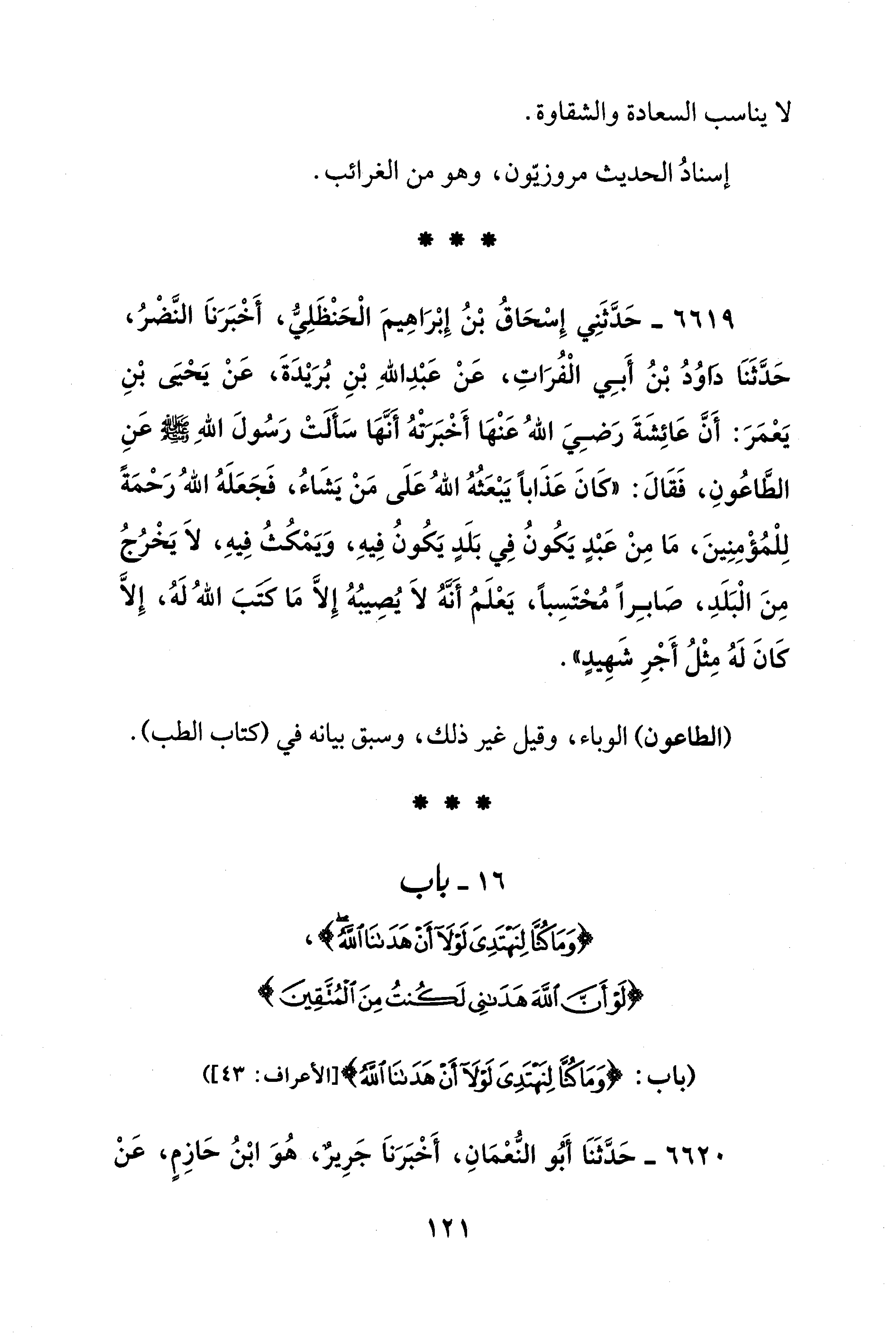 6619 - حَدَّثَنِي إِسْحَاقُ بْنُ إِبْرَاهِيمَ الْحَنْظَلِيُّ، أَخْبَرَنَا النَّضْرُ، حَدَّثَنَا داوُدُ بْنُ أَبِي الْفُرَاتِ، عَنْ عَبْدِ اللهِ بْنِ بُرَيْدَةَ، عَنْ يَحيَى بْنِ يَعْمَرَ: أَنَّ عَائِشَةَ رَضِيَ اللهُ عَنْها أَخْبَرتهُ أَنَّها سَألتْ رَسُولَ اللهِ - صلى الله عليه وسلم - عَنِ الطَّاعُونِ، فَقَالَ: "كَانَ عَذَابًا يَبْعَثُهُ اللهُ عَلَى مَنْ يَشَاءُ، فَجَعَلَهُ اللهُ رحْمَةً لِلْمُؤْمِنِينَ، مَا مِنْ عَبْدٍ يَكُونُ فِي بَلَدٍ يَكُونُ فِيهِ، وَيَمْكُثُ فِيهِ، لَا يَخْرُجُ مِنَ الْبَلَدِ، صَابِرًا مُحْتَسِبًا، يَعْلَمُ أَنَّهُ لَا يُصِيبُهُ إِلَّا مَا كتَبَ اللهُ لَهُ، إِلَّا كَانَ لَهُ مِثْلُ أَجْرِ شَهِيدٍ".