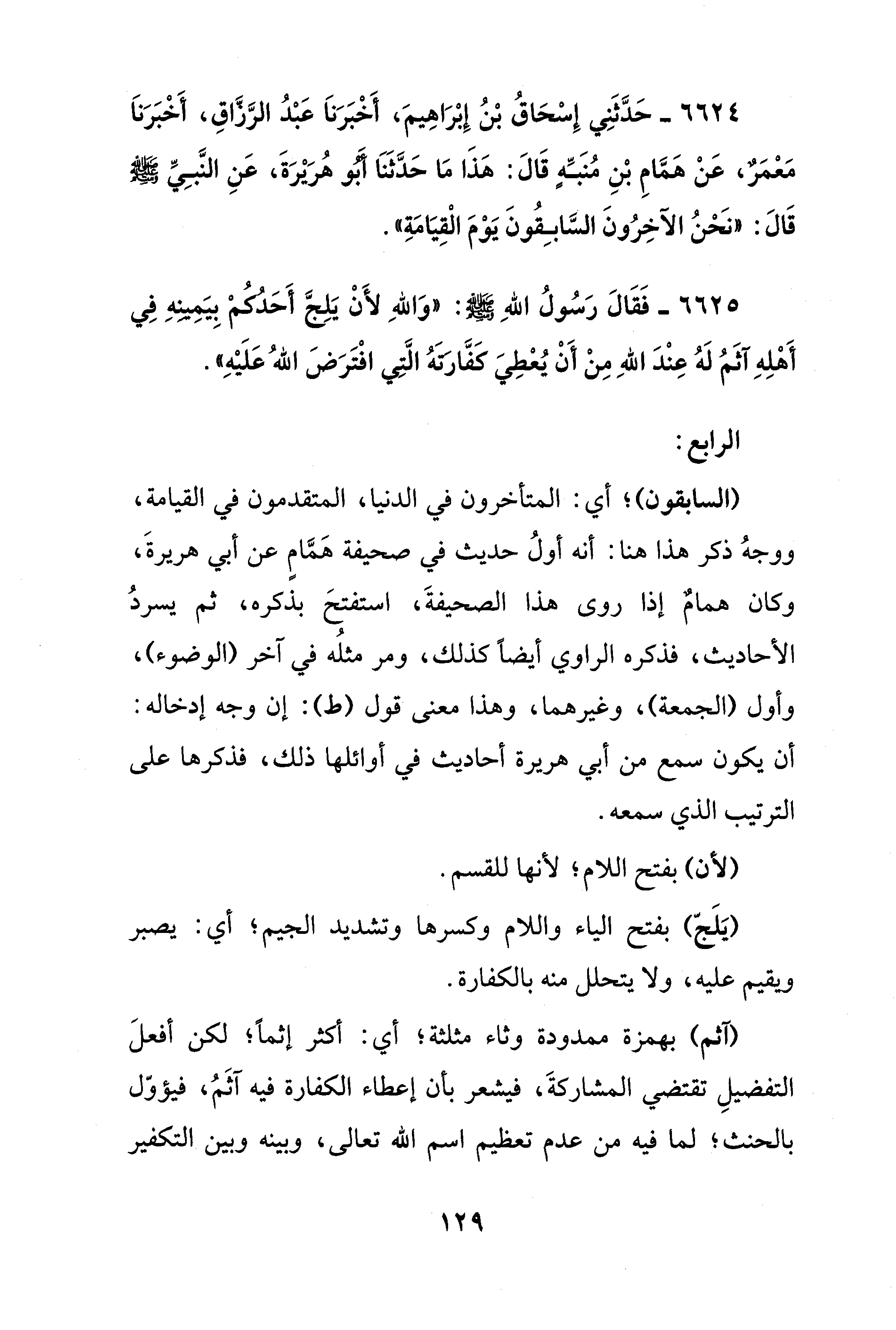 6624 - حَدَّثَنِي إِسْحَاقُ بْنُ إِبْراهِيمَ، أَخْبَرَنَا عَبْدُ الرَّزَاقِ، أَخْبَرَنَا مَعْمَرٌ، عَنْ همَّامِ بْنِ مُنَبِّهٍ قَالَ: هذَا مَا حَدَّثَنَا أبو هُرَيرَةَ، عَنِ النَّبِيِّ - صلى الله عليه وسلم - قَالَ: "نحْنُ الآخِرُونَ السَّابِقُونَ يَوْمَ الْقِيَامَةِ".