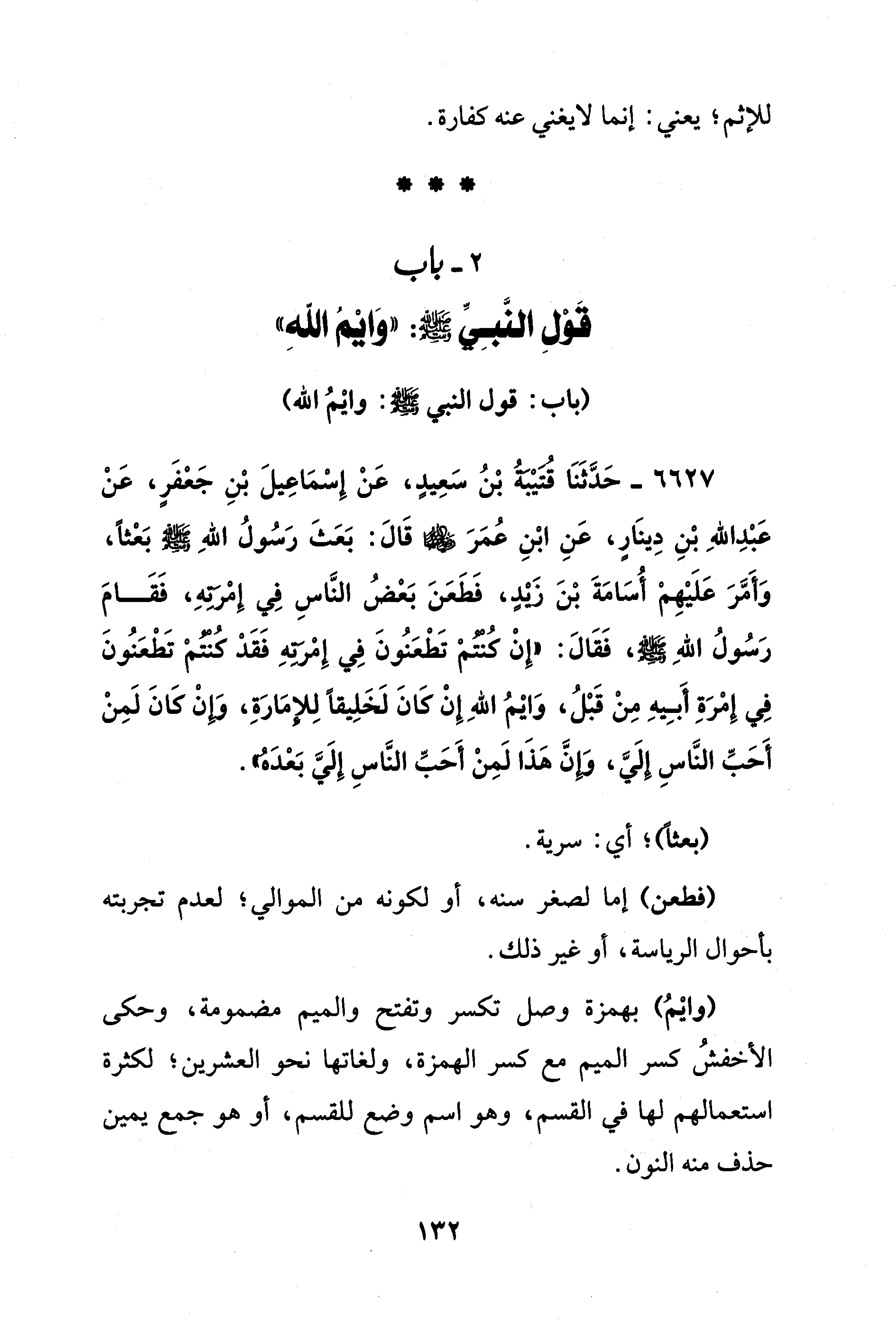 6627 - حَدَّثَنَا قُتَيْبَةُ بْنُ سَعِيدٍ، عَنْ إِسْمَاعِيلَ بْنِ جَعْفَرٍ، عَنْ عَبْدِ اللهِ بْنِ دِينَارٍ، عَنِ ابْنِ عُمَرَ - رضي الله عنهما - قَالَ: بَعَثَ رَسُولُ اللهِ - صلى الله عليه وسلم - بَعْثًا، وَأَمَّرَ عَلَيْهم أُسَامَةَ بْنَ زَيْدٍ، فَطَعَنَ بَعضُ الناسِ فِي إِمرتهِ، فَقَامَ رَسُولُ اللهِ - صلى الله عليه وسلم -، فَقَالَ: "إِنْ كُنتم تَطْعَنُونَ فِي إِمرَتهِ فَقد كُنتم تَطْعَنُونَ فِي إِمرَةِ أَبِيهِ مِنْ قَبْلُ، وَايْمُ اللهِ إِنْ كَانَ لَخَلِيقًا لِلإمَارَةِ، وَإِنْ كَانَ لَمِنْ أَحَبِّ النَّاسِ إلَيَّ، وإنَّ هذَا لَمِنْ أَحَبِّ النَّاسِ إِلَيَّ بَعدَه".