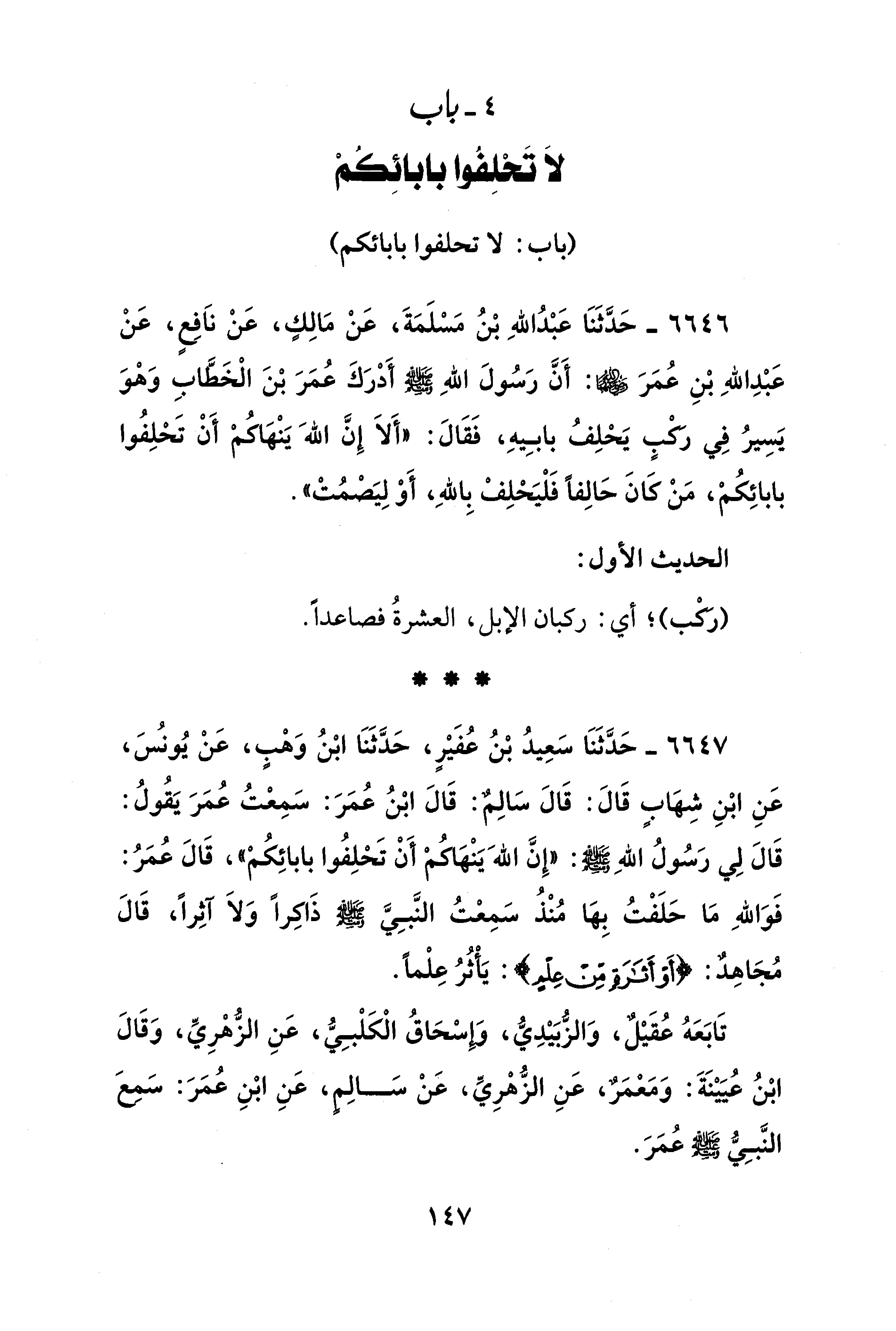 6646 - حَدَّثَنَا عَبْدُ اللهِ بْنُ مَسْلَمَةَ، عَنْ مَالِكٍ، عَنْ نَافِعٍ، عَنْ عَبْدِ اللهِ بْنِ عُمَرَ - رضي الله عنهما -: أَنَّ رَسُولَ اللهِ - صلى الله عليه وسلم - أَدرَكَ عُمَرَ بْنَ الْخَطَّابِ وَهْوَ يَسِيرُ فِي ركبٍ يَحْلِفُ بأبِيهِ، فَقَالَ: "أَلاَ إِنَّ الله يَنْهاكُم أَنْ تَحْلِفُوا بآبائِكُم، مَنْ كَانَ حَالِفًا فَلْيَحْلِفْ بِاللهِ، أَوْ لِيَصْمُتْ".