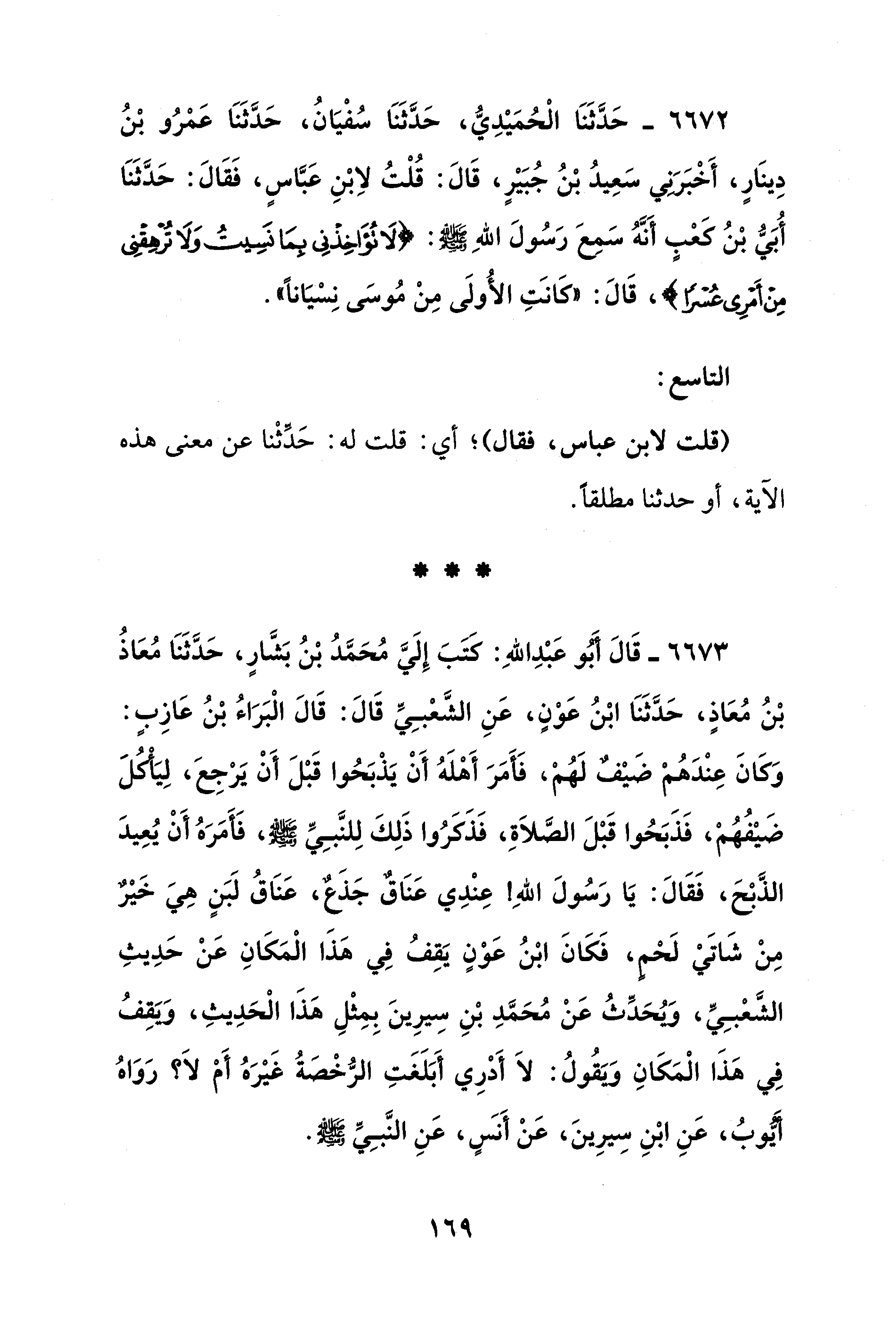 6673 - قَالَ أبو عَبْدِ اللهِ: كتبَ إِلَيَّ مُحَمَّدُ بْنُ بَشَّارٍ، حَدَّثَنَا مُعَاذُ بْنُ مُعَاذٍ، حَدَّثَنَا ابْنُ عَوْنٍ، عَنِ الشَّعْبِيِّ قَالَ: قَالَ الْبَرَاءُ بْنُ عَازِبٍ: وَكَانَ عِنْدَهُم ضَيْفٌ لَهُم، فَأَمَرَ أَهْلَهُ أَنْ يَذْبَحُوا قَبْلَ أَنْ يَرجِعَ، لِيأَكلَ ضَيْفُهُم، فَذَبَحُوا قَبْلَ الصَّلاَةِ، فَذَكَرُوا ذَلِكَ لِلنَّبِيِّ - صلى الله عليه وسلم -، فَأَمَرَهُ أَنْ يُعِيدَ الذَّبْحَ، فَقَالَ: يَا رَسُولَ الله! عِنْدِي عَنَاقٌ جَذعٌ، عَنَاقُ لَبَنٍ هِيَ خَيْرٌ مِنْ شَاتَيْ لَحْمٍ، فَكَانَ ابْنُ عَوْنٍ يَقِفُ فِي هذَا الْمَكَانِ عَنْ حَدِيثِ الشَّعبِيِّ، وَيُحَدِّثُ عَنْ مُحَمَّدِ بْنِ سِيرِينَ بِمِثْلِ هذَا الْحَدِيثِ، وَيَقِفُ فِي هذَا الْمَكَانِ وَيَقُولُ: لَا أَدرِي أَبَلَغَتِ الرُّخْصَةُ غَيْرَهُ أَمْ لَا؟ رَوَاهُ أيُّوبُ، عَنِ ابْنِ سِيرِينَ، عَنْ أَنسٍ، عَنِ النَّبِيِّ - صلى الله عليه وسلم -.