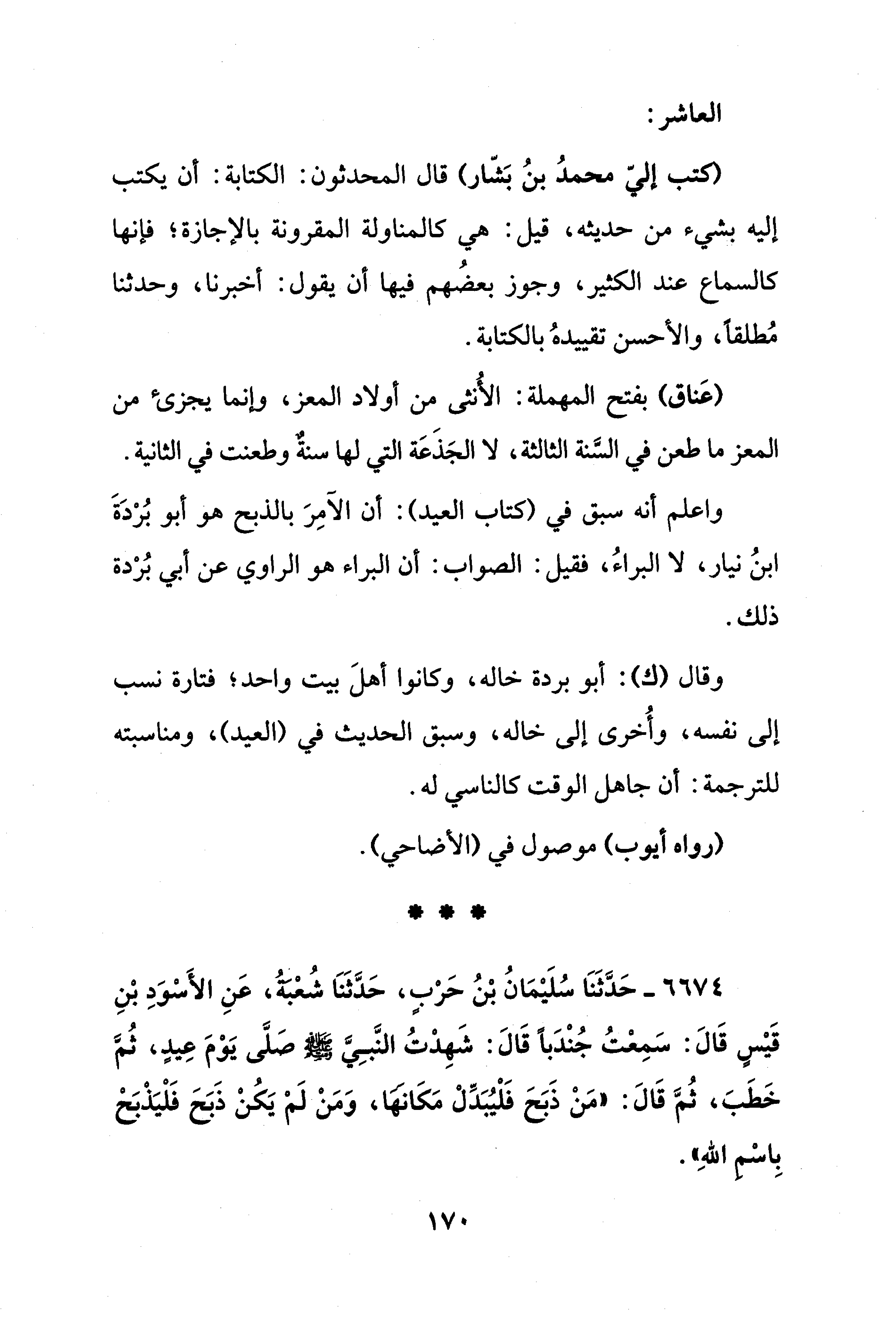(كتب إليّ محمدُ بنُ بَشّار) قال المحدثون: الكتابة: أن يكتب إليه بشيء من حديثه، قيل: هي كالمناولة المقرونة بالإجازة؛ فإنها كالسماع عند الكثير، وجوز بعضُهم فيها أن يقول: أخبرنا، وحدثنا مُطلقًا، والأحسن تقييدهُ بالكتابة.