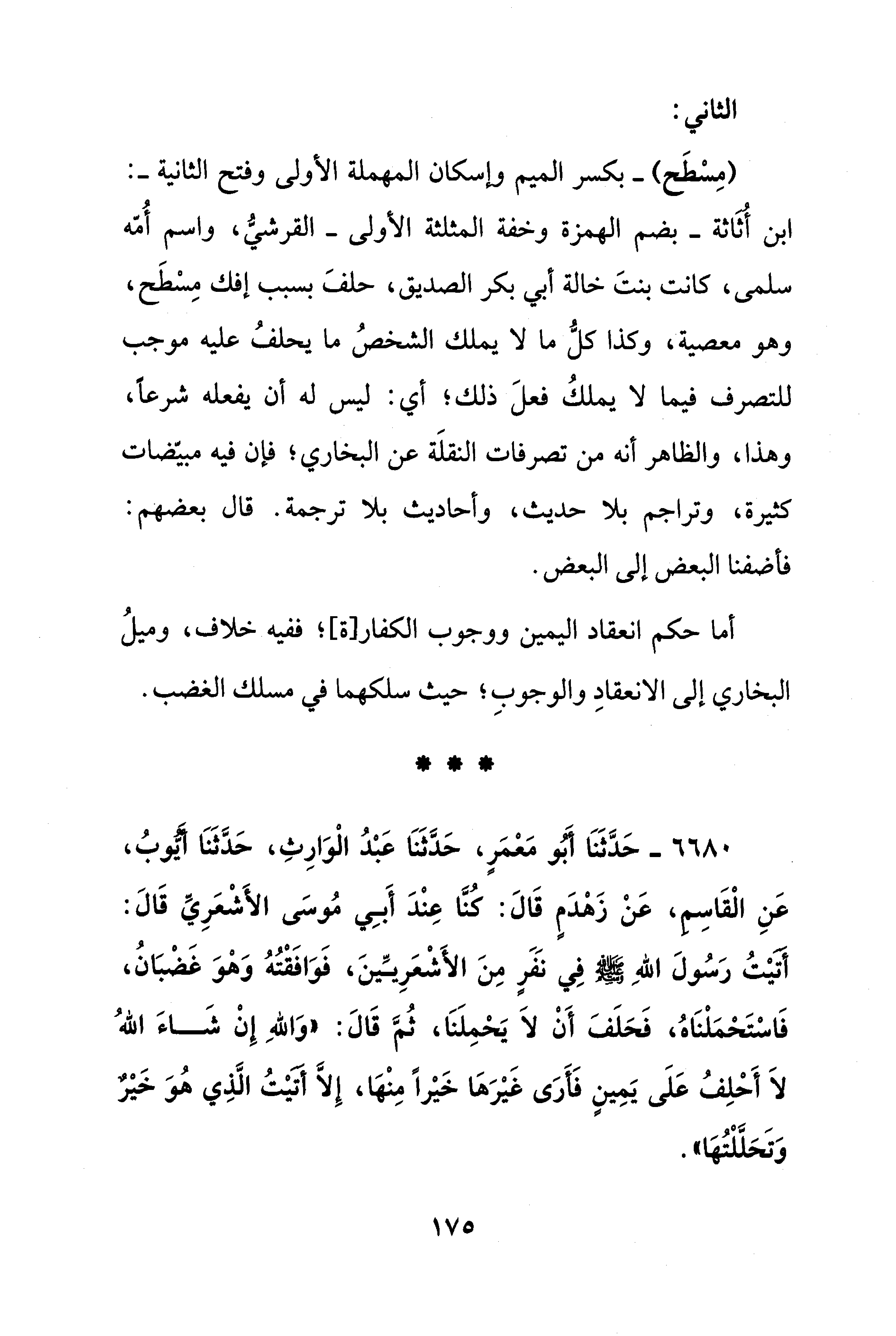 (مِسْطَح) -بكسر الميم وإسكان المهملة الأولى وفتح الثانية-: ابن أُثَاثة -بضم الهمزة وخفة المثلثة الأولى- القرشيُّ، واسم أُمّه سلمى، كانت بنتَ خالة أبي بكر الصديق، حلفَ بسبب إفك مِسْطَح، وهو معصية، وكذا كلُّ ما لا يملك الشخصُ ما يحلفُ عليه موجب للتصرف فيما لا يملكُ فعلَ ذلك؛ أي: ليس له أن يفعله شرعًا، وهذا، والظاهر أنه من تصرفات النقلَة عن البخاري؛ فإن فيه مبيّضات كثيرة، وتراجم بلا حديث، وأحاديث بلا ترجمة. قال بعضهم: فأضفنا البعض إلى البعض.
