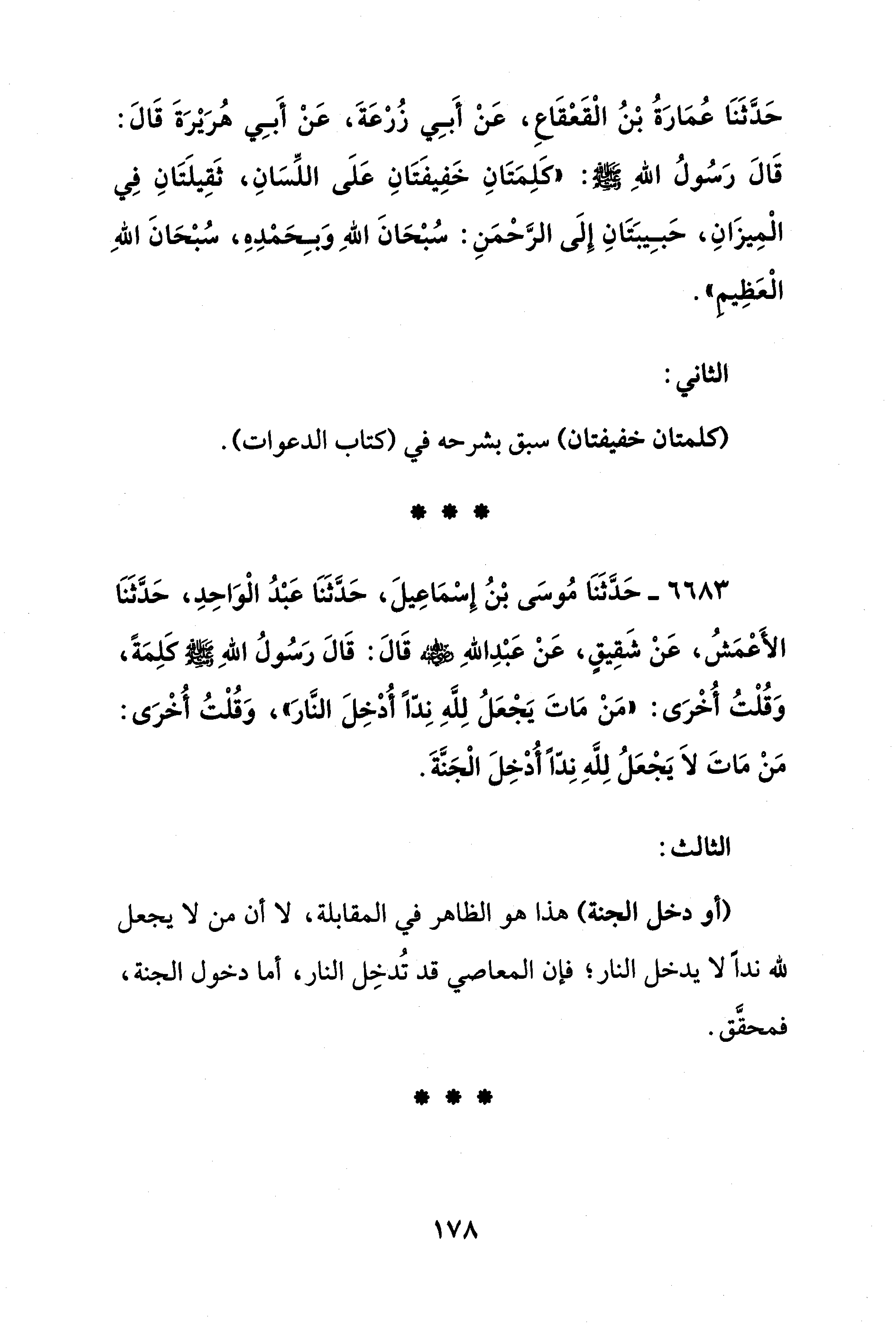 حَدَّثَنَا عُمَارَةُ بْنُ الْقَعْقَاعِ، عَنْ أَبِي زُرْعَةَ، عَنْ أَبِي هُرَيْرَةَ قَالَ: قَالَ رَسُولُ اللهِ - صلى الله عليه وسلم -: "كلِمَتَانِ خَفِيفَتَانِ عَلَى اللِّسَانِ، ثَقِيلَتَانِ فِي الْمِيزَانِ، حَبِيبَتَانِ إِلَى الرَّحمَنِ: سُبْحَانَ اللهِ وَبِحَمدِهِ، سبْحَانَ اللهِ الْعَظِيم".