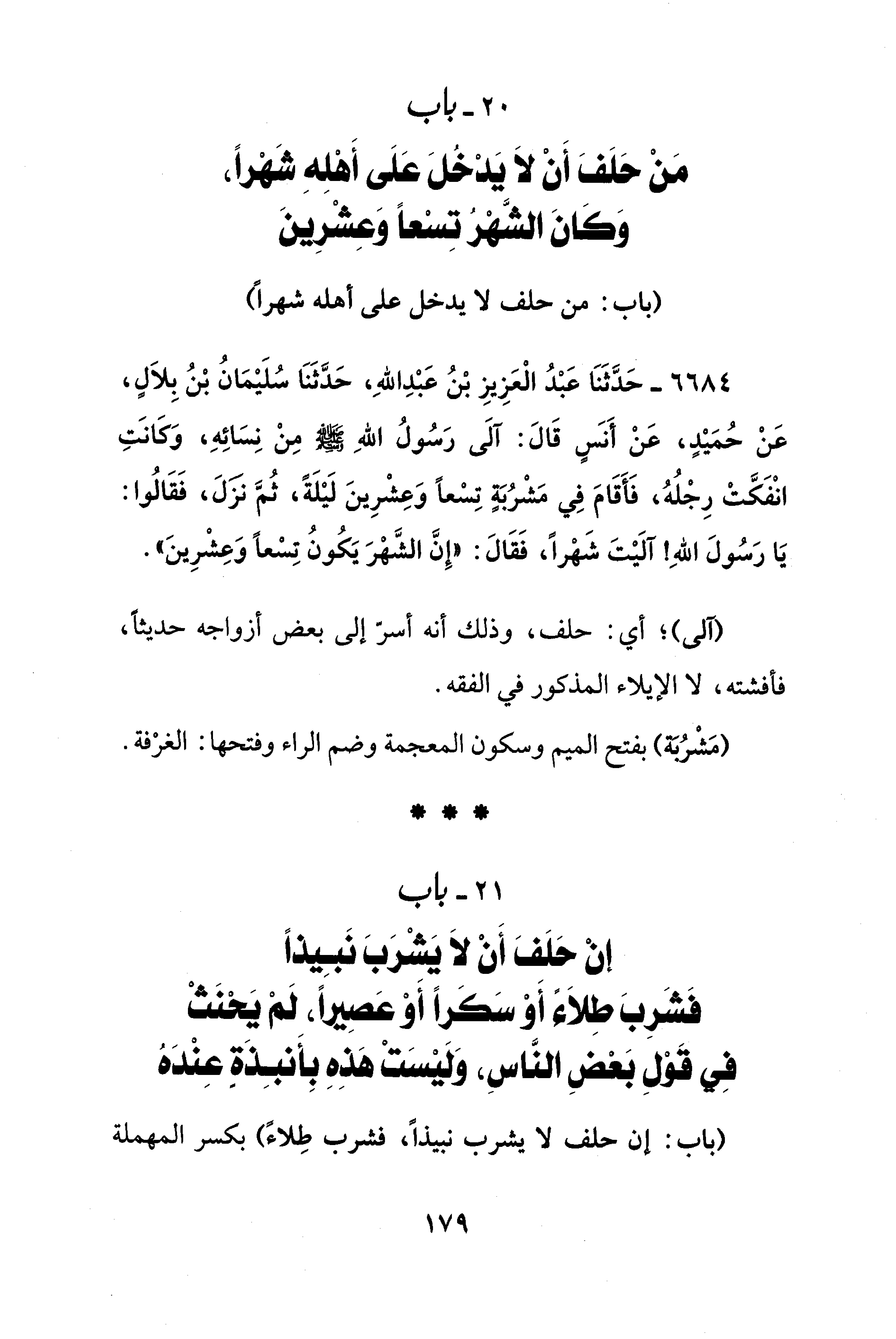 6684 - حَدَّثَنَا عَبْدُ الْعَزِيزِ بْنُ عَبْدِ اللهِ، حَدَّثَنَا سُلَيْمَانُ بْنُ بِلاَلٍ، عَنْ حُمَيْدٍ، عَنْ أَنَسٍ قَالَ: آلَى رَسُولُ اللهِ - صلى الله عليه وسلم - مِنْ نِسَائِهِ، وَكَانَتِ انْفَكَّتْ رِجْلُهُ، فأَقَامَ فِي مَشْرُبَةٍ تِسْعًا وَعِشْرِينَ لَيْلَةً، ثُمَّ نزَلَ، فَقَالُوا: يَا رَسُولَ اللهِ! آلَيْتَ شَهْرًا، فَقَالَ: "إِنَّ الشَّهْرَ يَكُونُ تِسْعًا وَعِشْرِينَ".