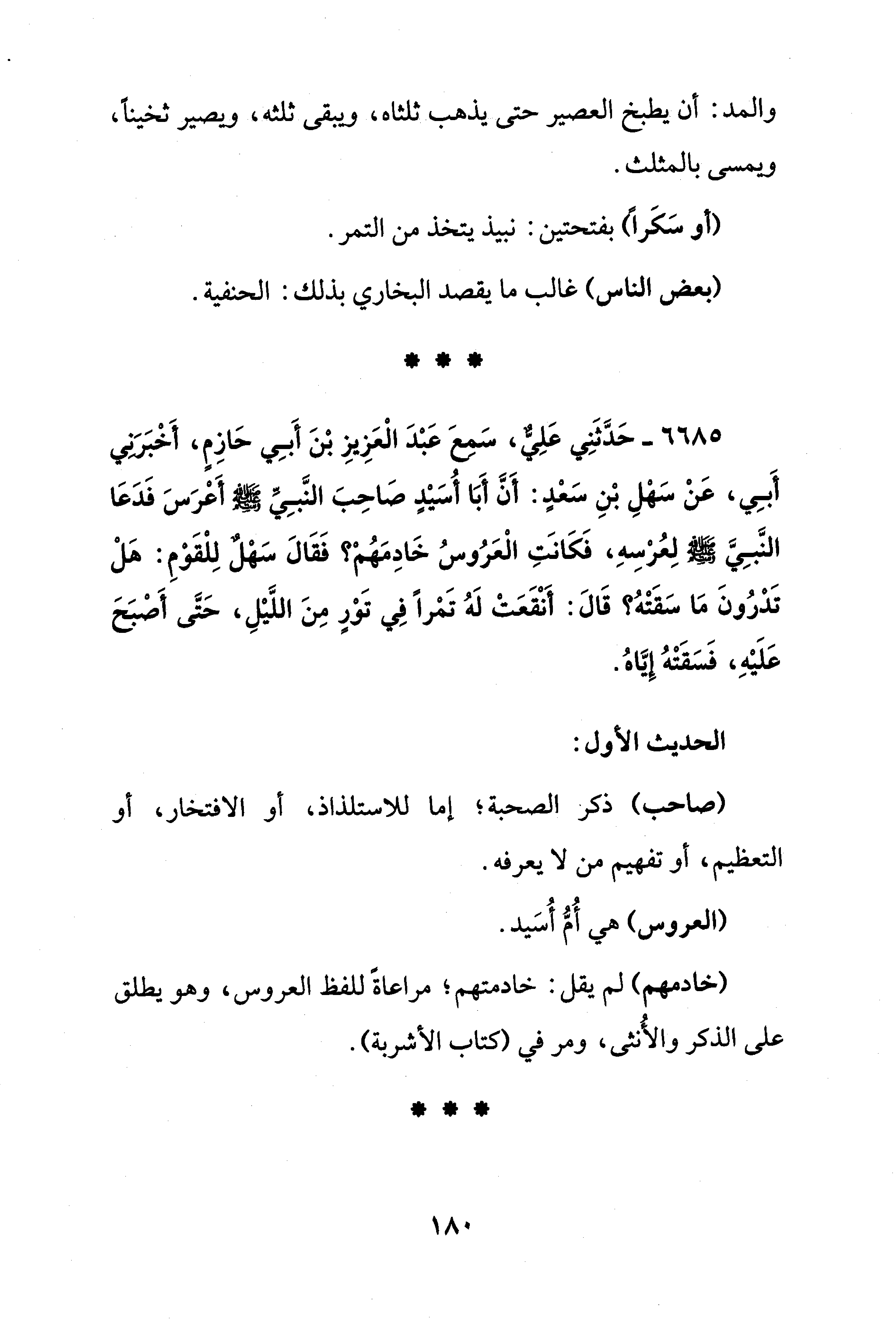 6685 - حَدَّثَنِي عَلِيٌّ، سَمِعَ عَبْدَ الْعَزِيزِ بْنَ أَبِي حَازِمٍ، أَخْبَرني أَبِي، عَنْ سَهْلِ بْنِ سَعدٍ: أَنَّ أَبَا أُسَيْدٍ صَاحِبَ النَّبِي - صلى الله عليه وسلم - أَغرَسَ فَدَعَا النَّبِيَّ - صلى الله عليه وسلم - لِعُرسِهِ، فَكَانَتِ الْعَرُوسُ خَادِمَهُم؟ فَقَالَ سَهْلٌ لِلْقَوْمِ: هلْ تَدرُونَ مَا سَقَتْهُ؟ قَالَ: أَنْقَعَتْ لَهُ تَمرًا فِي تَوْرٍ مِنَ اللَّيْلِ، حَتَّى أَصبَحَ عَلَيْهِ، فَسَقَتْهُ إِيَّاهُ.