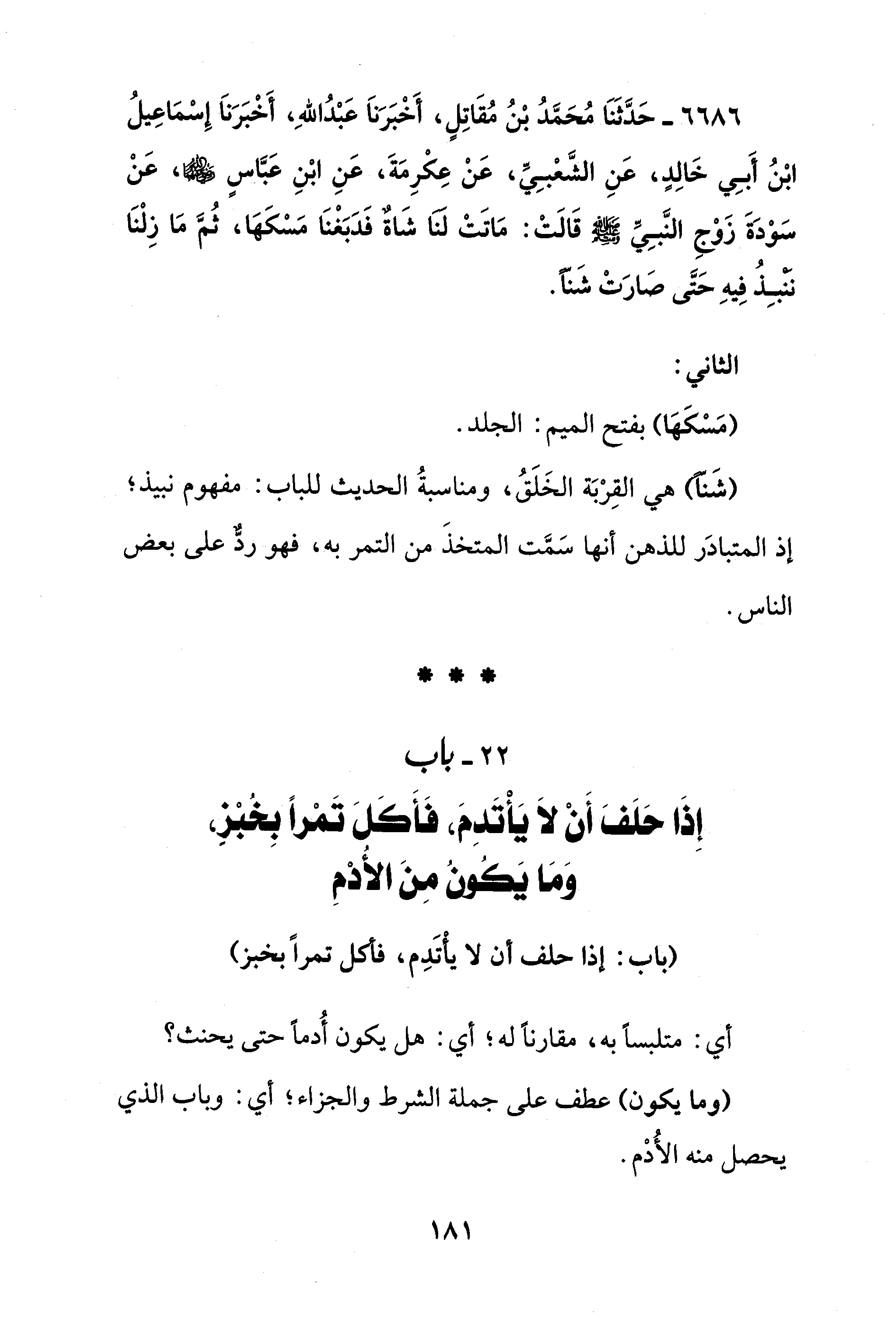 6686 - حَدَّثَنَا مُحَمَّدُ بْنُ مُقَاتِلٍ، أَخْبَرَنَا عَبْدُ اللهِ، أَخْبَرَنَا إِسْمَاعِيلُ بْنُ أَبِي خَالِدٍ، عَنِ الشَّعبِيِّ، عَنْ عِكْرِمَةَ، عَنِ ابْنِ عَبَّاس - رضي الله عنهما -، عَنْ سَوْدَةَ زَوْجِ النَّبِيِّ - صلى الله عليه وسلم - قَالَتْ: مَاتَتْ لنا شَاةٌ فَدَبَغْنَا مَسْكَها، ثُمَّ مَا زِلْنَا نَنْبِذُ فِيهِ حَتَّى صَارَتْ شَنًّا.